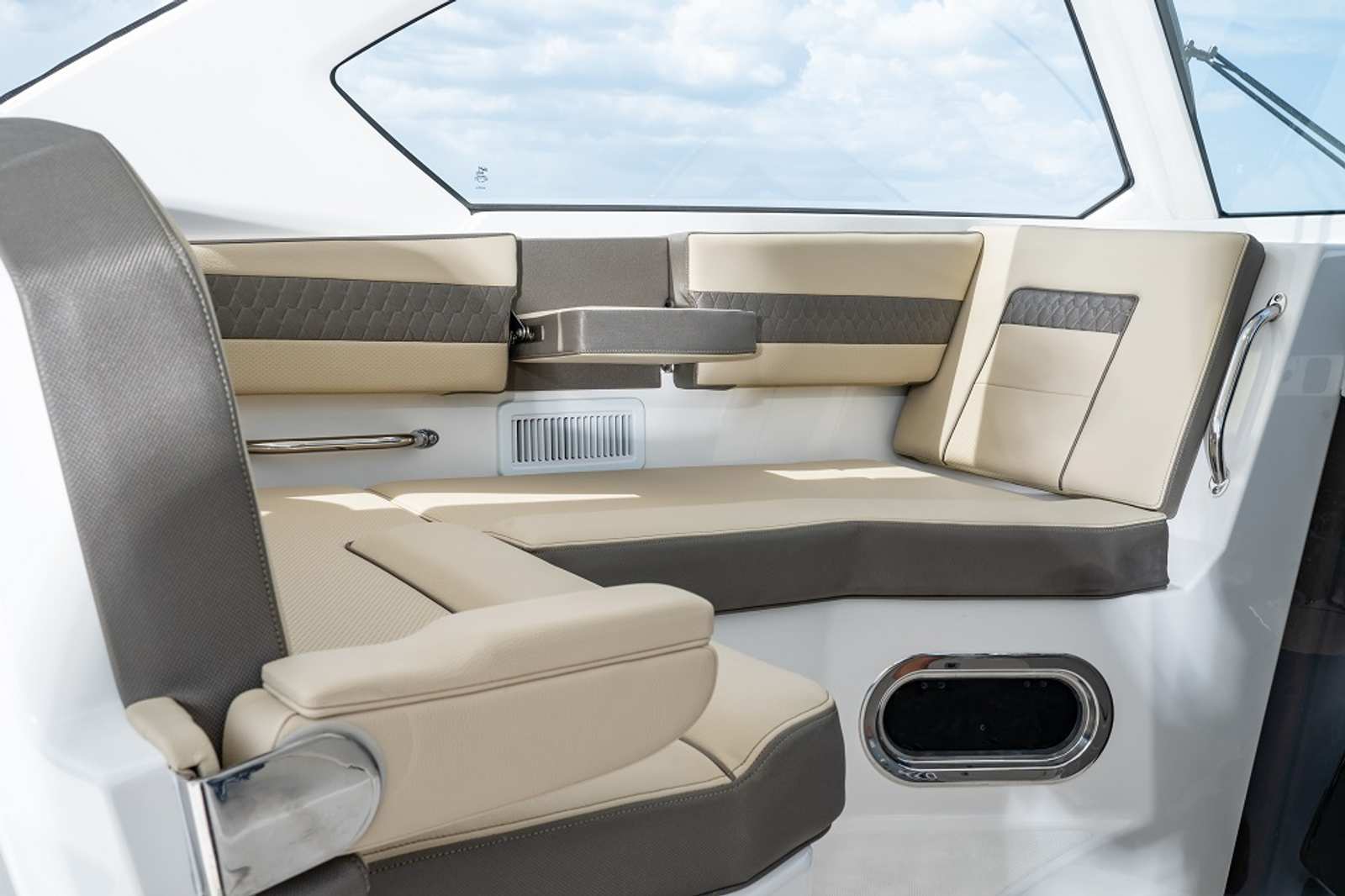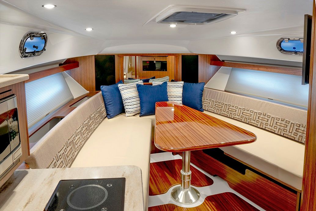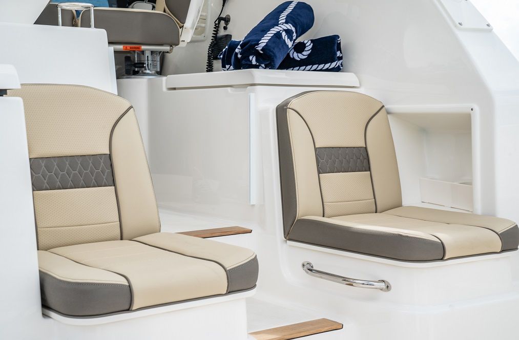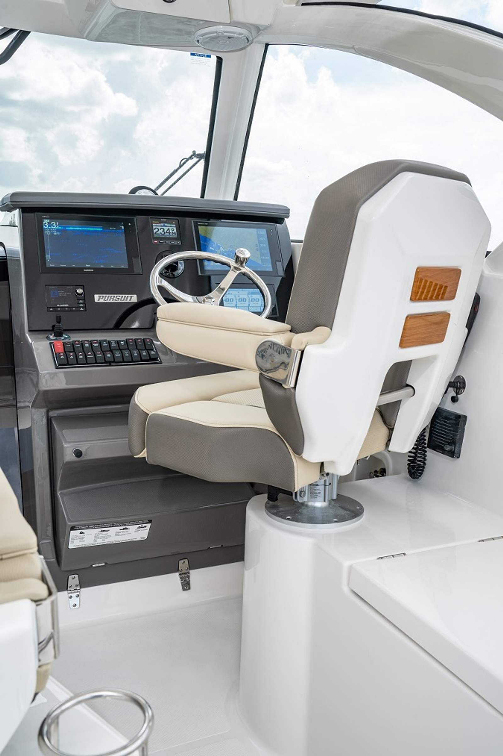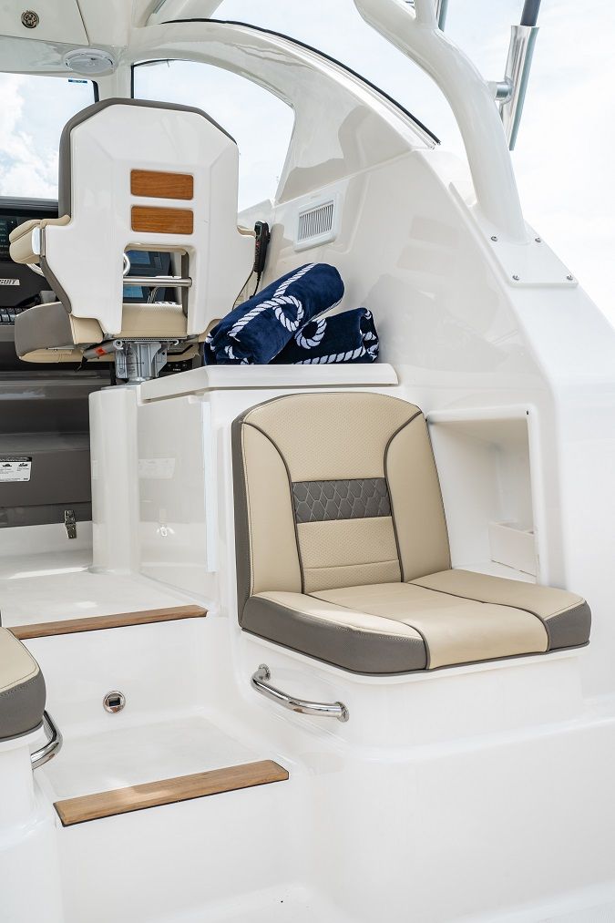 The 2026 Pursuit OS 355 is loaded with special features that set it apart from other cruiser boats for sale. The triple Yamaha F350 engines are a testament to its power and reliability, while the fresh white hull and platinum bootstripe ensure you turn heads at every marina. The carbon helm and footrest offer both style and comfort, creating an ergonomic command center for the captain. Inside, the Coastal Sunrise interior provides a relaxing retreat, perfect for unwinding after a day on the water.For those who value comfort in all seasons, the cockpit air conditioning with reverse cycle heat ensures a pleasant environment, whether you are escaping the summer sun or enjoying a crisp autumn evening. The ACR RCL-100 LED spotlight, complete with remote control at the helm, enhances safety and convenience during nighttime navigation. Underwater LED lights (Sea Blaze X2 Spectrum) add a touch of elegance and excitement, illuminating the water around your boat for evening gatherings or late-night swims.The folding gunwale seat on the starboard side maximizes seating and flexibility in the cockpit, while the forward deck sunpad invites you to soak up the sun in style. Every detail of the OS 355 is designed to enhance your boating experience, from the spacious layout to the premium finishes.