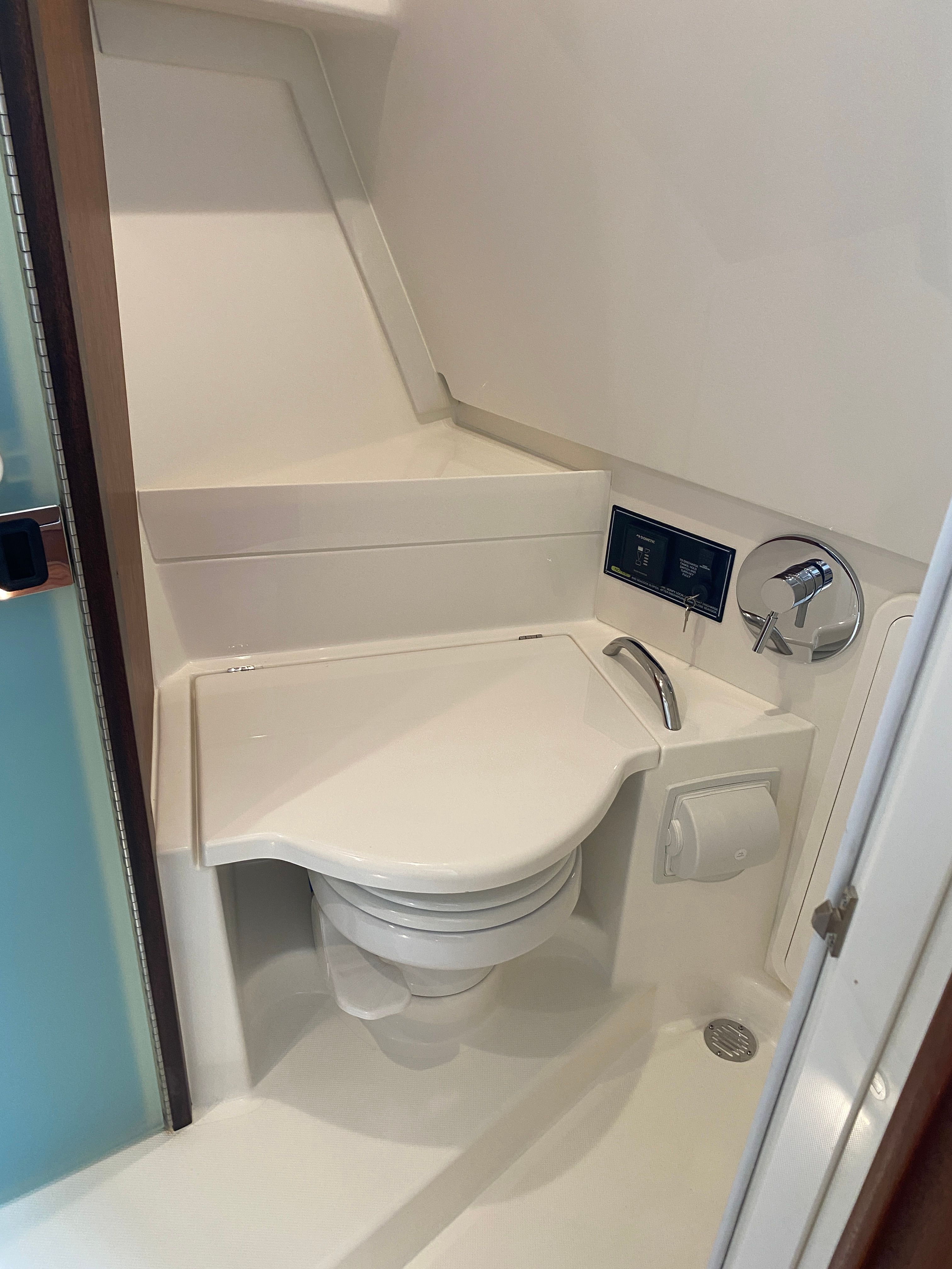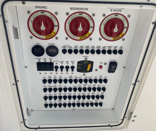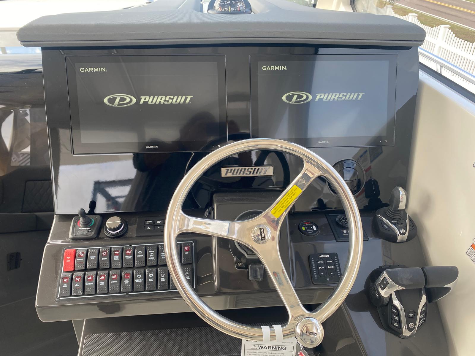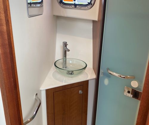 Step aboard the Pursuit OS 355 and discover a world of thoughtful features designed to elevate your boating experience. The Fresh White hull and Platinum bootstripe not only enhance the boat’s visual appeal but also reflect Pursuit’s attention to detail. The Carbon helm provides a sleek, modern command center, while the Tranquil Sea interior fabric offers a soothing environment for relaxation.Enjoy the convenience of a Bridgedeck Teak Table with dedicated storage, perfect for alfresco dining or socializing with friends and family. The cockpit is equipped with air conditioning and reverse cycle heat (16,000 BTU, 240V/60Hz), ensuring comfort in any climate. A custom hardtop with an integrated stainless steel electric retractable Makefast sunshade offers one-touch operation, allowing you to easily adjust your exposure to the sun. The fiberglass cockpit table, also with dedicated storage, adds versatility to your entertaining options. For enhanced safety and visibility, the OS 355 features an ACR RCL-100 LED spotlight with remote control at the helm, providing peace of mind during nighttime navigation.