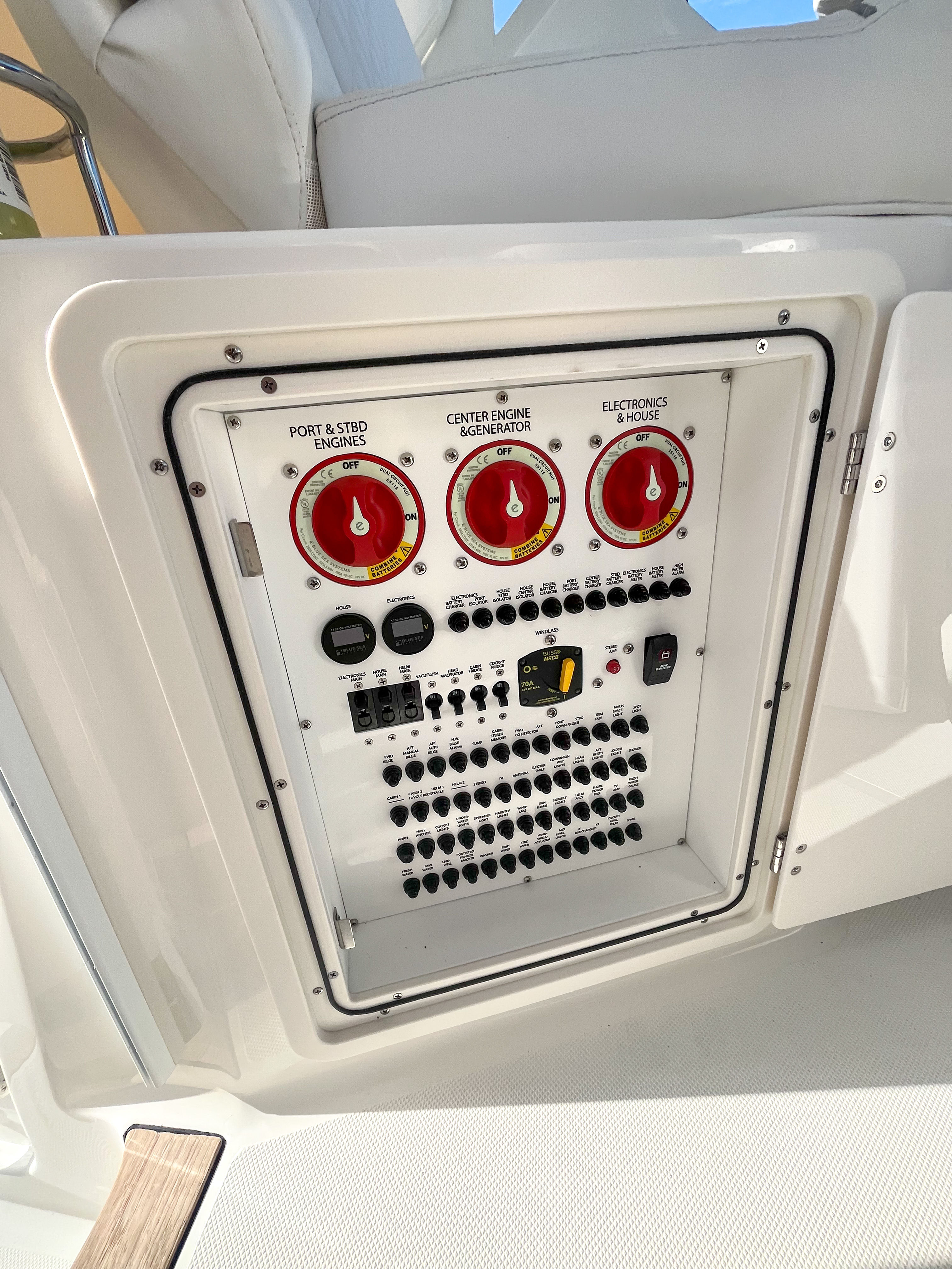 Power and precision come standard on the Pursuit OS 355. Equipped with three high-performance engines delivering a combined 1,050 horsepower, this cruiser boat for sale is built to impress. The triple-engine setup ensures smooth acceleration, responsive handling, and the ability to tackle a variety of water conditions with ease. Whether you’re cruising along the coastline or heading out for offshore adventures, the Pursuit OS 355 offers exhilarating speed and reliable performance. The advanced helm, featuring a carbon finish, puts you in complete control, allowing for effortless navigation and maneuverability.