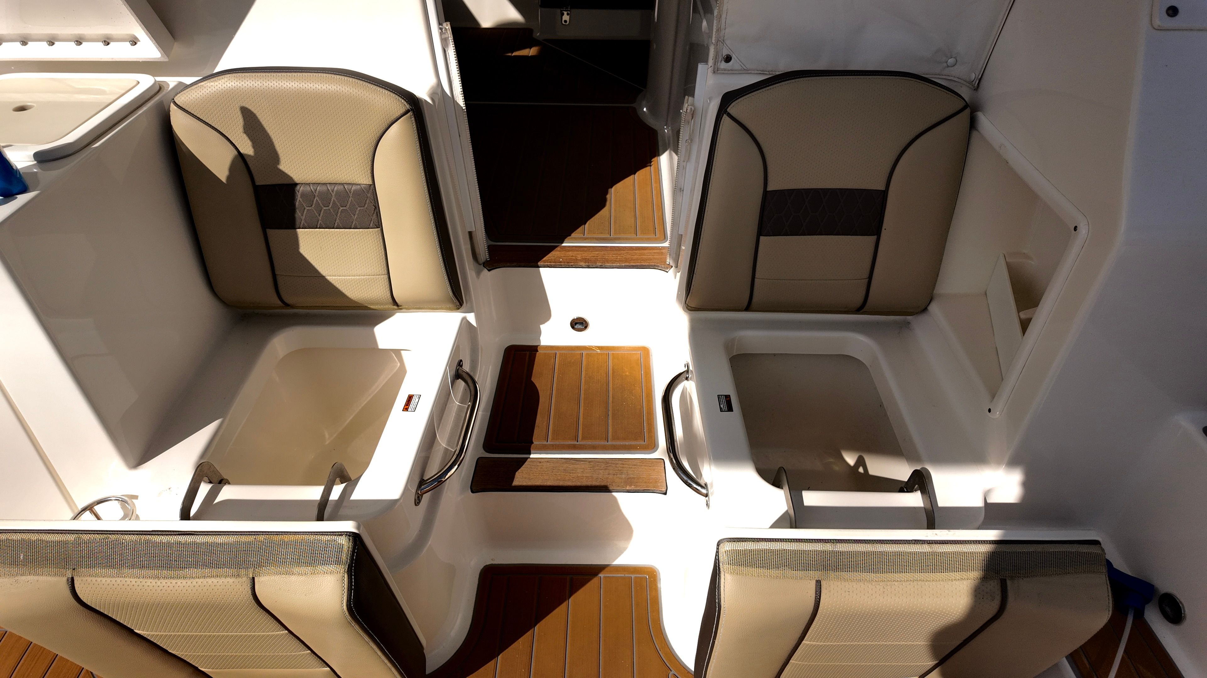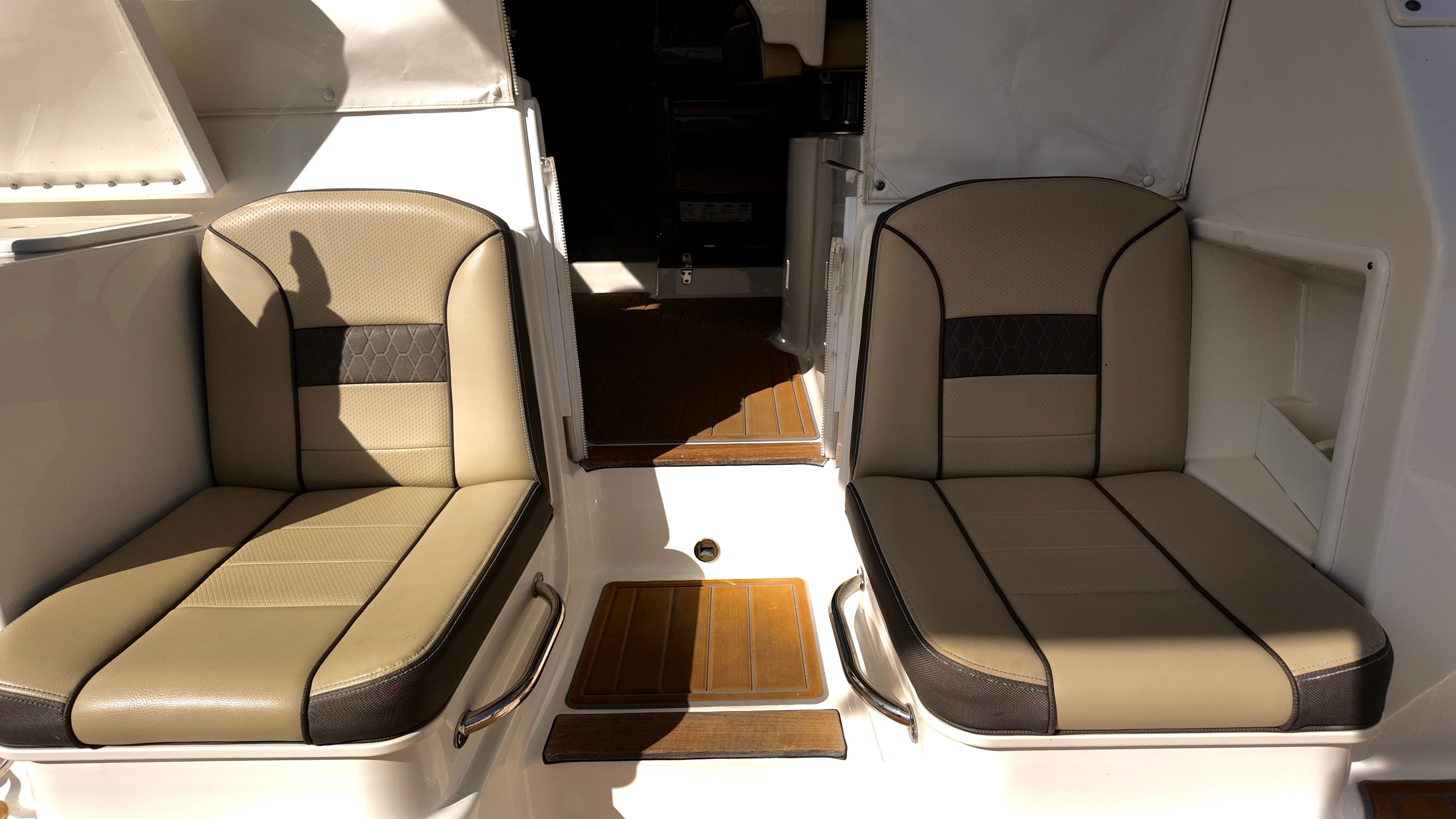 • Fold-away transom seat, port lounge seat, aft-facing mezzanine seat