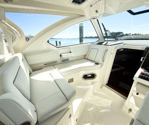 The Pursuit OS 355 is designed with practicality in mind, making ownership both easy and enjoyable. The Yamaha Joystick Control and Helm Master EX system simplify docking and maneuvering, allowing you to navigate marinas and tight slips with confidence. The manual engine flushing system streamlines maintenance, helping you protect your investment and maximize engine longevity. Ample storage throughout the boat means you can bring along everything you need for a day on the water or an extended cruise. The electric retractable sunshade and climate-controlled cockpit ensure comfort in any weather, while the forward deck sunpad offers a perfect spot for sunbathing or relaxing with a book.
