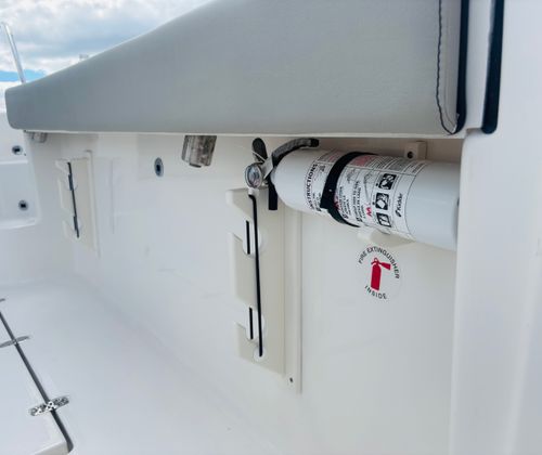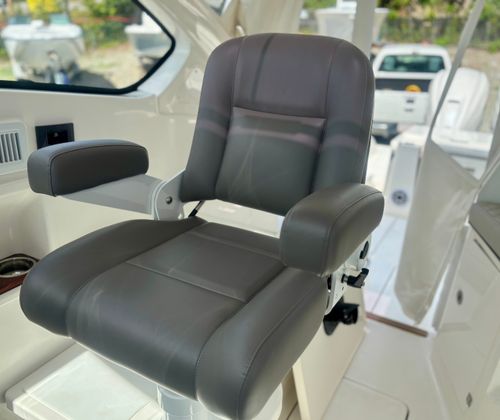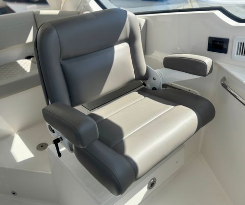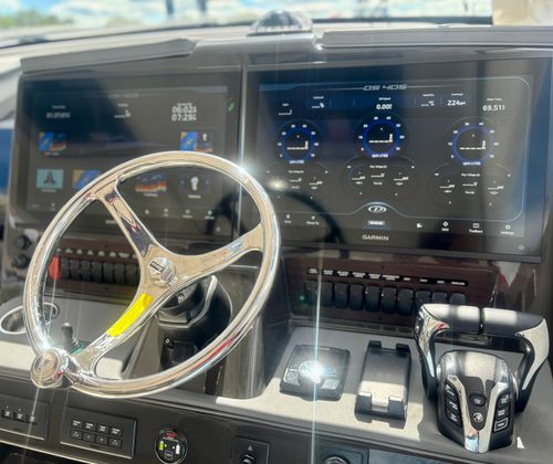 The Pursuit OS 405 is loaded with premium features that elevate your boating experience. The custom hardtop boasts an integrated electric retractable Makefast sunshade with one-touch operation, allowing you to effortlessly adjust your shade and comfort level. White Stamoid upgrades on the side curtains, sunpad cover, and drop curtain add a touch of elegance and durability, ensuring protection from the elements while maintaining a sophisticated look.Stay informed and entertained with the SiriusXM® receiver for weather updates, and enjoy seamless navigation with the Garmin 2nd widescreen 22" display (STD) and multifunction display interface. The manual engine flushing system simplifies maintenance, while the exterior upholstery in Sea Salt and the bold black bootstripe enhance the boat’s visual appeal. Every detail of the Pursuit OS 405 has been thoughtfully designed to maximize convenience, style, and functionality.