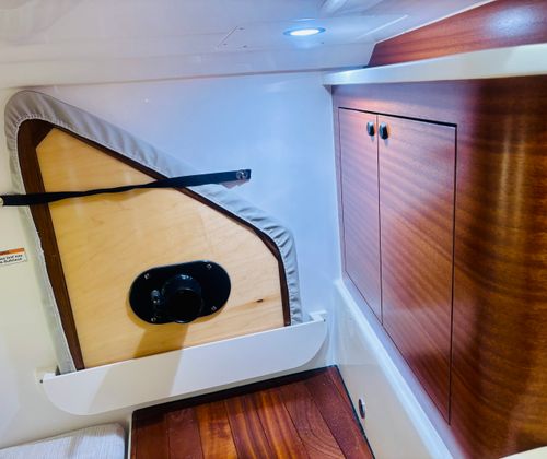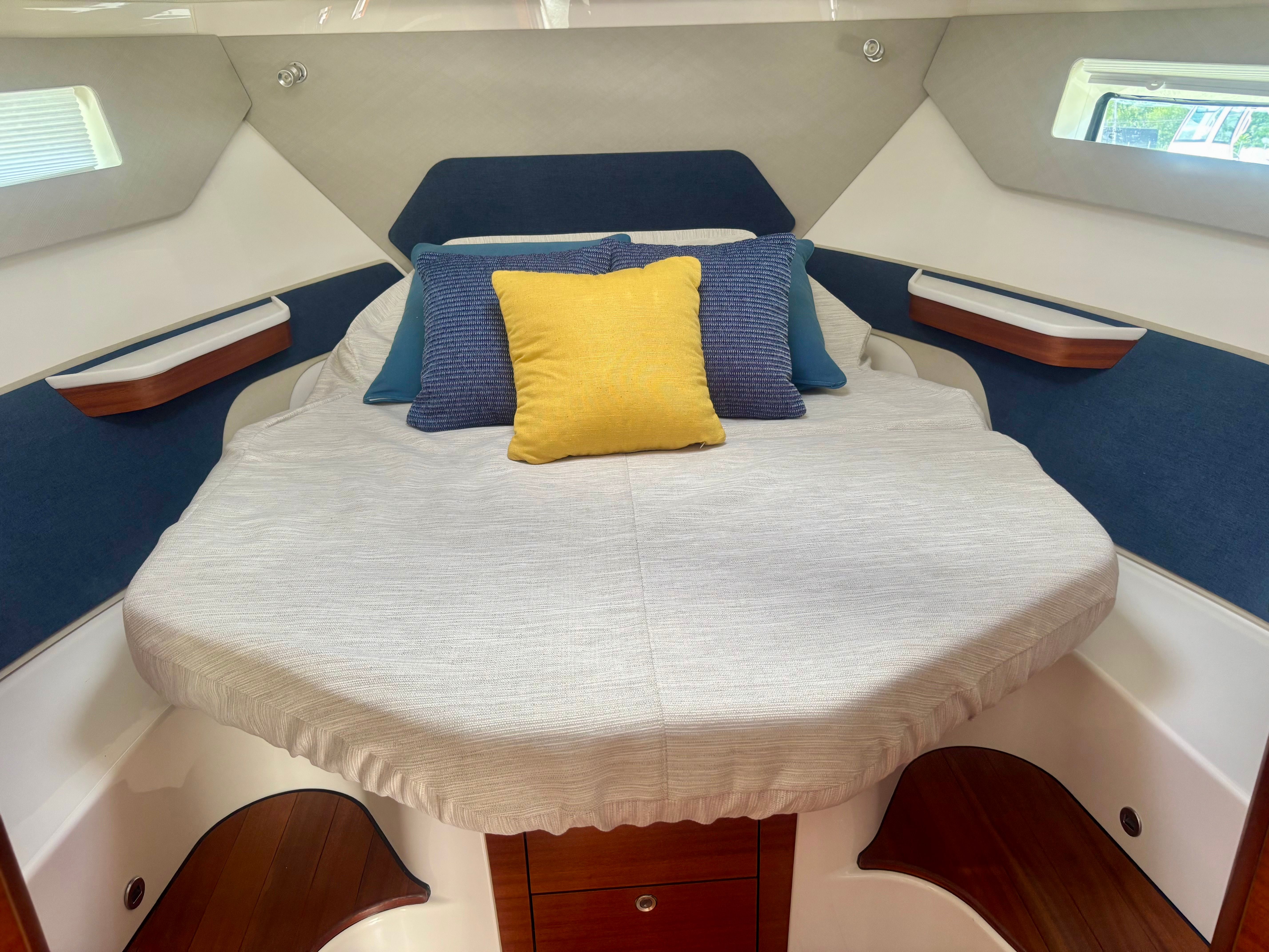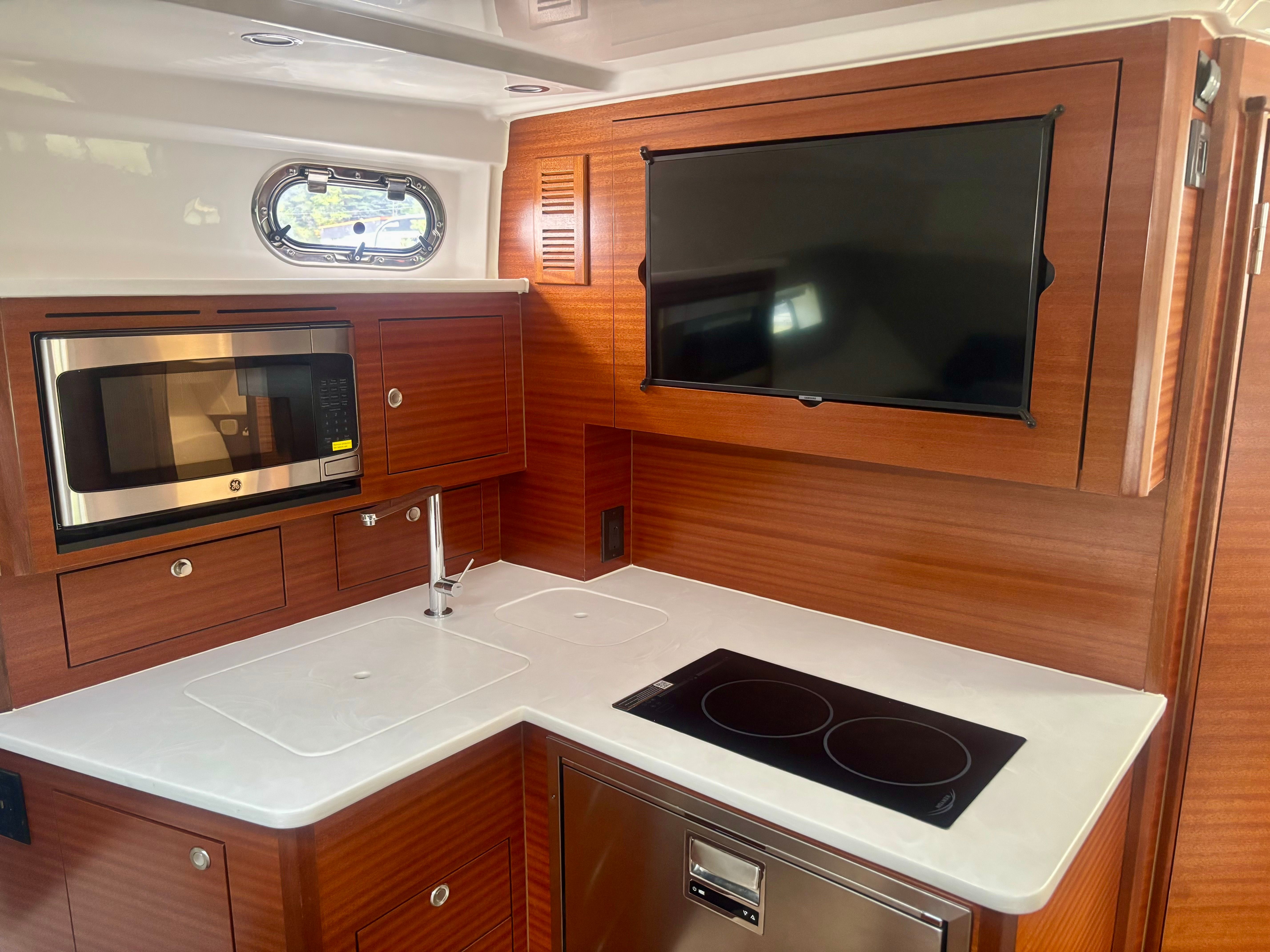 The Pursuit OS 405 excels in practicality, making ownership a breeze. The generous storage options ensure you have plenty of space for gear, supplies, and personal items, keeping the deck clutter-free and organized. The manual engine flushing system streamlines maintenance, helping you preserve the longevity and performance of your engines with minimal effort.Fuel efficiency and ease of docking are enhanced by the integrated electric steering and joystick controls, allowing you to navigate tight spaces and conserve fuel during longer journeys. The durable exterior upholstery and upgraded curtains provide protection from the sun and weather, ensuring your investment remains in pristine condition for years to come. Whether you’re planning a quick day trip or an extended voyage, the Pursuit OS 405 is equipped to handle all your boating needs.