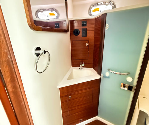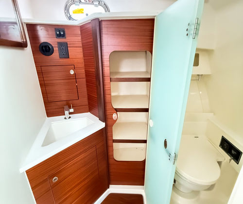 Beyond its impressive performance and luxurious amenities, the Pursuit OS 405 is designed with practicality in mind. The hardtop-mounted rod holders make it easy to transition from cruising to fishing, while the advanced navigation and safety features ensure you can explore new waters with confidence. The aft curtain upgrade offers protection from wind and spray, making it easier to enjoy your time on the water in varying conditions.Docking and maneuvering are simplified by the vessel’s responsive handling and triple-engine setup, allowing for precise control in tight spaces. The OS 405’s efficient design also means you can spend more time enjoying the water and less time worrying about maintenance or fuel consumption. Ample storage throughout the boat ensures that all your gear, supplies, and personal items are organized and easily accessible, making every outing smooth and stress-free.