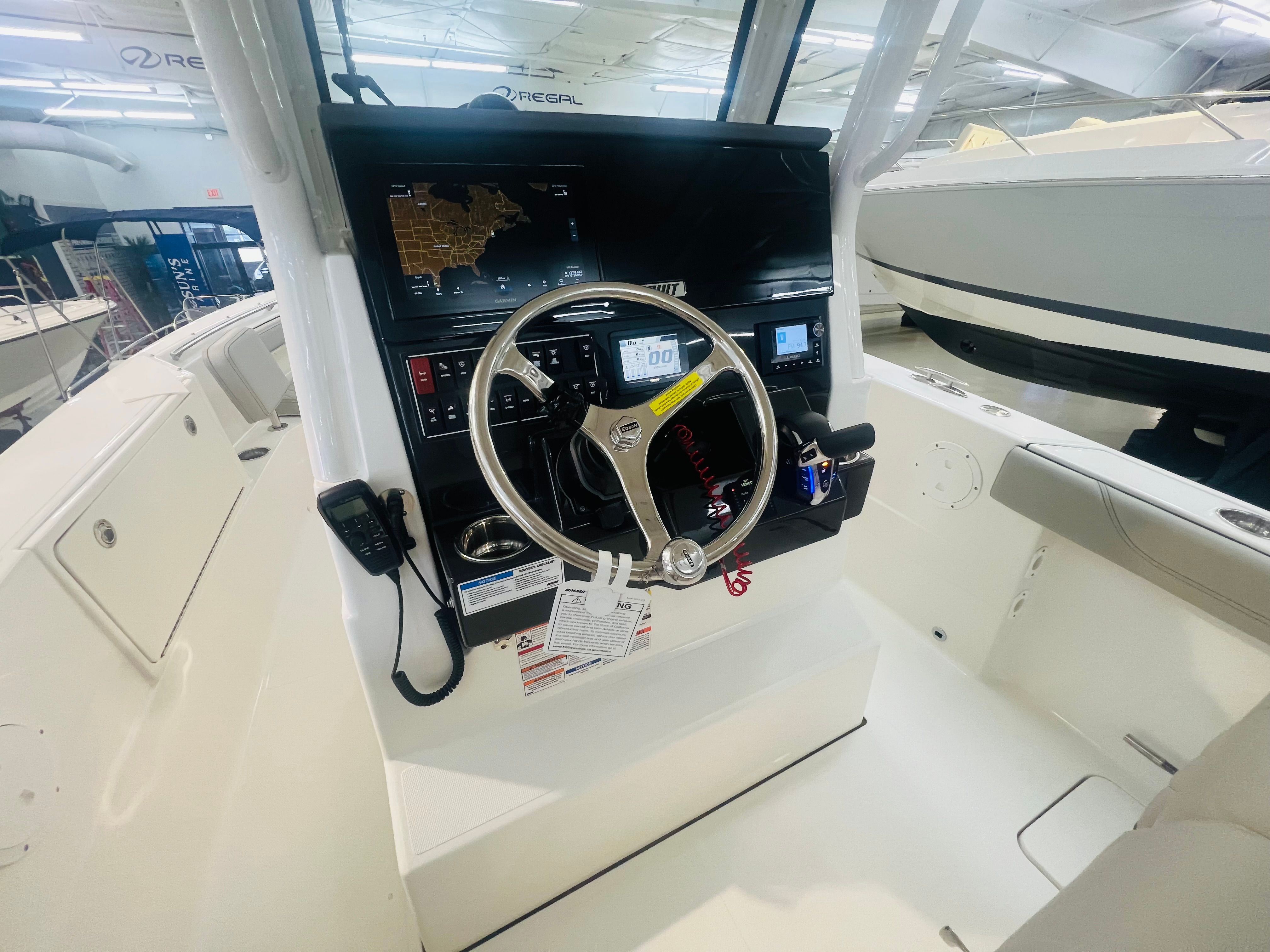 - Premium Helm Seating w/Four (4) Folding Armrests, Articulating Flip-up Bolsters, Upgraded Seat Slide with Fore/Aft Adjustments, and Edson 316L SS Steering Wheel with Control Knob and Non-Slip Grip