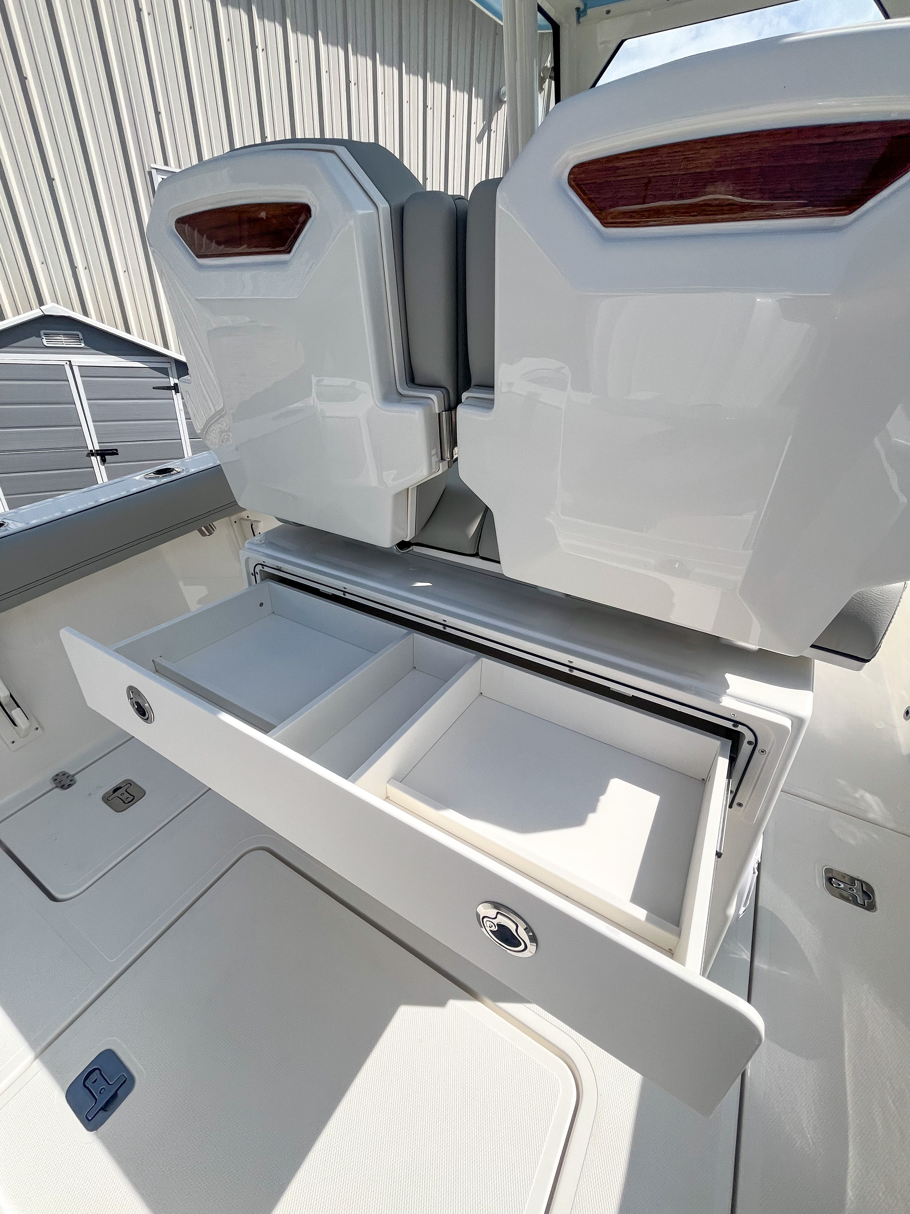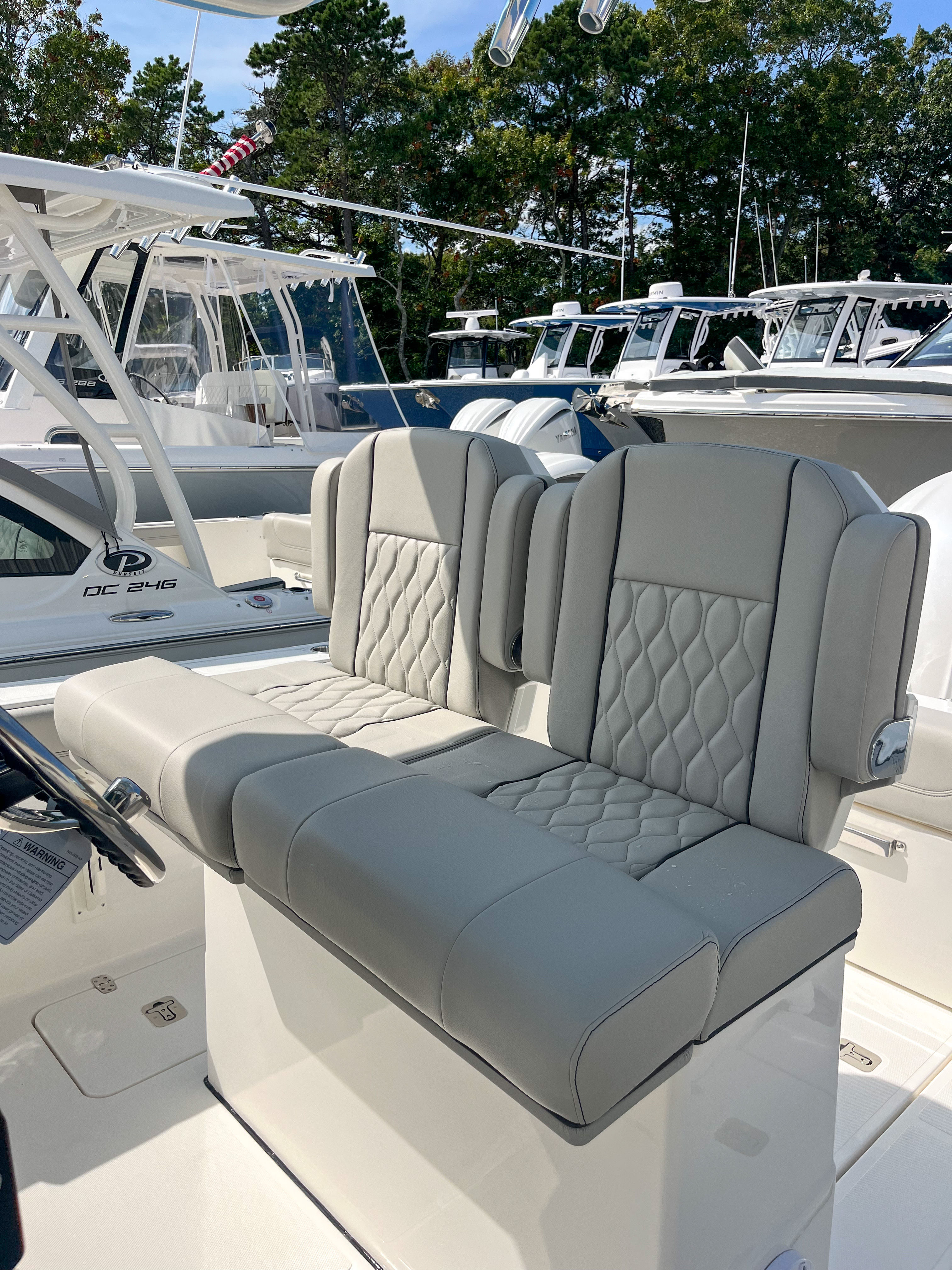 The Pursuit S 248 is as practical as it is enjoyable. Its manageable size makes docking and trailering straightforward, so you can spend less time worrying about logistics and more time enjoying the water. Ample storage solutions throughout the boat keep your gear organized and out of the way, while the dedicated compartments for the bow seating filler, sun pad, and table ensure everything has its place. The efficient Yamaha F350 engine is designed for optimal fuel economy, helping you make the most of every adventure without breaking the bank.The fresh water system and cockpit shower are perfect for rinsing off after a swim or cleaning up after a day of fishing, while the electric head provides added convenience for longer outings. The LED blue accent lighting not only enhances the boat’s visual appeal but also improves visibility and safety during evening excursions.
