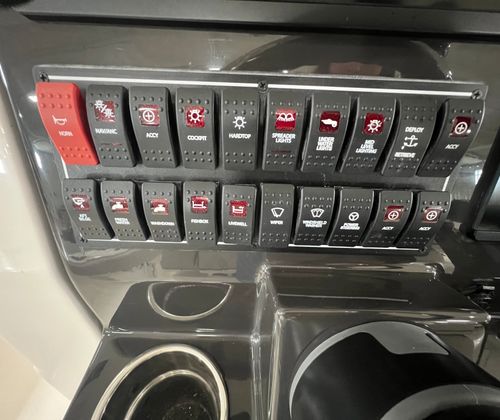 - Premium Helm Seating w/Four (4) Folding Armrests, Articulating Flip-up Bolsters, Upgraded Seat Slide with Fore/Aft Adjustments, and Edson® 316L SS Steering Wheel with Control Knob and Non-Slip Grip