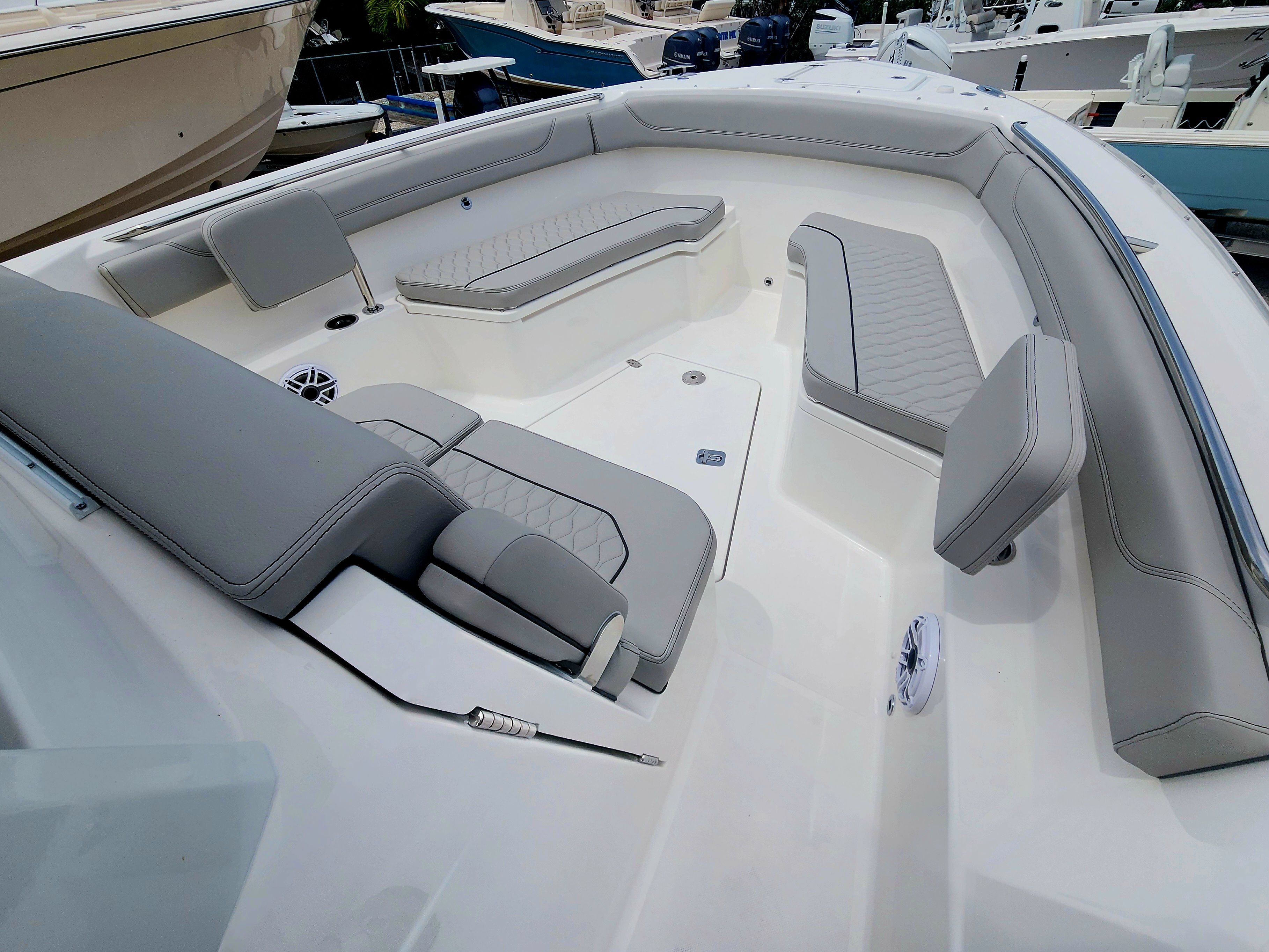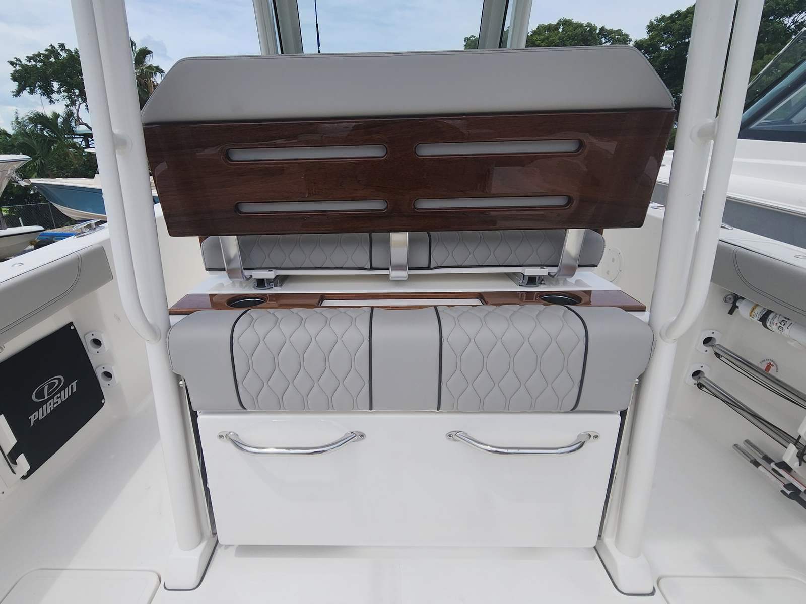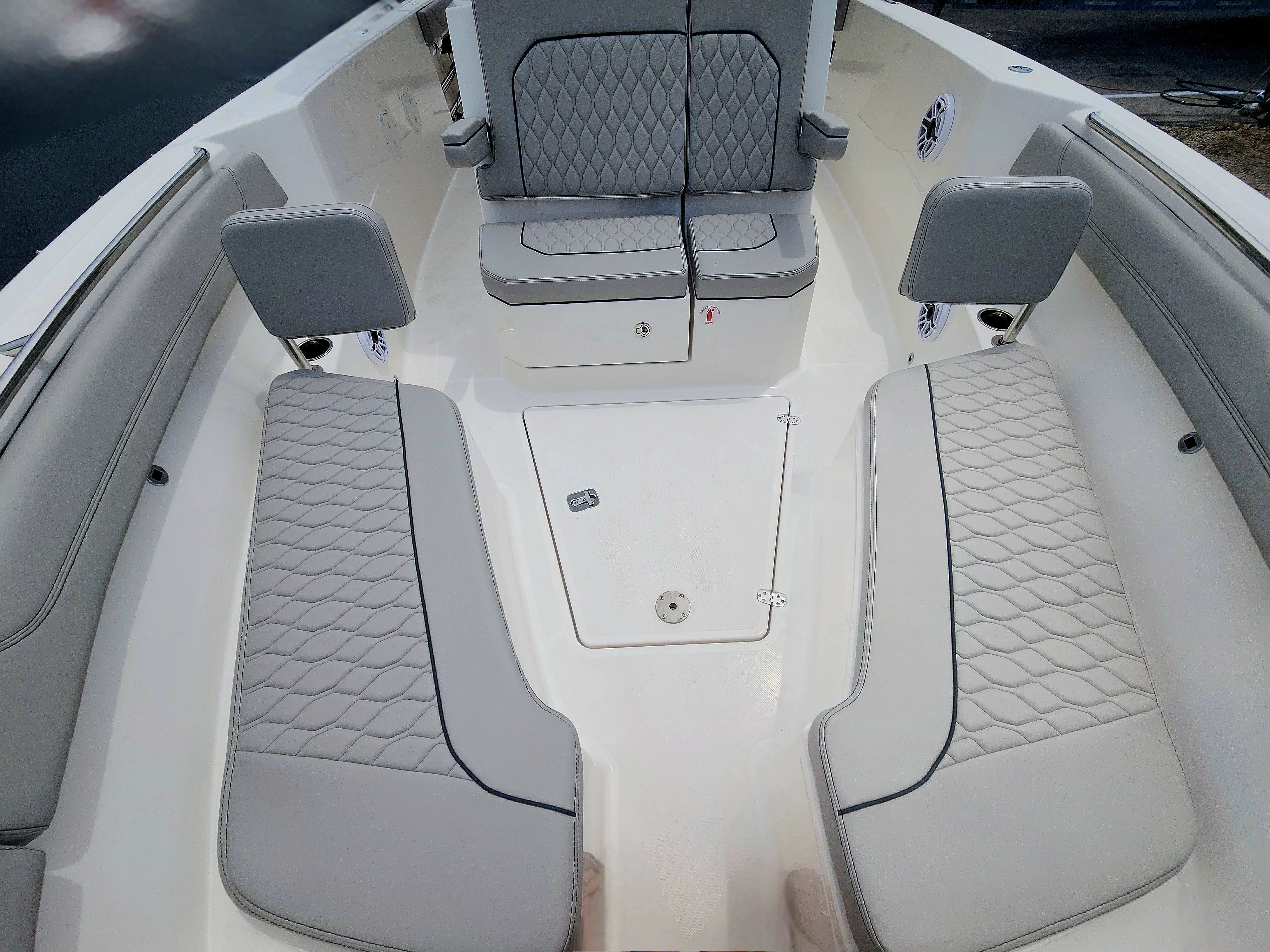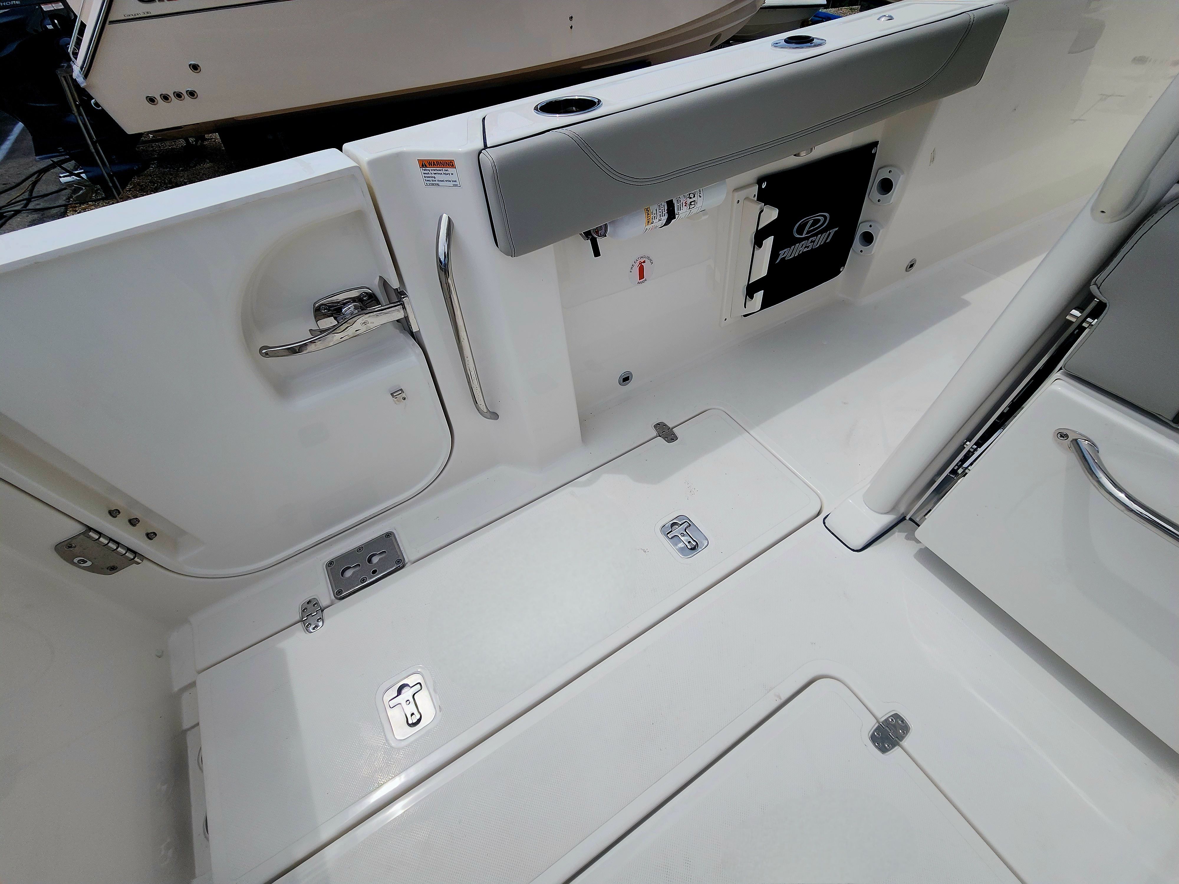 Practicality is at the core of the Pursuit S 288’s design. The hullside boarding door ladder makes it easy to get in and out of the water, whether you are swimming, snorkeling, or loading up from the dock. The 110V/60HZ dockside power with battery charger keeps your electronics and accessories charged, so you are always ready for a day of fun. The joystick control system simplifies docking, making it accessible even for less experienced boaters.Storage is abundant throughout the boat, allowing you to bring along everything you need for a day on the water without cluttering the deck. The efficient layout ensures that every inch of space is utilized, making it easy to stow fishing gear, water toys, and personal items. The all color spectrum underwater lights not only create a captivating atmosphere but also improve visibility for nighttime activities.