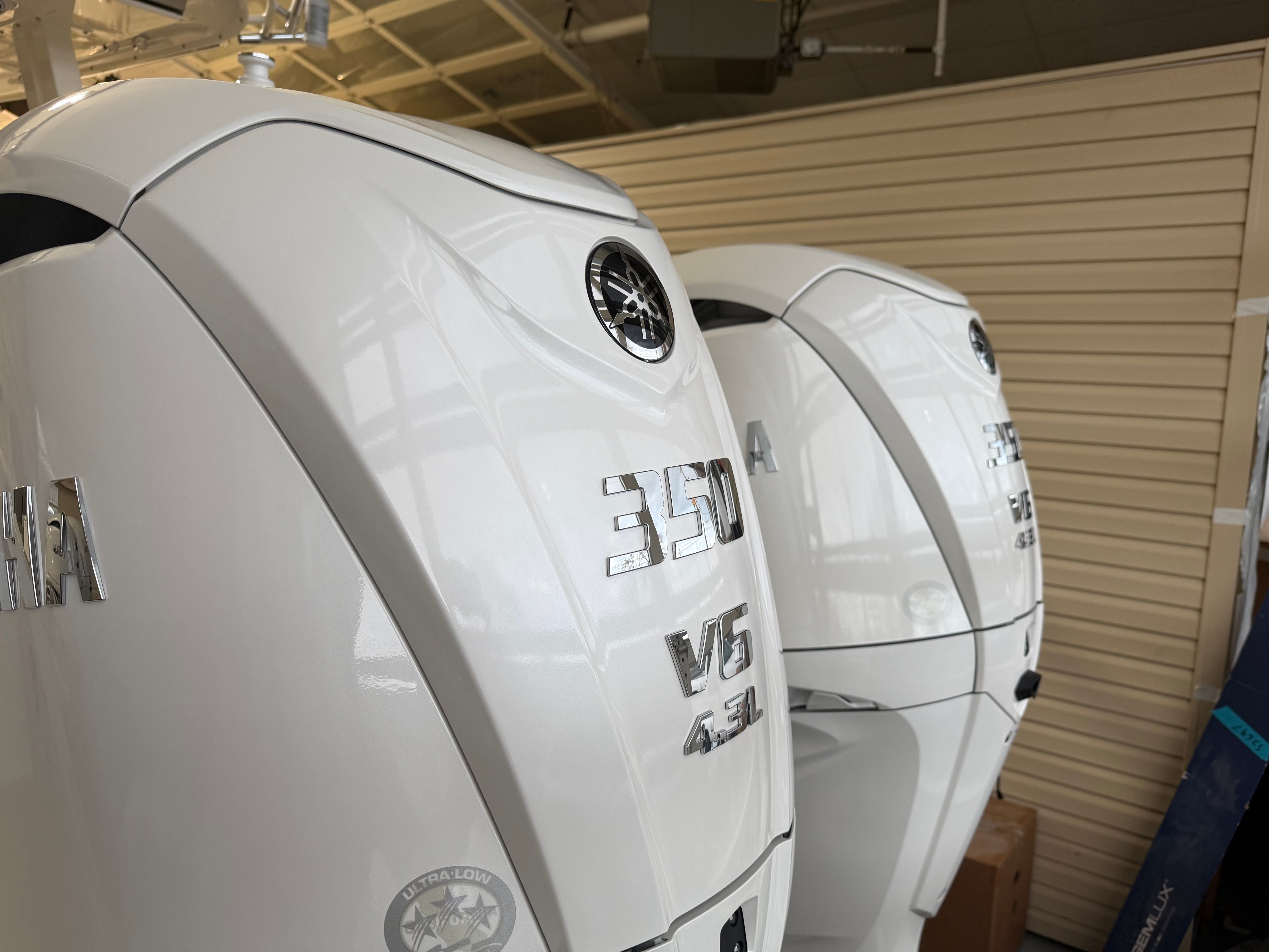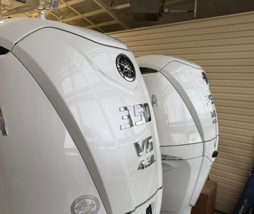 - Twin Yamaha Digital F350 V6 Offshore (Pearlescent White) w/Integrated Digital Electric Steering (DES) and Helm Master EX Digital Electronic Control (DEC) (does not include joystick control), Multifunction Display Interface and Manual Engine Flushing System