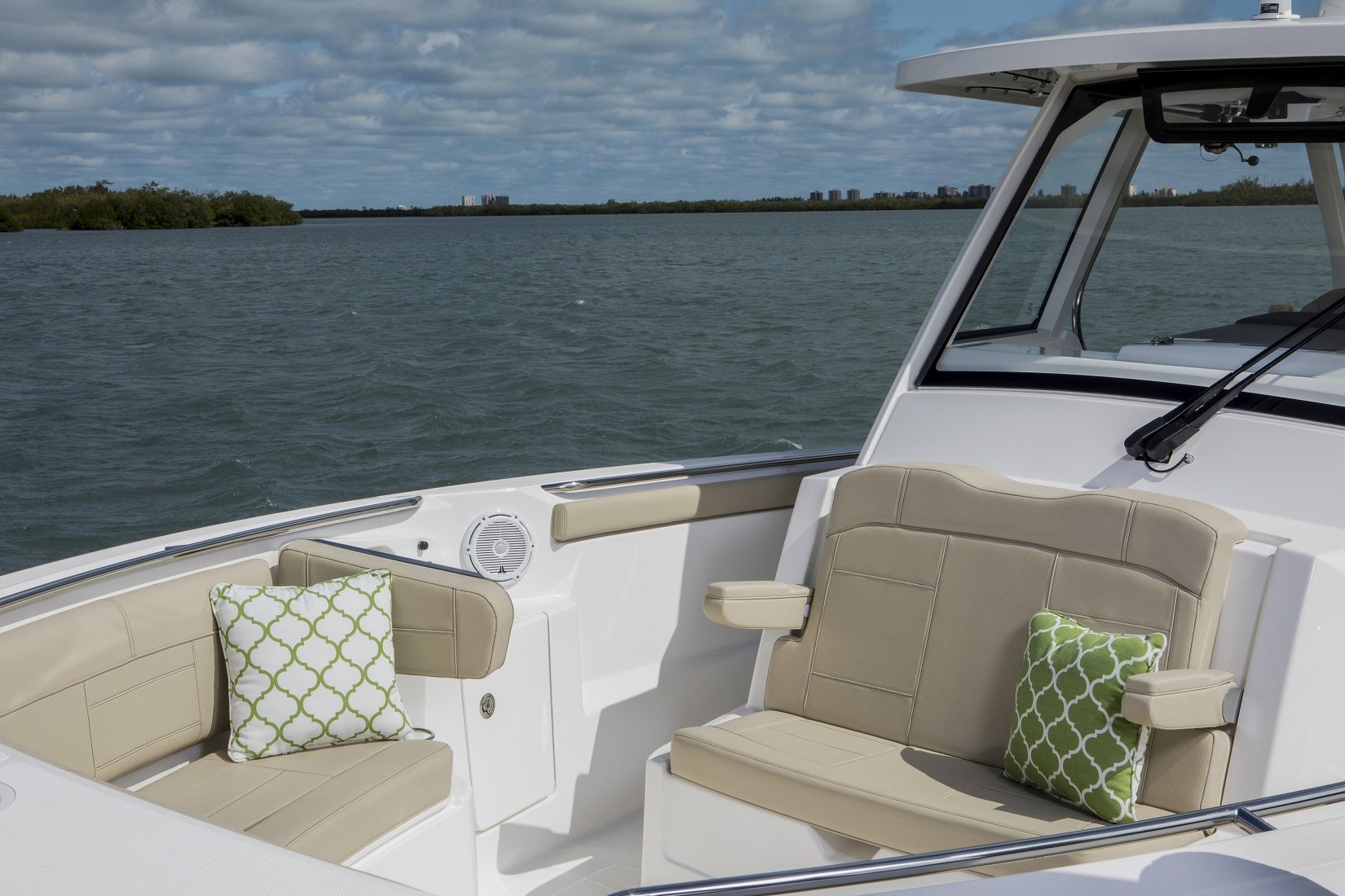 The Pursuit S 328 Center Console is loaded with advanced features designed to enhance your time on the water. The dual Garmin GPSMAP 8616XSV 16" Widescreen packages provide crystal-clear navigation and fish-finding capabilities, ensuring you always know where you are and what’s beneath the surface. The Garmin GMS10 Expander Module offers seamless integration of your electronics, while the Multifunction Display Interface puts all critical information at your fingertips. The Neptune Gray hardtop liner and helm, paired with the Arctic White bootstripe and Quartz Gray accents, create a visually stunning and cohesive design. The Tranquil Sea interior offers a serene and comfortable environment for you and your guests, making every outing a pleasure.