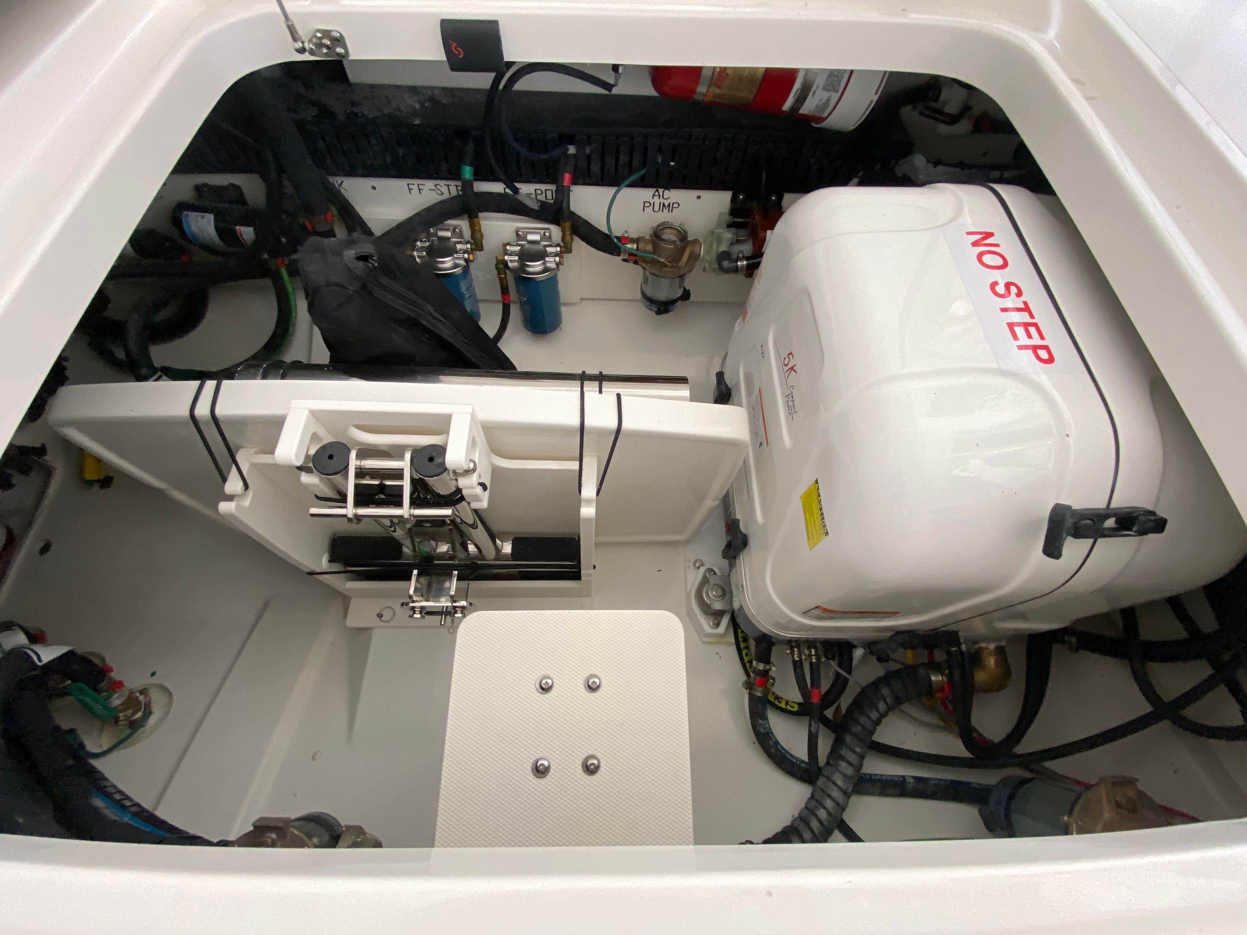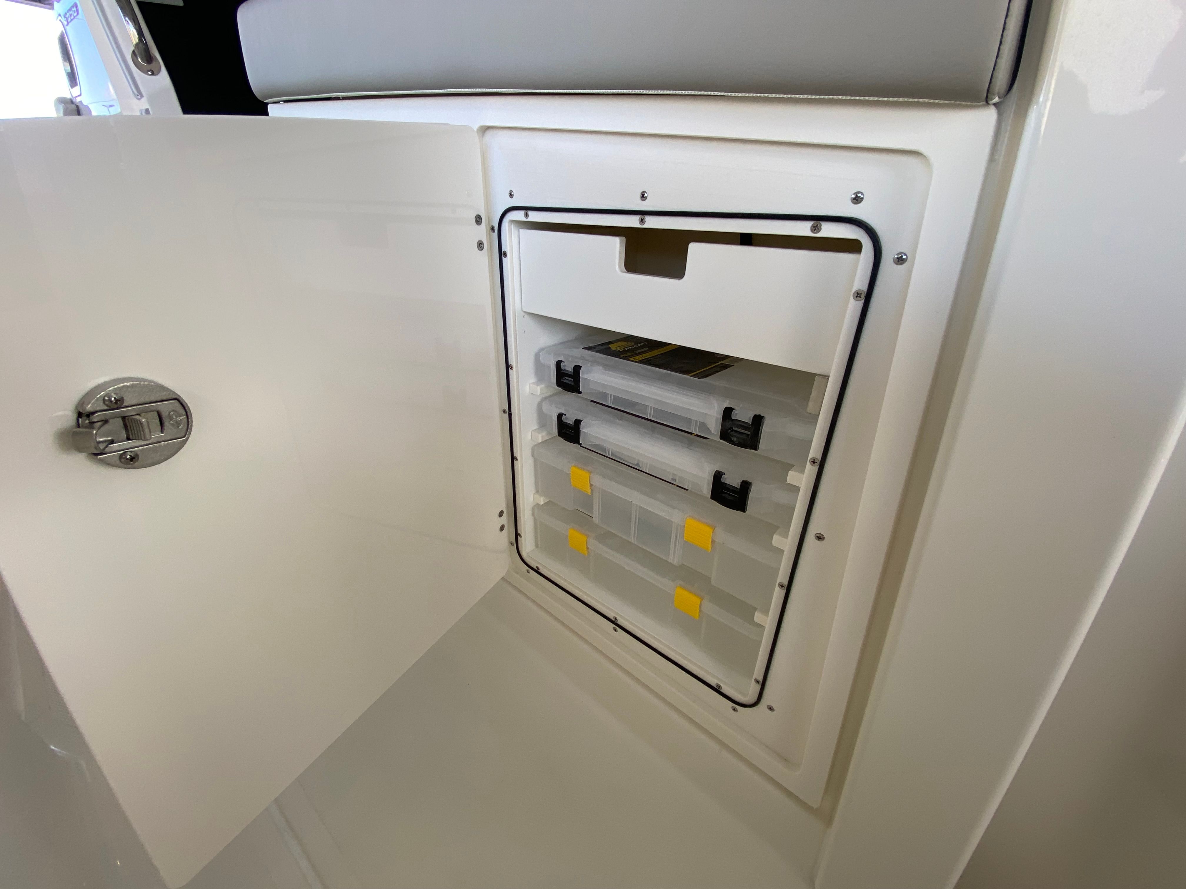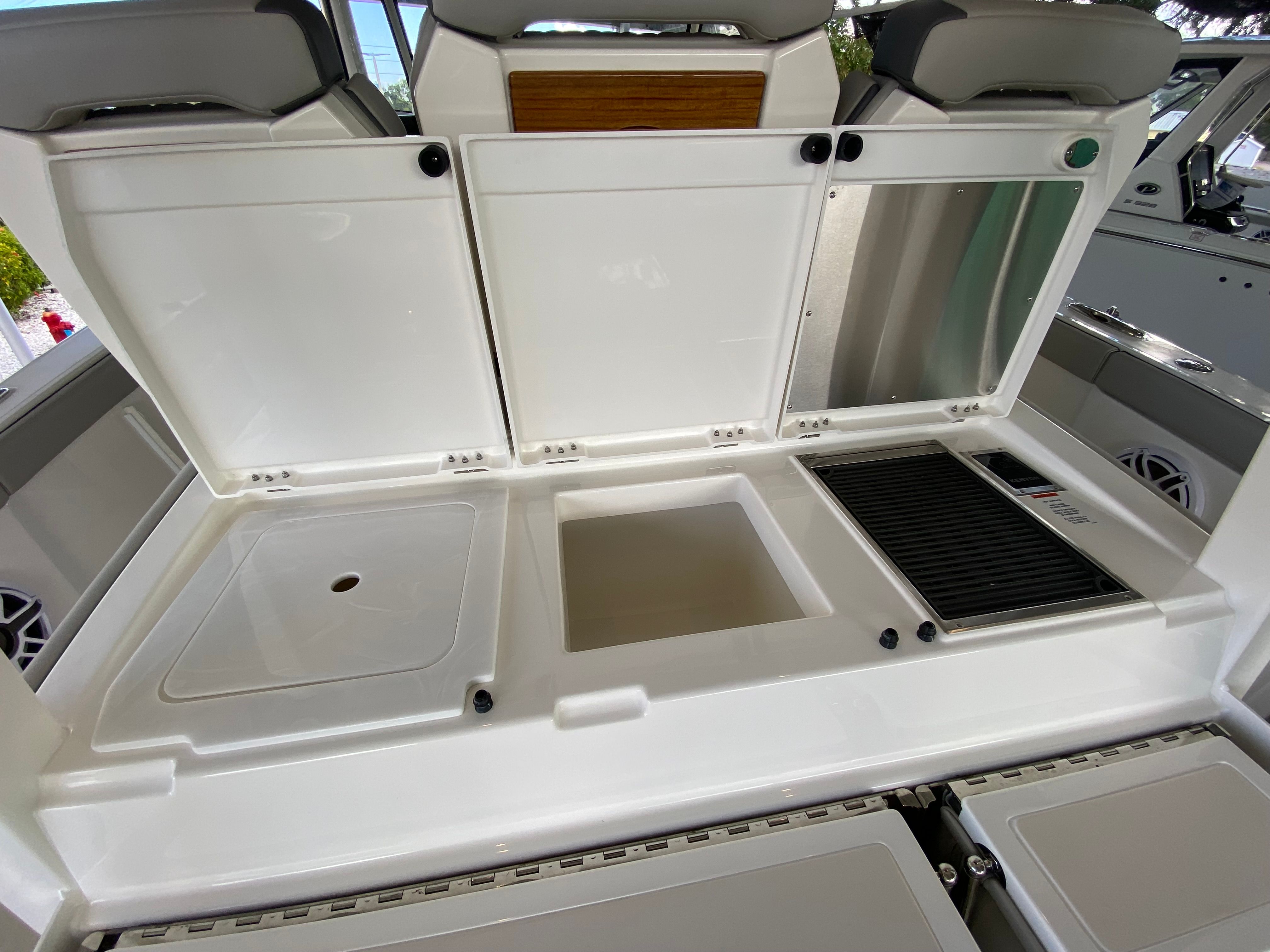 The Pursuit S 358 Center Console is loaded with premium features designed to elevate your boating experience. The hull’s fresh white color and platinum bootstripe offer a striking visual presence on the water, while the carbon helm and tranquil sea interior fabric create a modern, relaxing environment for both captain and guests. Comfort is paramount, with 110v/60Hz cabin air conditioning featuring reverse cycle technology (6,000 BTU) to keep the interior cool and inviting, regardless of the weather outside. The cockpit is equally well-appointed, boasting a powerful 16,000 BTU air conditioning system for those warm summer days.For sun lovers, the bow Mediterranean style sunshade is easily stowable, providing flexible protection from the elements when needed. The custom hardtop features an integrated stainless steel retractable Makefast sunshade with one-touch operation, offering effortless shade at the touch of a button. The 5.0kW Fischer Panda generator (with a 16-gallon diesel tank) ensures you have reliable power for all your onboard systems, while the included GFI outlet and 0.7 cu. ft. microwave (replacing upper storage in the cabin) add convenience for extended trips or entertaining guests.