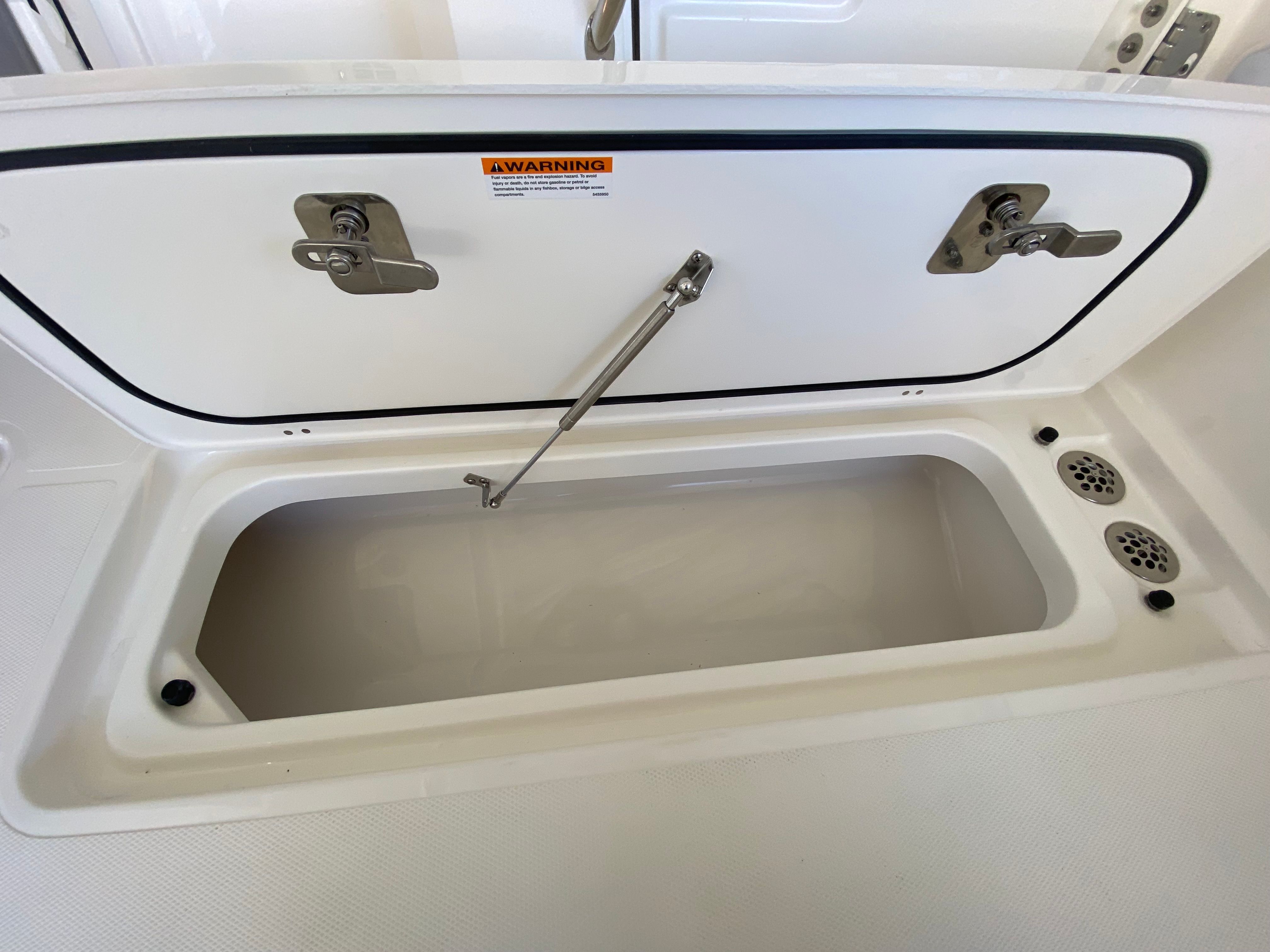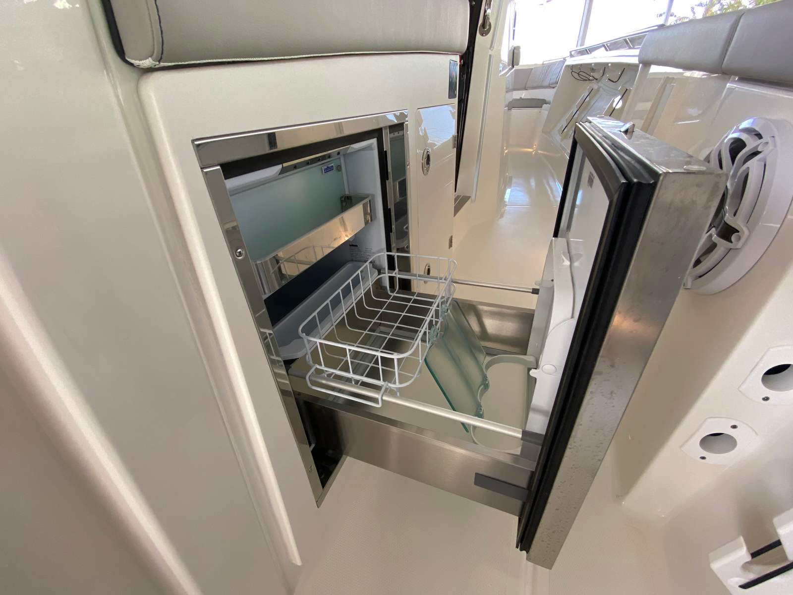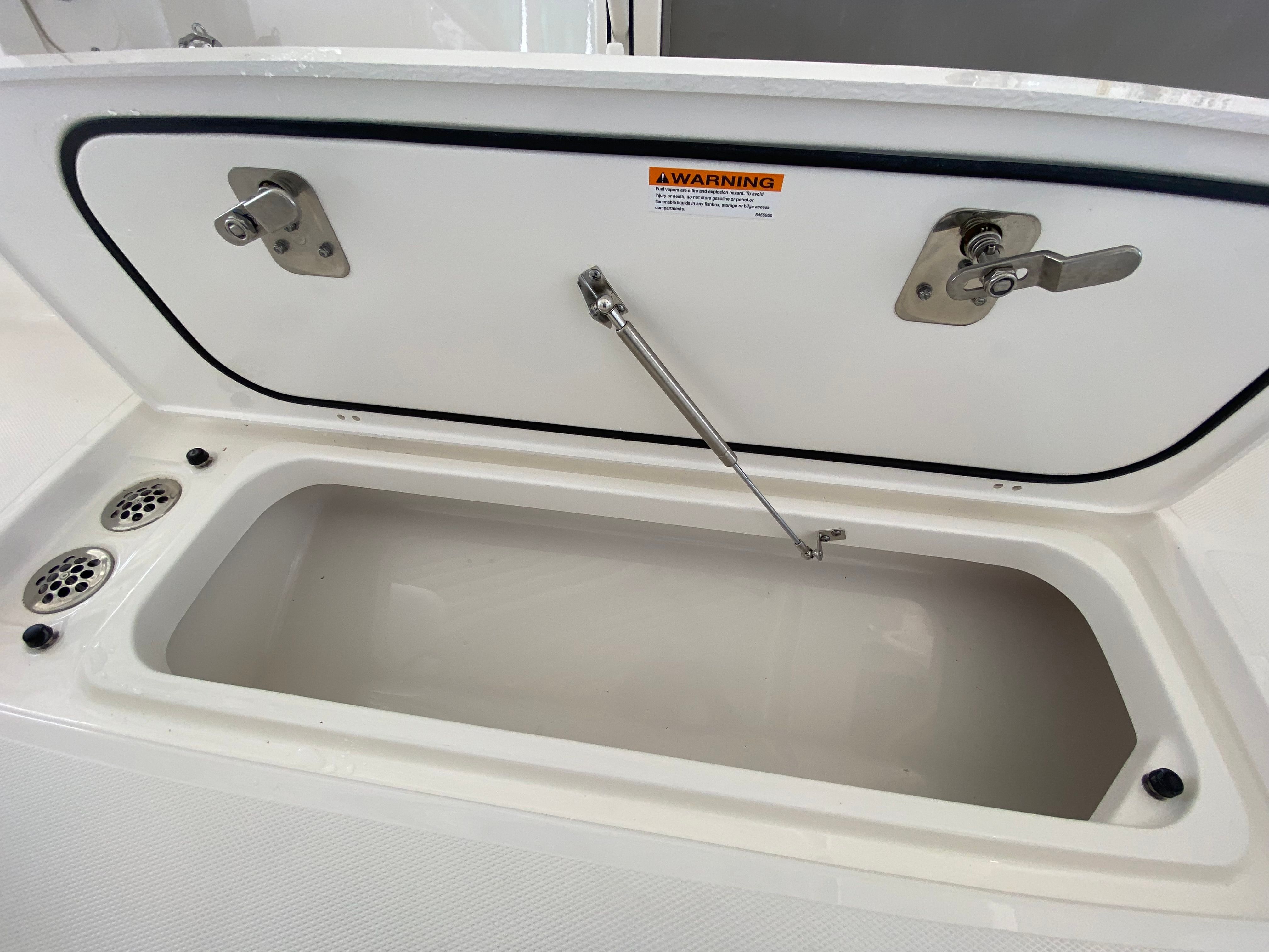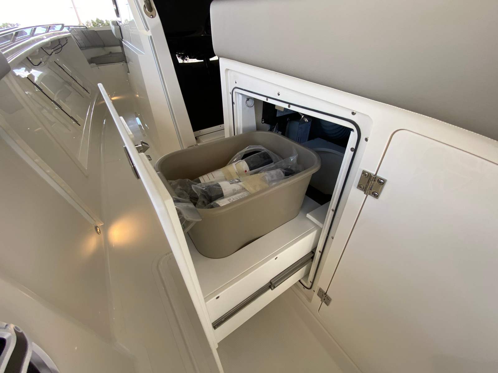 The Pursuit S 358 Center Console is loaded with premium features designed to elevate your boating experience. The hull’s fresh white color and platinum bootstripe offer a striking visual presence on the water, while the carbon helm and tranquil sea interior fabric create a modern, relaxing environment for both captain and guests. Comfort is paramount, with 110v/60Hz cabin air conditioning featuring reverse cycle technology (6,000 BTU) to keep the interior cool and inviting, regardless of the weather outside. The cockpit is equally well-appointed, boasting a powerful 16,000 BTU air conditioning system for those warm summer days.For sun lovers, the bow Mediterranean style sunshade is easily stowable, providing flexible protection from the elements when needed. The custom hardtop features an integrated stainless steel retractable Makefast sunshade with one-touch operation, offering effortless shade at the touch of a button. The 5.0kW Fischer Panda generator (with a 16-gallon diesel tank) ensures you have reliable power for all your onboard systems, while the included GFI outlet and 0.7 cu. ft. microwave (replacing upper storage in the cabin) add convenience for extended trips or entertaining guests.