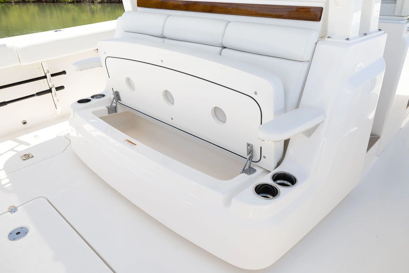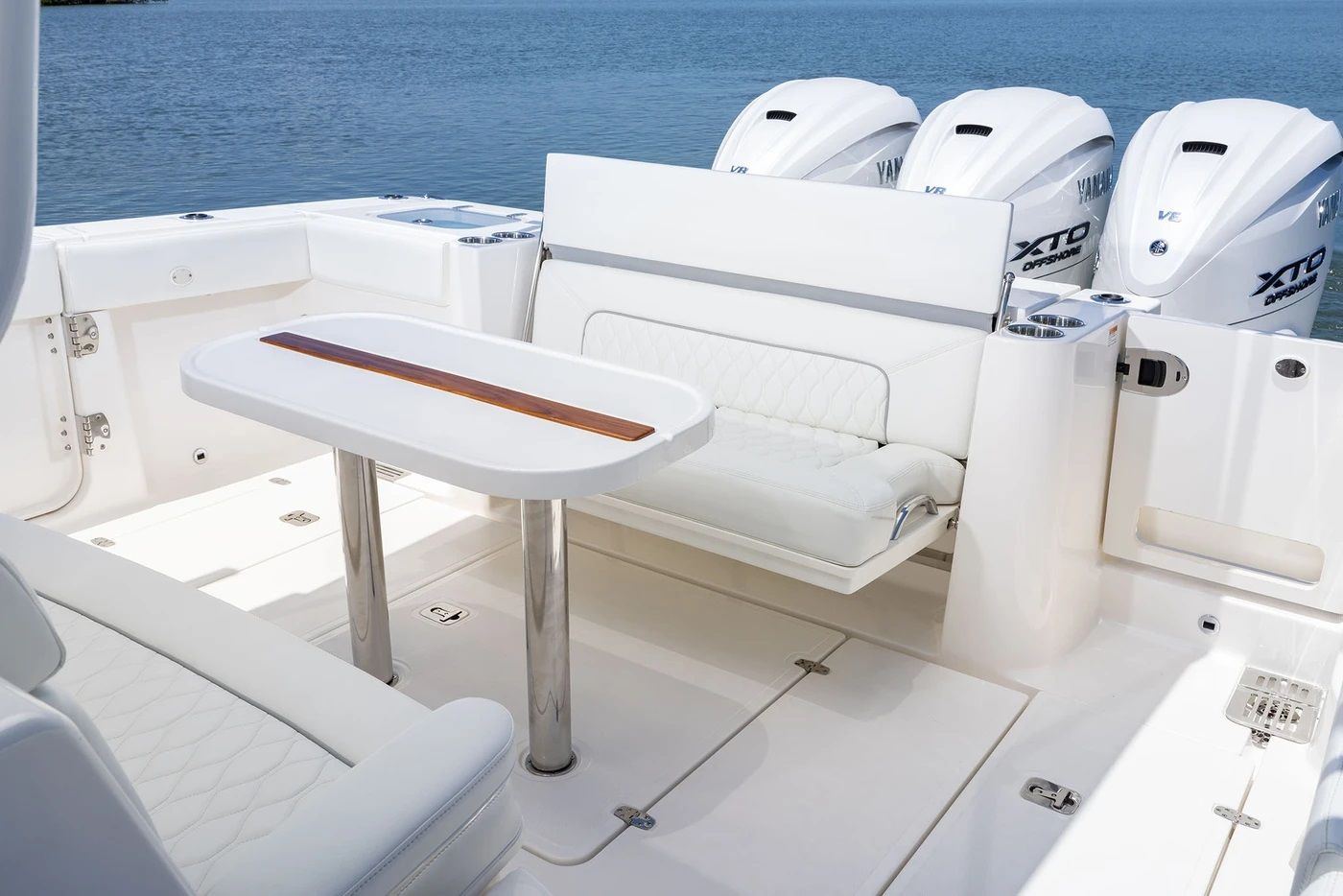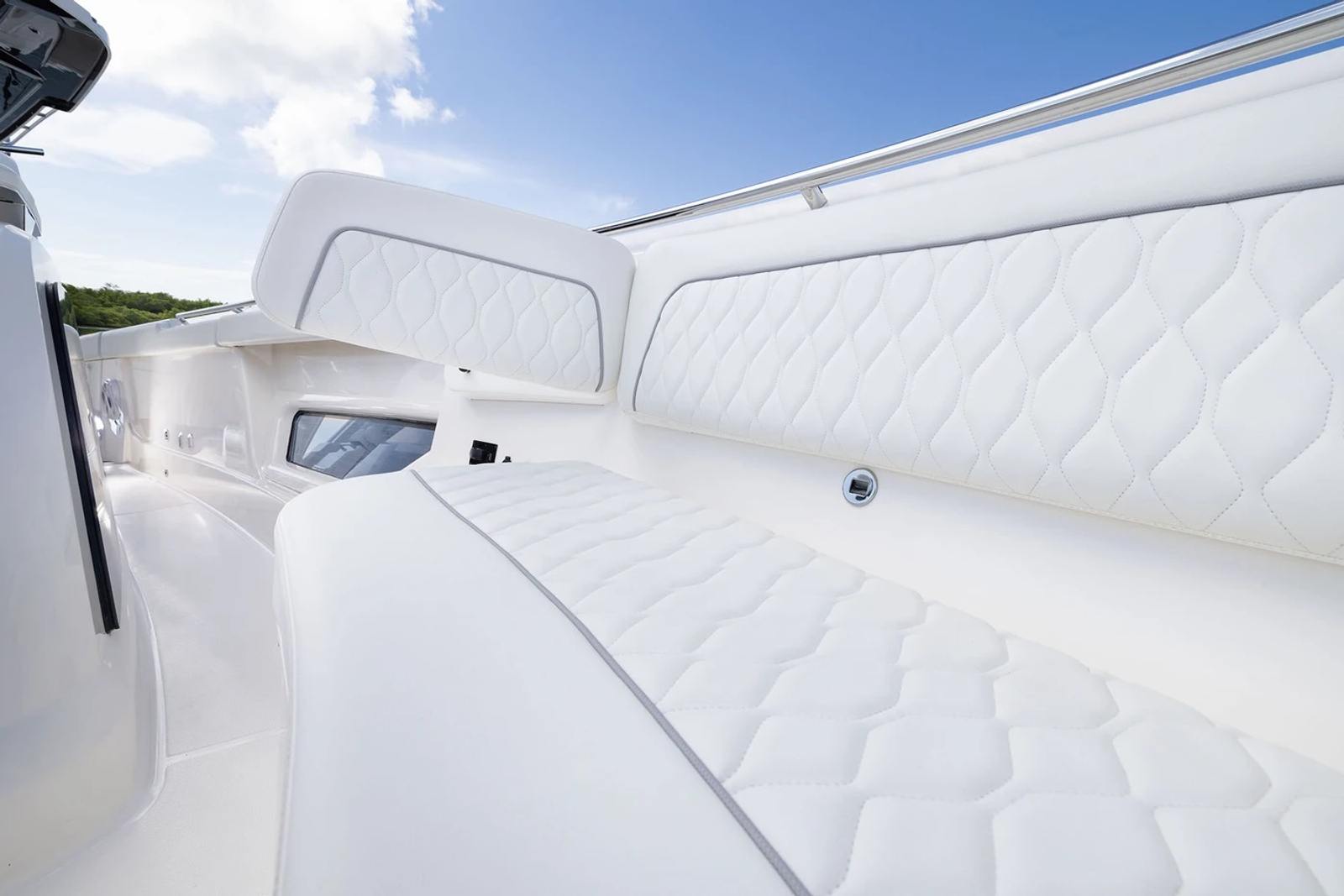 The Pursuit S 388 is as practical as it is luxurious. Its generous length provides ample storage for gear, water toys, and personal belongings, keeping the deck clutter-free and organized. The efficient triple Yamaha engines make docking and maneuvering a breeze, allowing you to explore marinas, coves, and secluded beaches with ease.Fuel efficiency and low maintenance requirements mean you can spend more time enjoying the water and less time worrying about upkeep. The refrigerated transom tub is perfect for storing snacks, drinks, or your catch of the day, adding convenience to every outing. The remote-controlled spotlight enhances safety during early morning departures or late-night returns, giving you peace of mind whenever you set out.