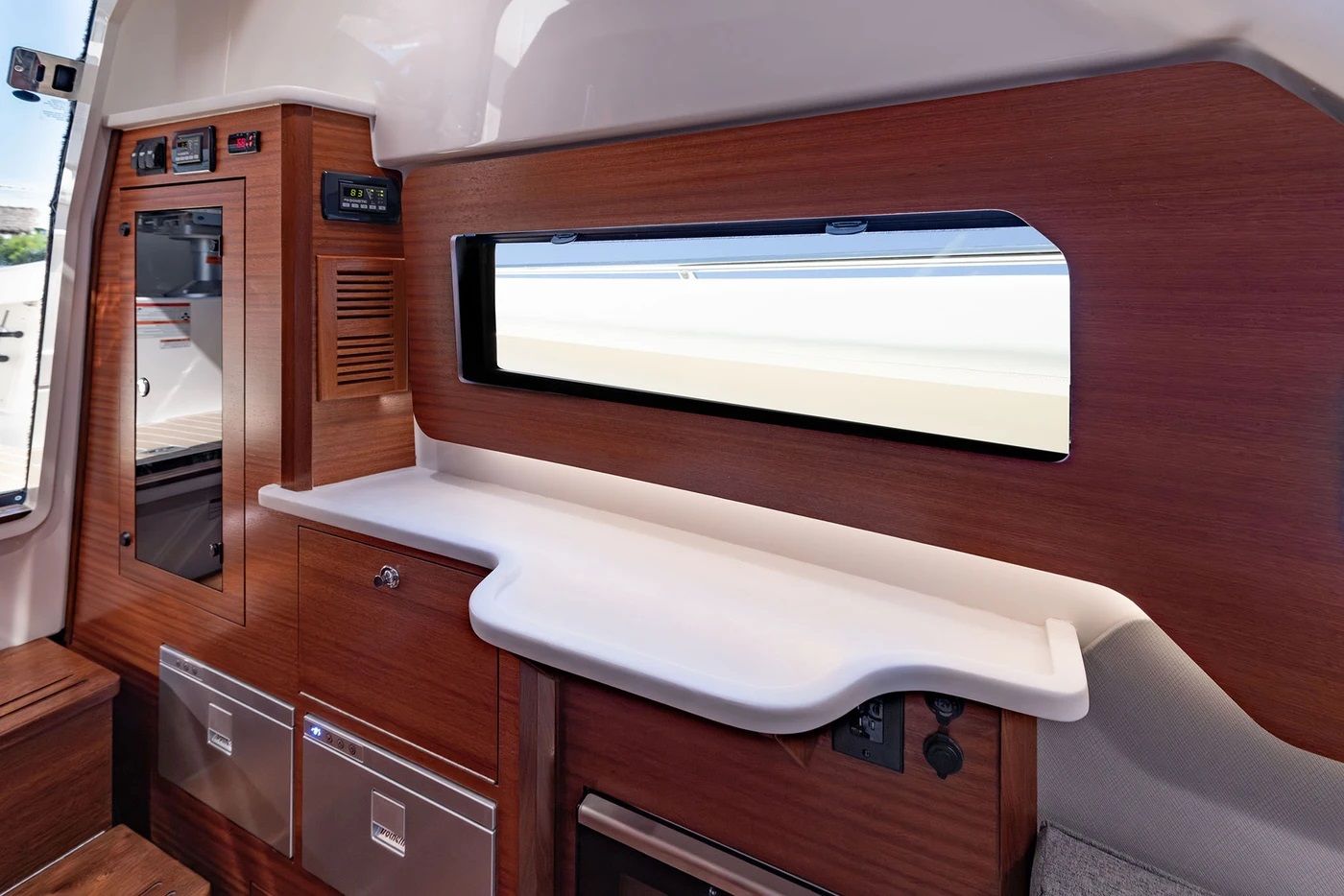 The Pursuit S 388 is loaded with special features that elevate your time on the water. The Neptune Gray hull and hull bottom create a striking visual impact, while the Carbon helm and Neptune Gray hardtop underside add a touch of modern elegance. The interior, finished in Coastal Sunrise and Sea Salt, offers a welcoming and stylish environment for you and your guests.Comfort is paramount, with cockpit air conditioning and a windshield defogger vent ensuring a pleasant atmosphere regardless of the weather. The transom refrigerated tub provides convenient storage for refreshments or your fresh catch, keeping everything chilled and ready for your next adventure. For added safety and convenience, a spotlight with remote control at the helm allows you to navigate confidently during nighttime excursions.