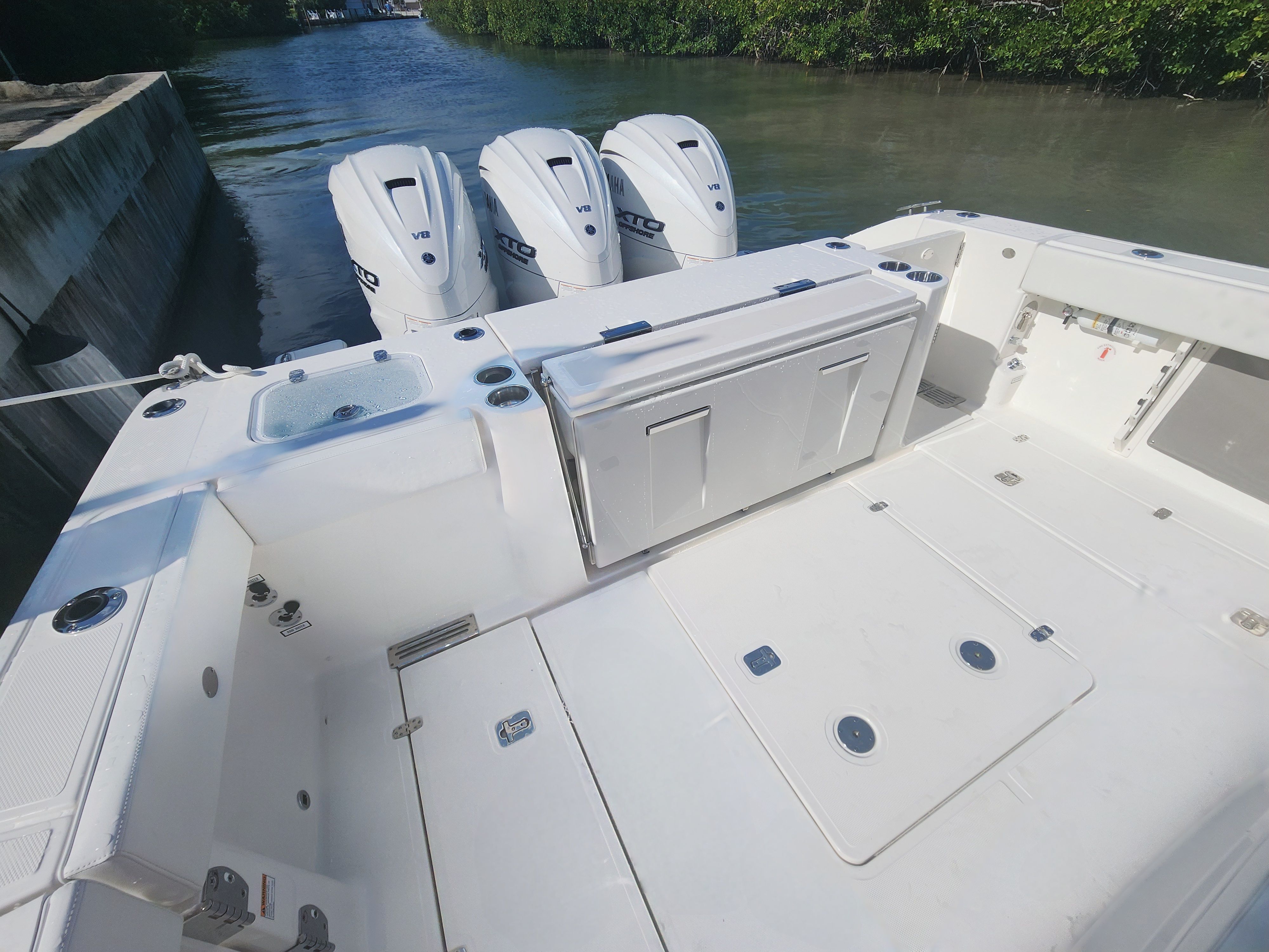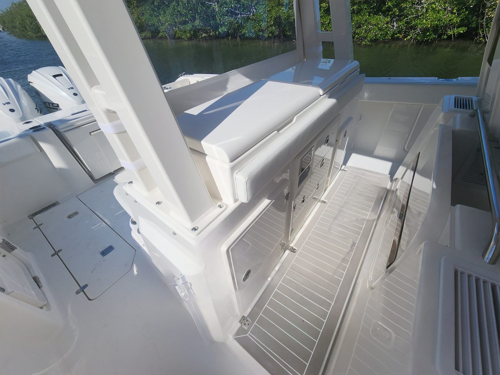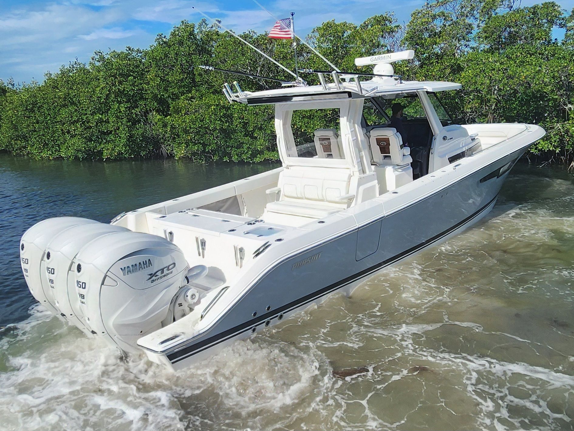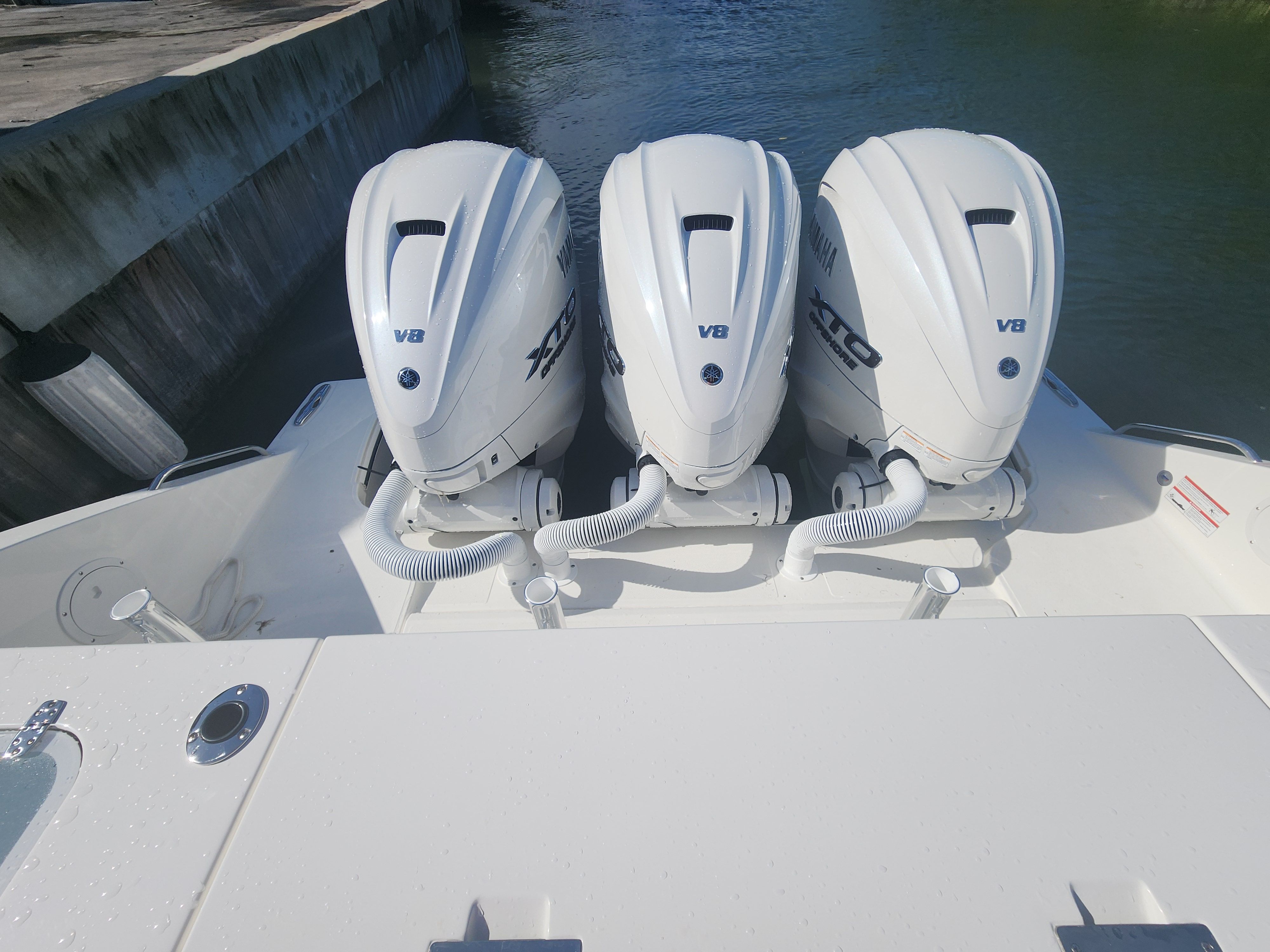 Powering the Pursuit S 388 are three robust engines, delivering a combined 1350 horsepower. This impressive setup ensures that the S 388 is more than capable of handling a variety of water conditions, from calm bays to challenging offshore environments. The triple-engine configuration provides exhilarating acceleration, smooth cruising, and reliable performance, making this Center Console boat for sale an ideal choice for those who value speed and agility. Whether you’re chasing the horizon or navigating tight channels, the S 388 offers responsive handling and stability, giving you confidence every time you take the helm.