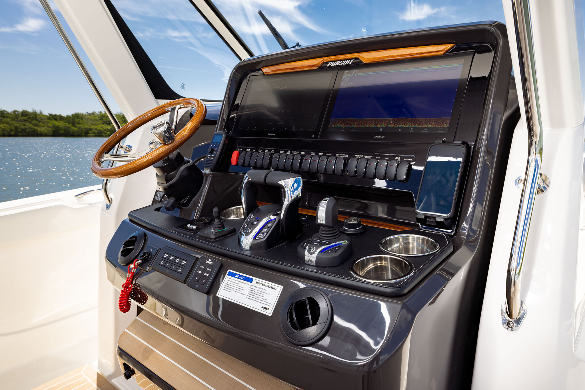 The Pursuit S 388 Center Console is loaded with innovative features designed to enhance your boating experience. The Multifunction Display Interface puts navigation and system controls at your fingertips, while the manual engine flushing system simplifies maintenance and helps keep your engines running smoothly. Comfort is paramount, with a 240v/60Hz cockpit air conditioning system and windshield defogger vent (16,000 BTU) ensuring a pleasant environment regardless of the weather.For sun protection and relaxation, the bow Mediterranean style sunshade is easily stowable, and the custom hardtop features an integrated electric retractable sunshade for instant shade at the touch of a button. The helm area is a showcase of premium upgrades, including an Edson solid teak steering wheel with power knob, a leather-wrapped dash pad in black, synthetic teak flooring on the helm footrest treads, and teak accents on dash storage pockets and the entertainment center. Select color options—Biscuit or Smoke—allow you to personalize the flooring and entertainment area to match your style.