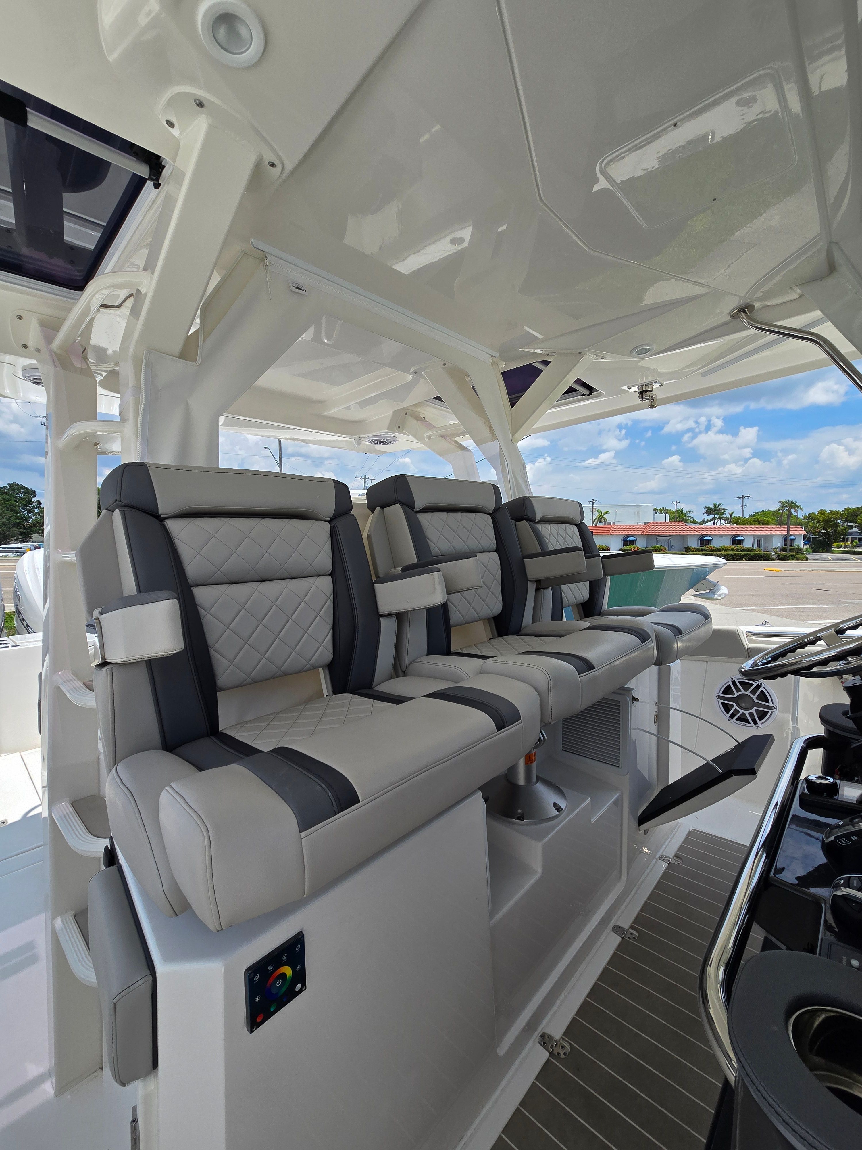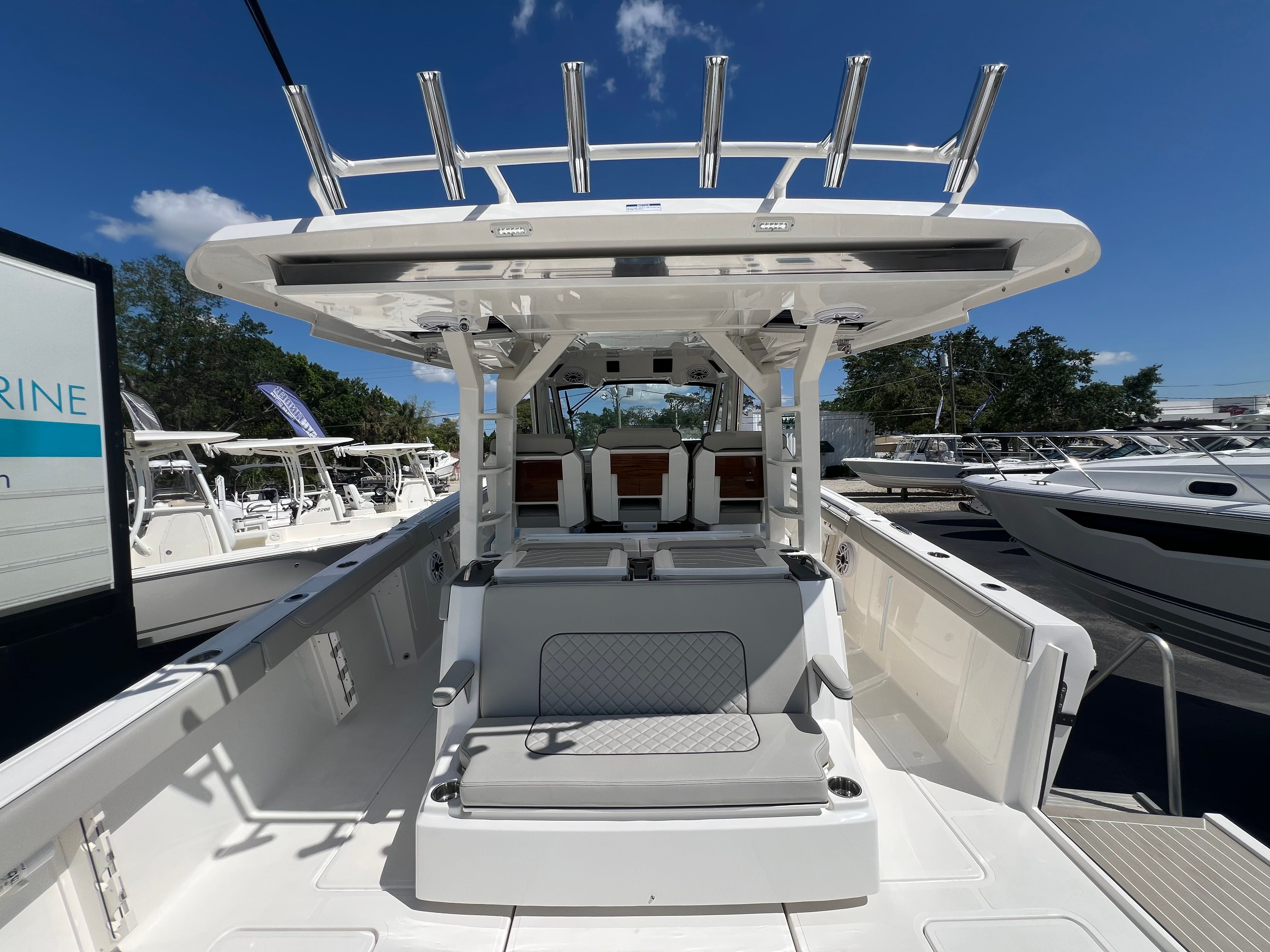 The 2025 Pursuit S 428 is loaded with premium features that enhance both safety and enjoyment on the water. The Garmin 72Mile GMR Fantom Radar Array offers advanced navigation and situational awareness, making it easy to explore new destinations with confidence. The Seakeeper Gyro Stabilization System is a game-changer for comfort, virtually eliminating boat roll and ensuring a stable, enjoyable experience for everyone on board, even in choppy conditions.For those who appreciate comfort and protection from the elements, the electric retractable cockpit sun shade provides instant relief from the sun, allowing you to create the perfect environment for relaxation or entertaining guests. The boat’s aesthetic appeal is further elevated by the navy boot stripe with navy accent, while the hardtop liner in fresh white adds a touch of modern elegance.To protect your investment and keep your boat looking pristine, the S 428 comes equipped with a suite of high-quality covers, including the White Stamoid LT instrument cover, aft facing seat cover, console chaise cover, and helm/comp seat cover. The blue quad engine covers not only enhance the boat’s visual appeal but also provide essential protection for the powerful engines.
