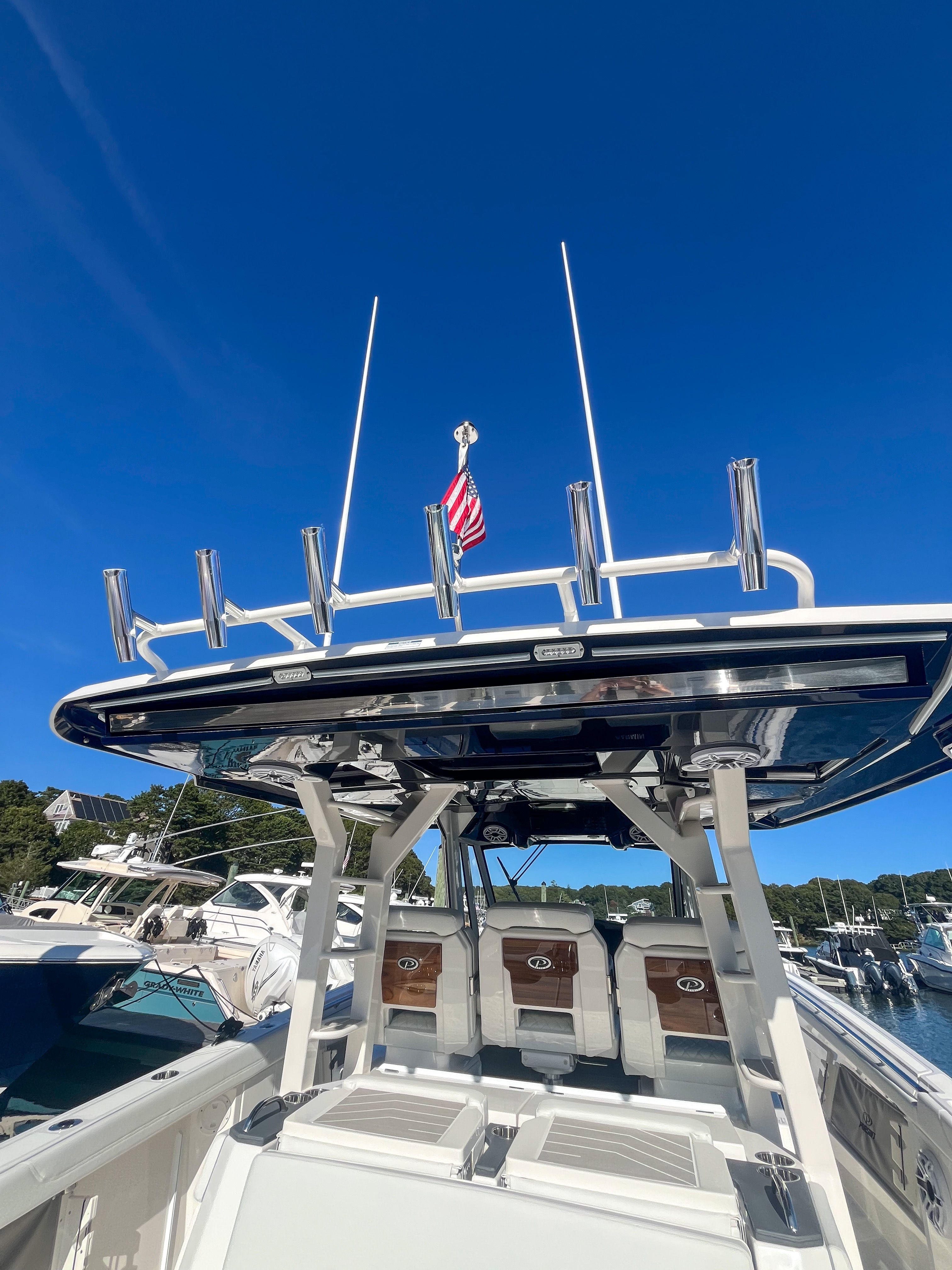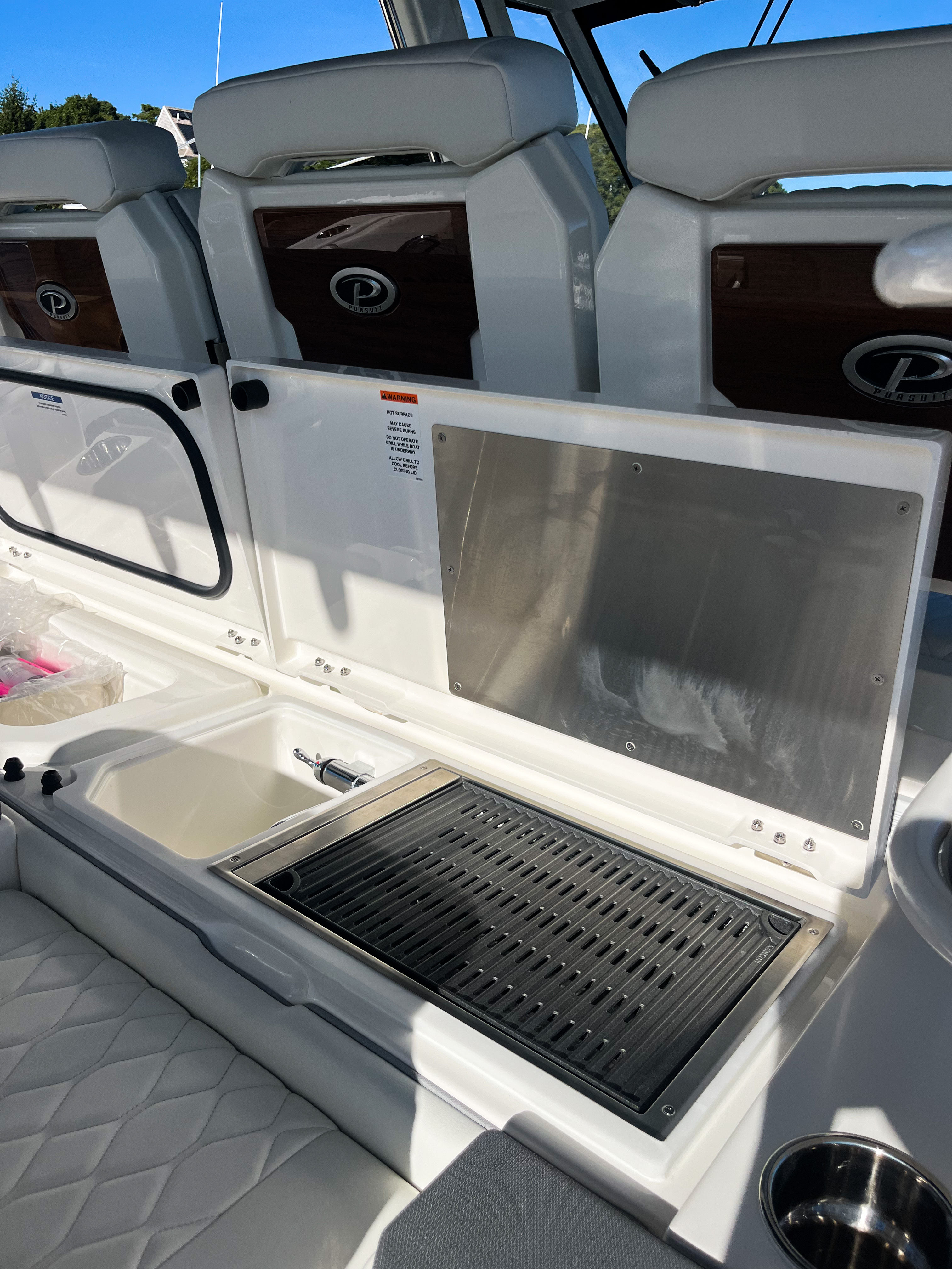 The 2026 Pursuit S 428 is loaded with premium features that set it apart from other Center Console boats for sale. The Garmin Radar Open Array GMR Fantom 54 provides cutting-edge navigation and situational awareness, making every journey safer and more enjoyable. The FLIR M332 Night Vision with Image Stabilization offers enhanced visibility during nighttime excursions, giving you peace of mind no matter when you set out. Comfort is at the forefront of the S 428’s design. The upgraded white and gray upholstery adds a touch of luxury to every seat, while the cockpit AC system (16,000 BTU) with a high-volume fan ensures you and your guests stay cool and comfortable, especially when paired with the three-sided enclosure. The WHT STAMOID LT covers for the aft-facing seat, instrument panel, and console chaise provide protection and style, keeping your boat looking pristine. The sunshade closeout in Flag Blue offers additional comfort on sunny days, making the cockpit a perfect place to relax and socialize.