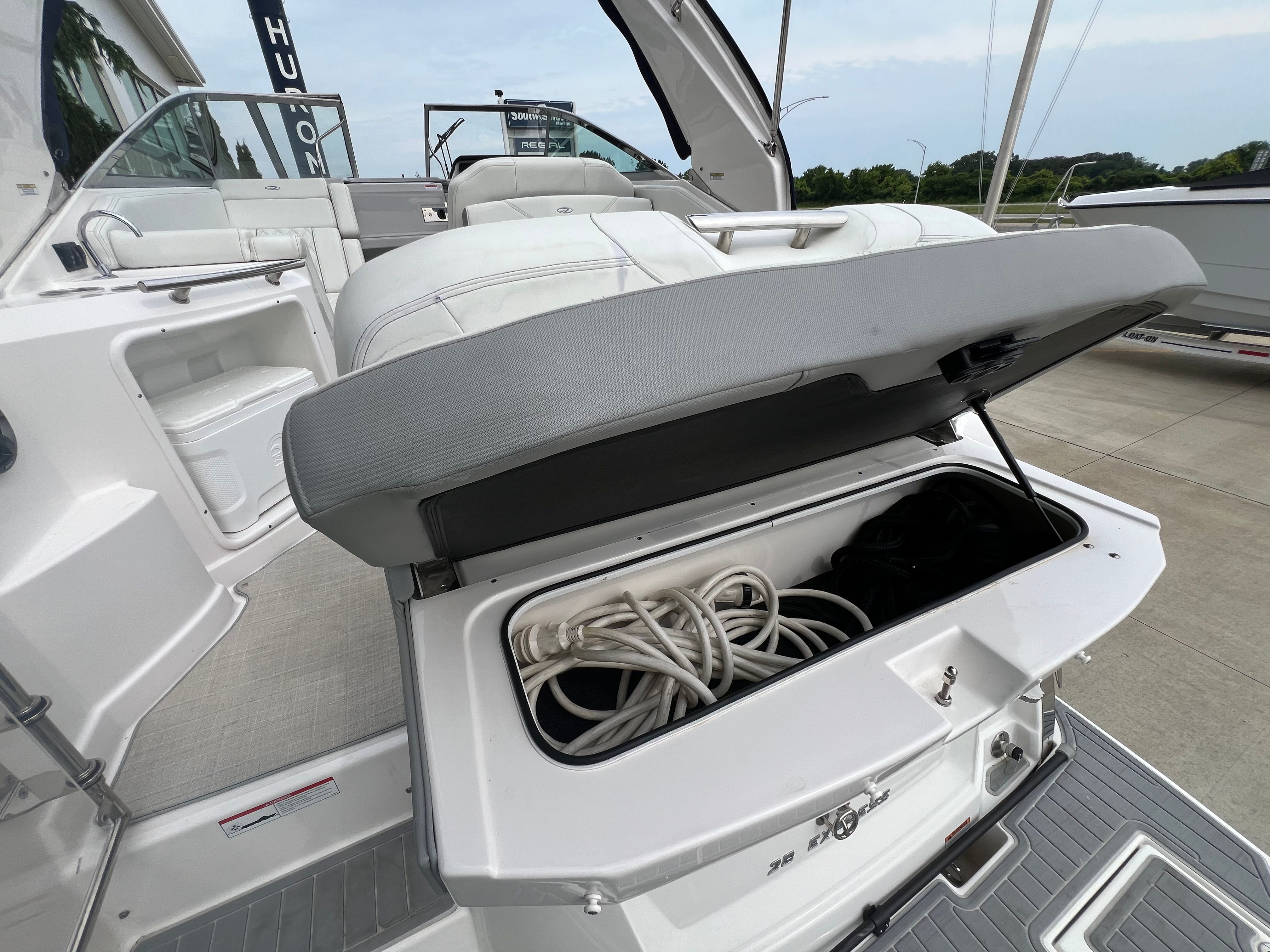 This Regal boat for sale is loaded with features that enhance both functionality and enjoyment. The dual 9-inch glass cockpit displays provide clear, intuitive navigation and system monitoring, making piloting the boat a breeze. The Garmin GSD24 and B60 transducer, along with the Garmin VHF 110, ensure you have the latest in marine electronics for safe and efficient travel. For music lovers, the stereo system comes equipped with a satellite tuner and antenna, so you can enjoy your favorite tunes wherever your journey takes you.The DeaDek from the swim platform is color-matched to the hull, offering both style and comfort underfoot. The white power tower adds a modern touch and provides shade and support for water sports activities. Blue underwater lighting creates a captivating ambiance during evening cruises, making every outing feel special. The anchor windlass with an all-chain setup simplifies anchoring, giving you peace of mind and convenience when you want to stop and enjoy the scenery.