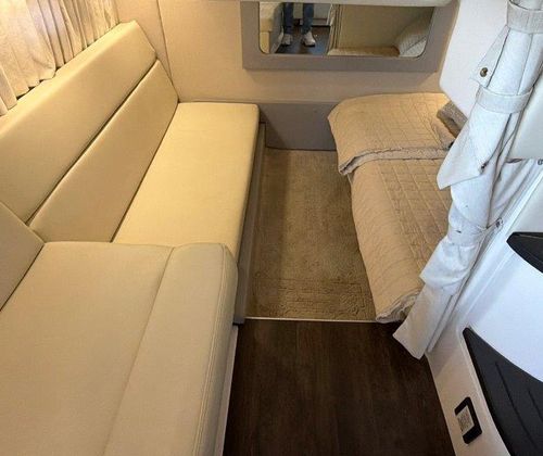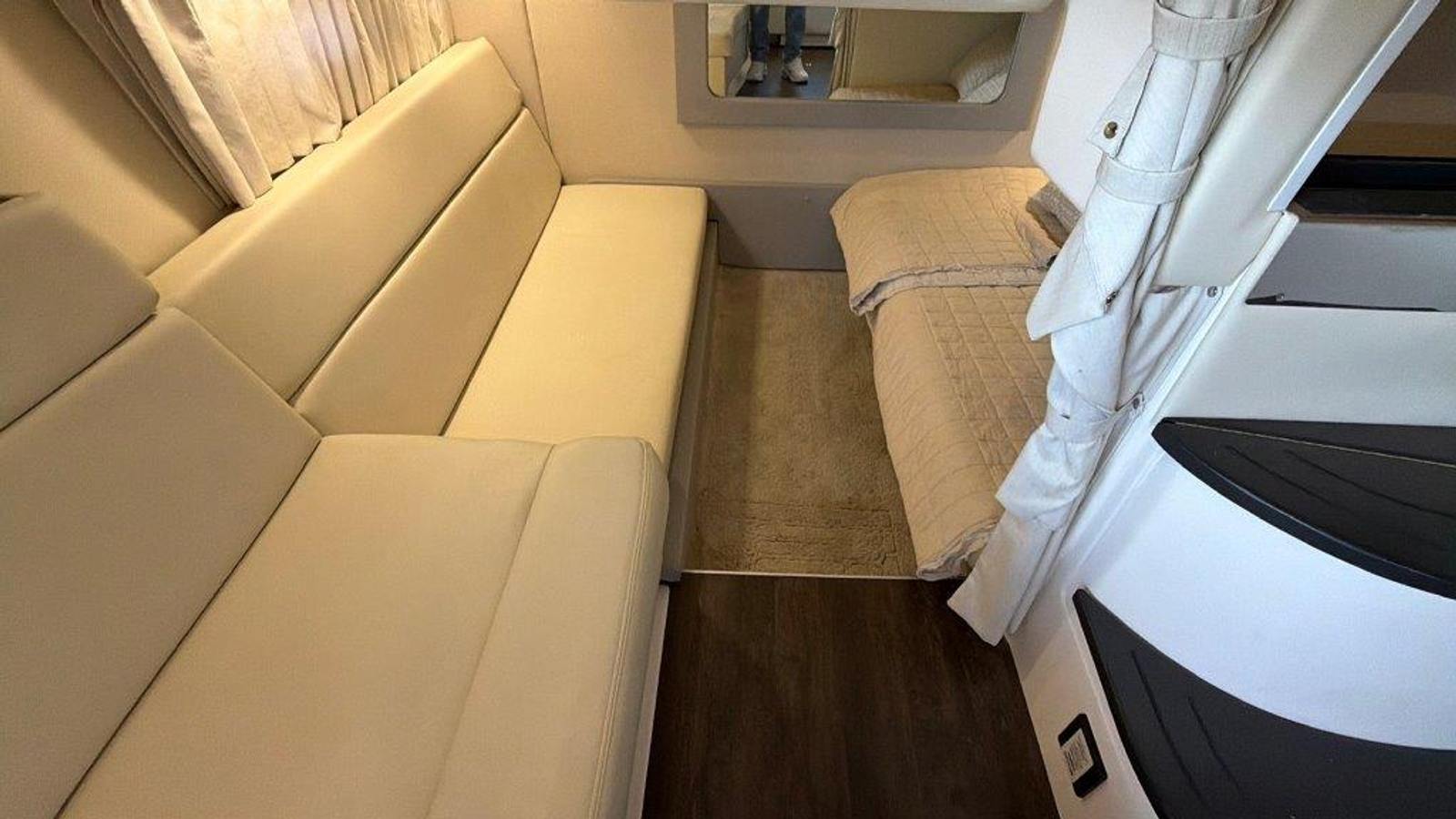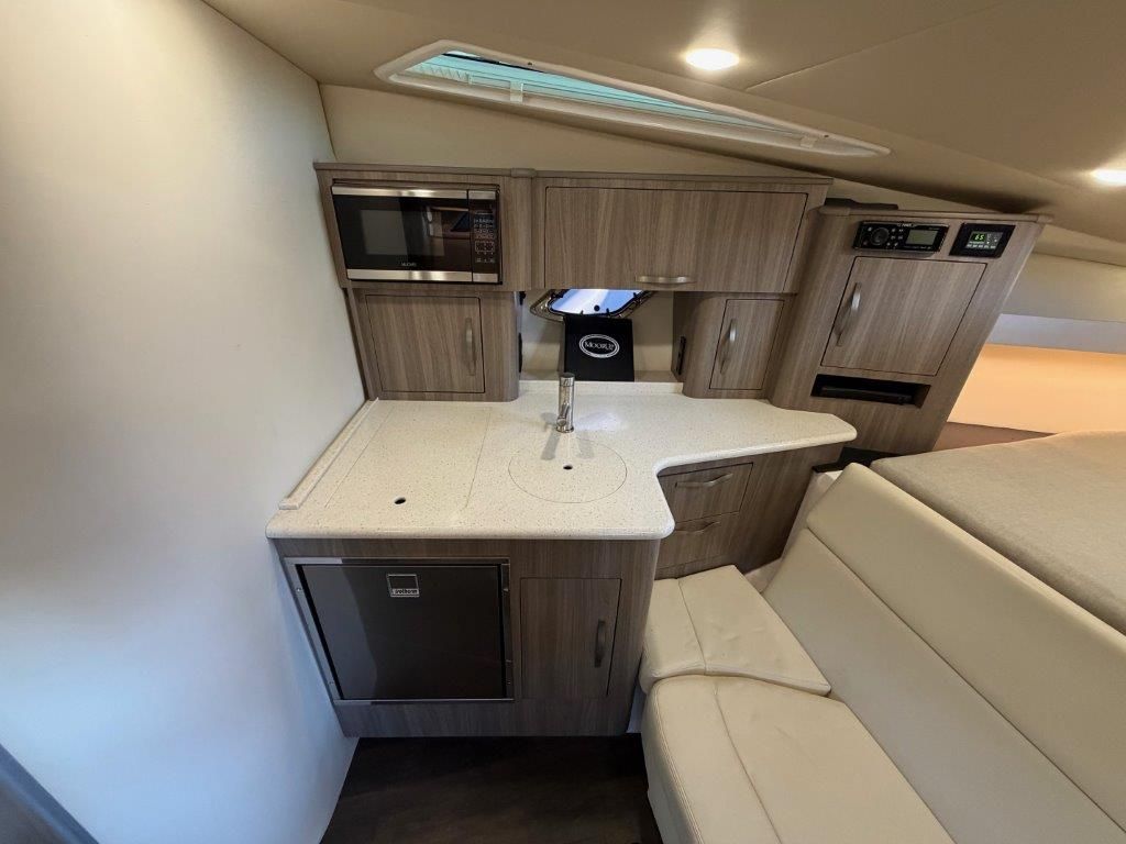 Below deck, the spacious salon offers L-shaped seating for entertaining, a queen-size berth at the touch of a button, and an aft cabin that converts into a queen bed in seconds. The galley is fully equipped with a stove, microwave, and a high-gloss teak table that stores neatly behind the couch when not in use.