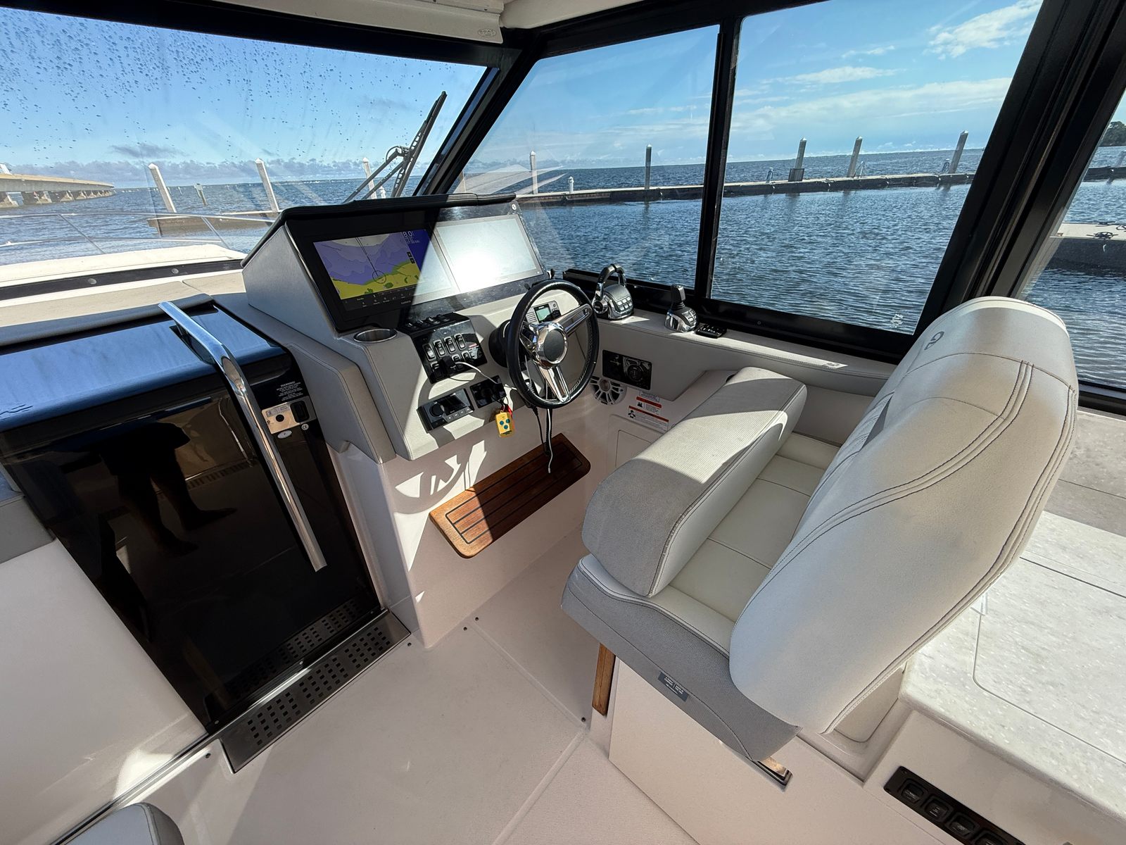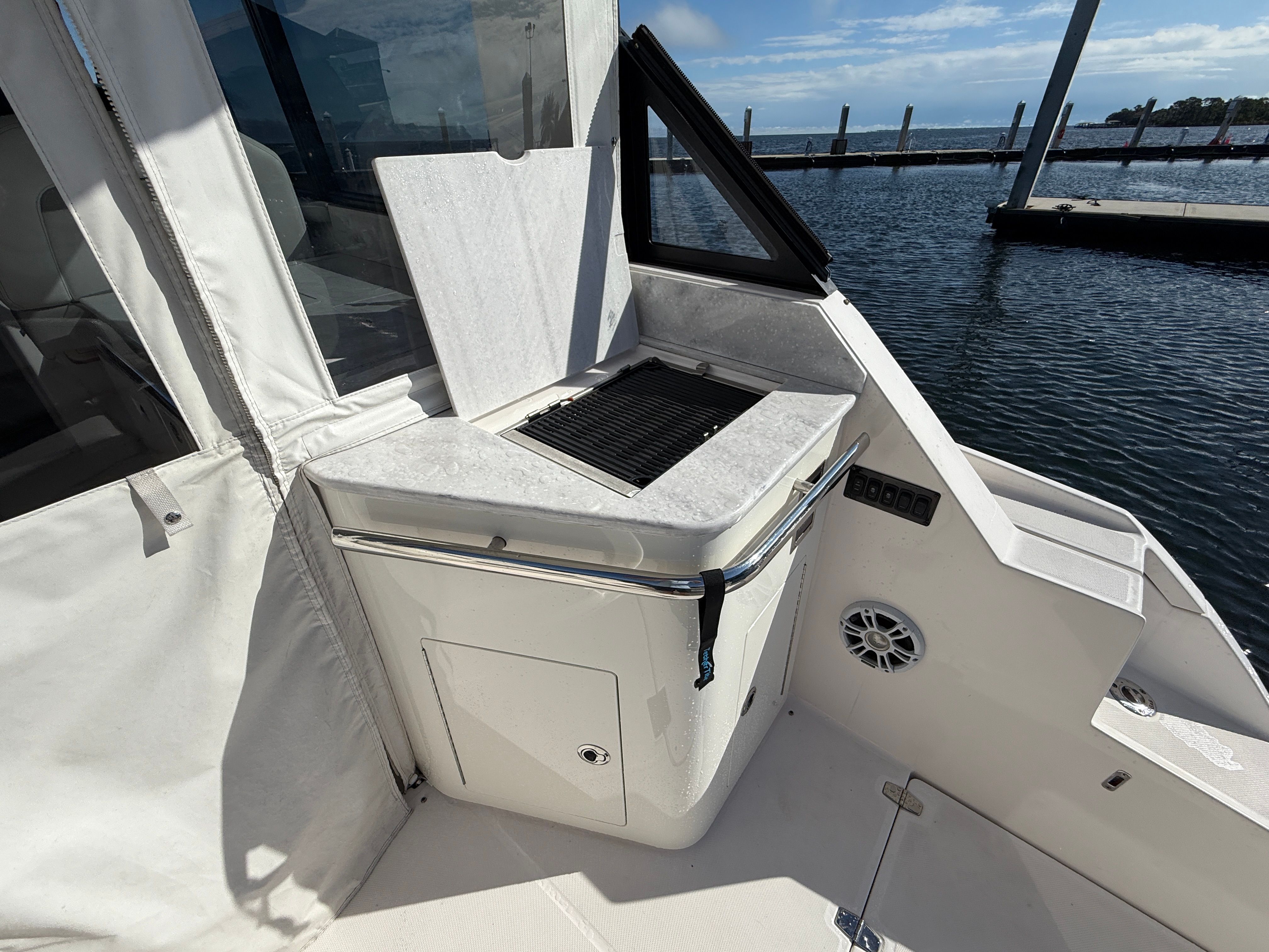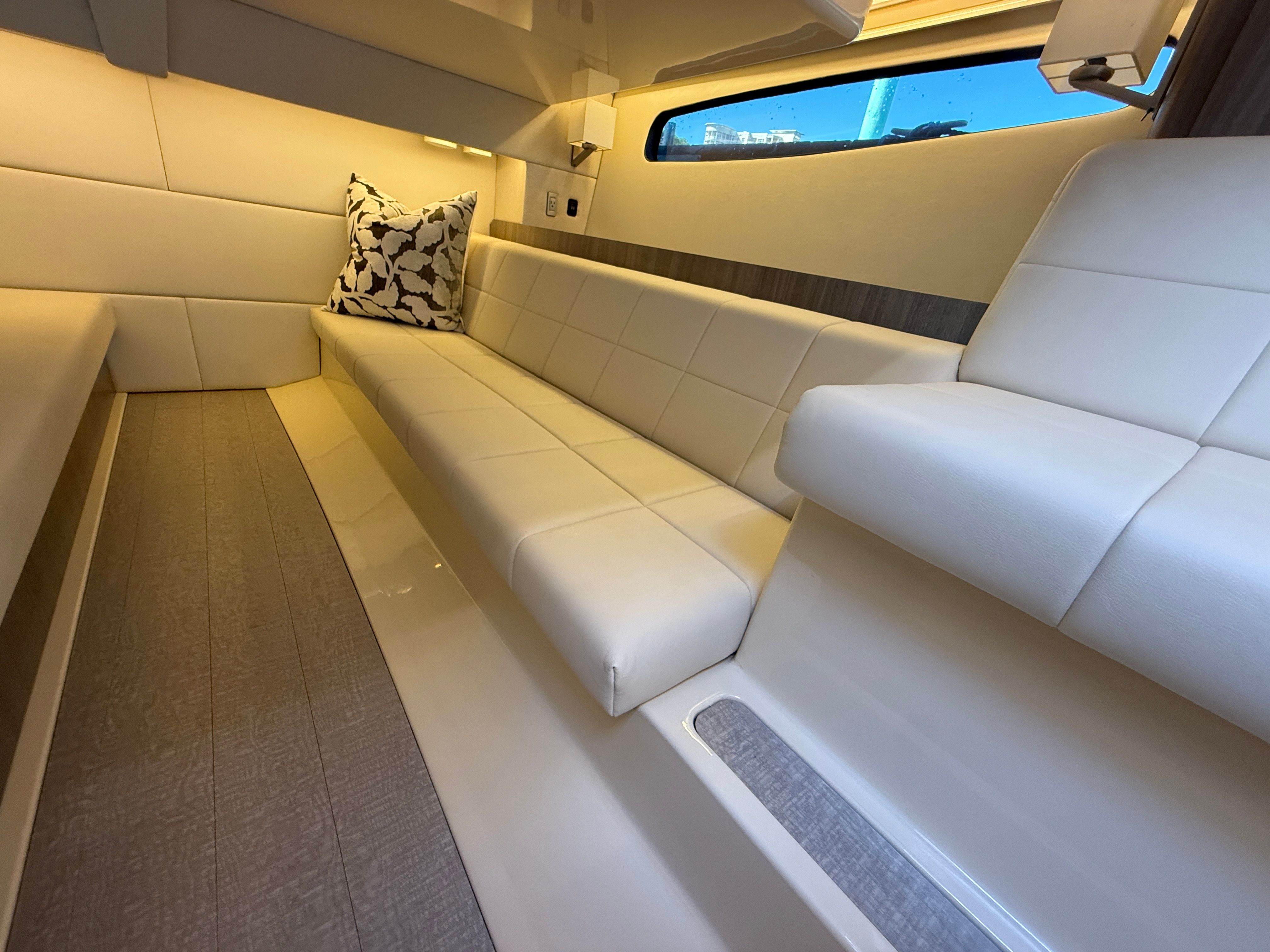 Under the hood, the 2021 Regal 36 Grande Coupe is powered by twin engines, delivering a combined 700 horsepower. With 528 engine hours, these engines have been well maintained and are ready to provide reliable performance for many more adventures. The robust powertrain ensures smooth acceleration, responsive handling, and the ability to cruise effortlessly at a variety of speeds. Whether you are navigating open waters or docking at your favorite waterfront restaurant, the 36 Grande Coupe offers the confidence and control you expect from a premium cruiser boat for sale.