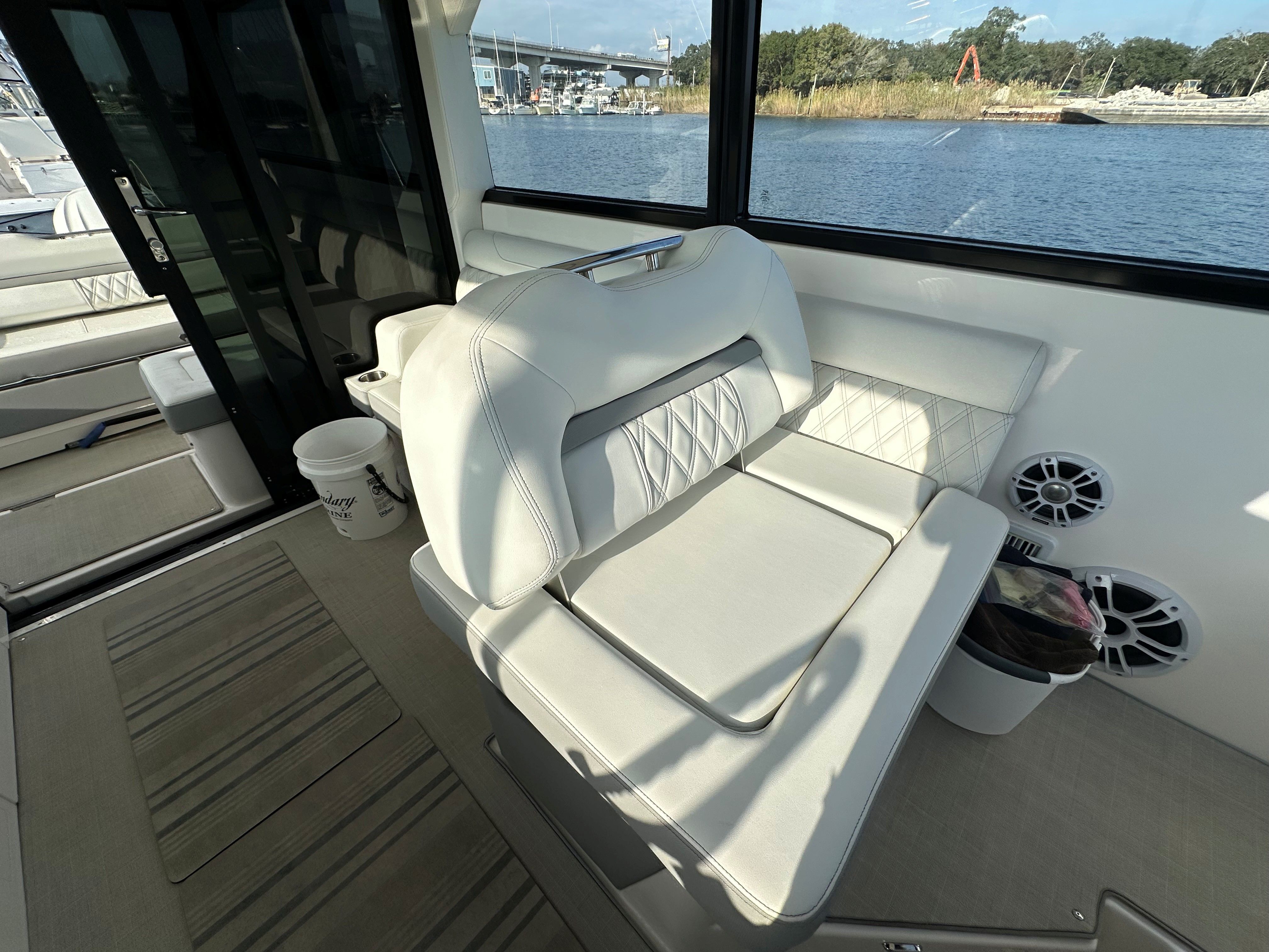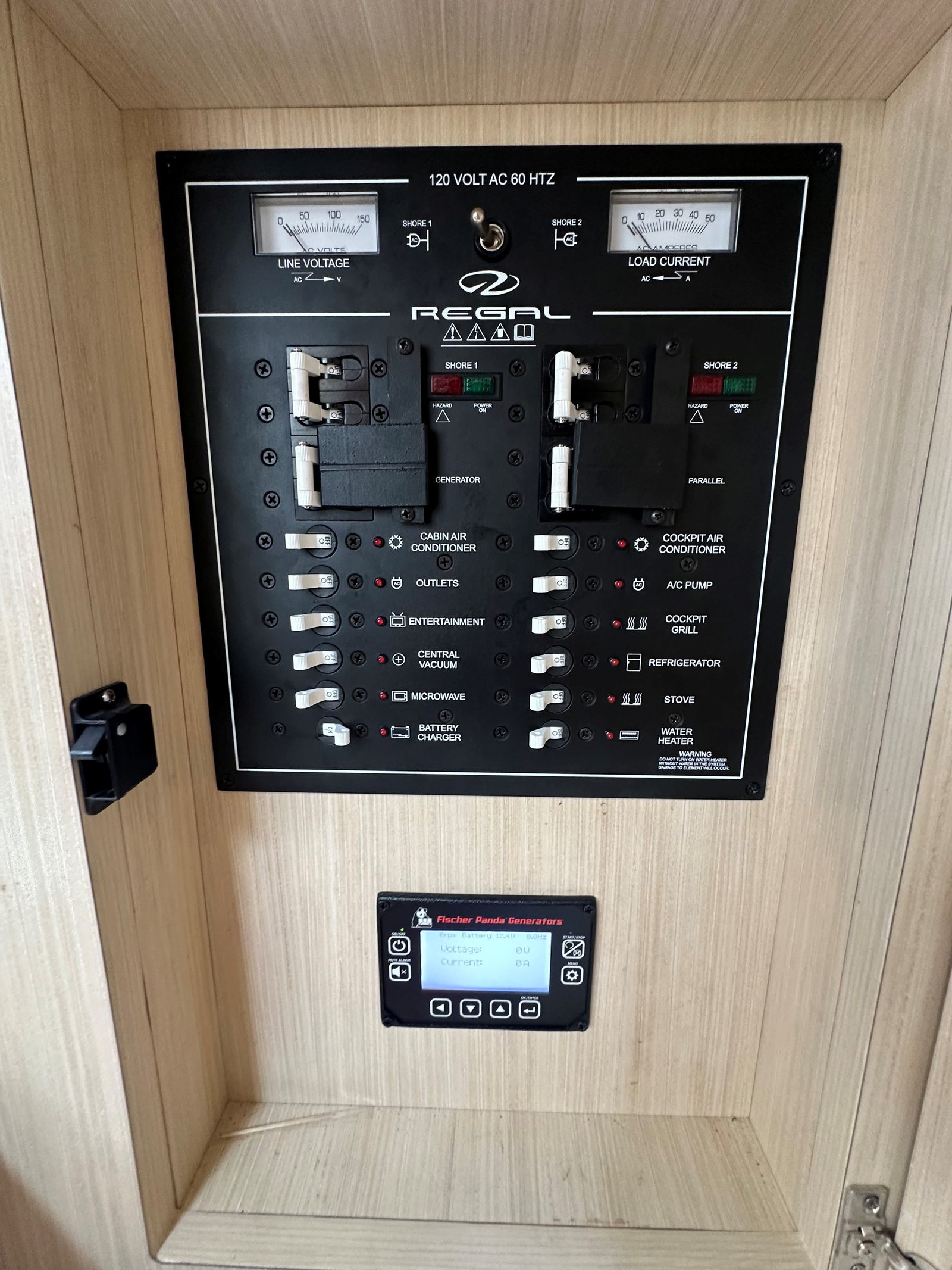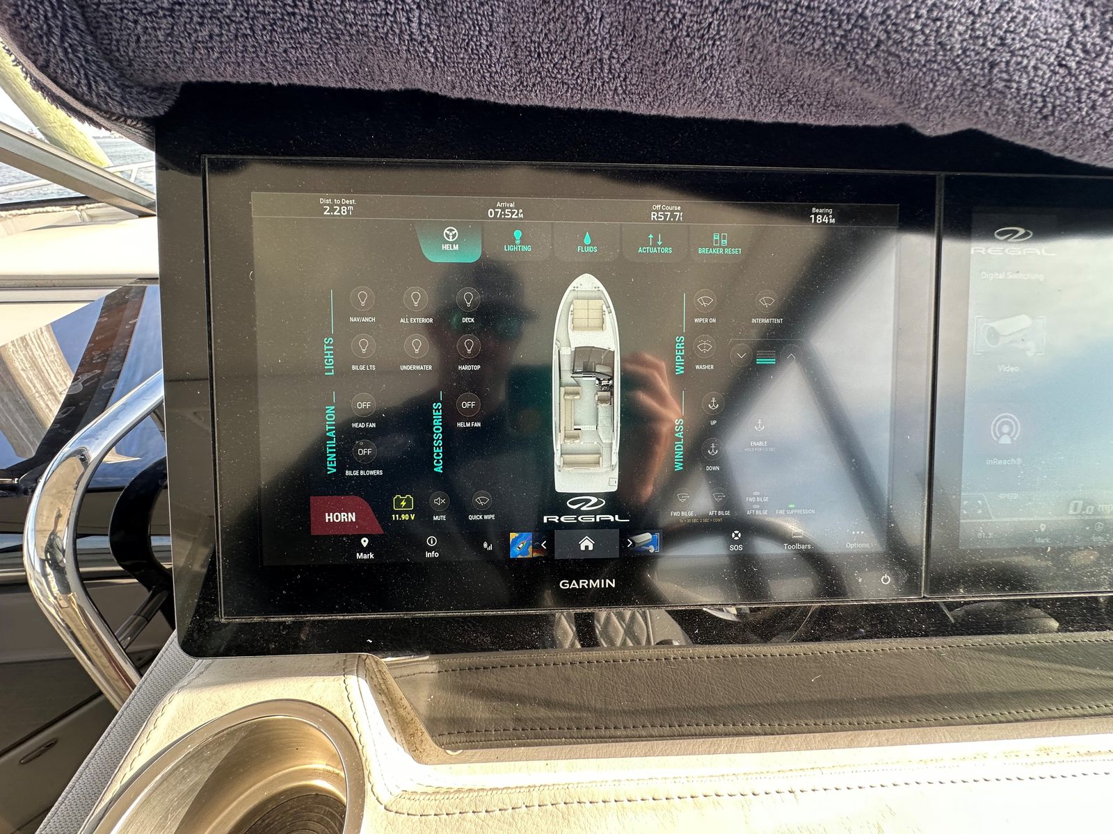 Factory Options & Upgrades: Helm & Navigation Dual Garmin 8616 multifunction displays, Regal digital switching, Garmin Radar, Garmin B60 Transducer, Garmin VHF Radio, (110V)Digital Switching System, Windlass Anchor w/ Helm & Wireless Remote Remote Control for Windlass, RGBW Lighting Package, Cockpit & Exterior Bow Sunshade, Sea Grass Floor Mat, Cockpit Freezer, Transom Seat Covers, Fender Clips, Windshield Privacy Curtain, Salon Door, Interior & Comfort Pillow Package - Neutral Color, Salon Floor - Toasted Oak Salon, Gas Vapor Detector, Central Vacuum System, Cruise Package, TV - Mid Cabin. Mechanical & Convenience, Diesel Generator (Fisher Panda - 229 hrs), Windlass Anchor w/ Remote, Bow Thruster.