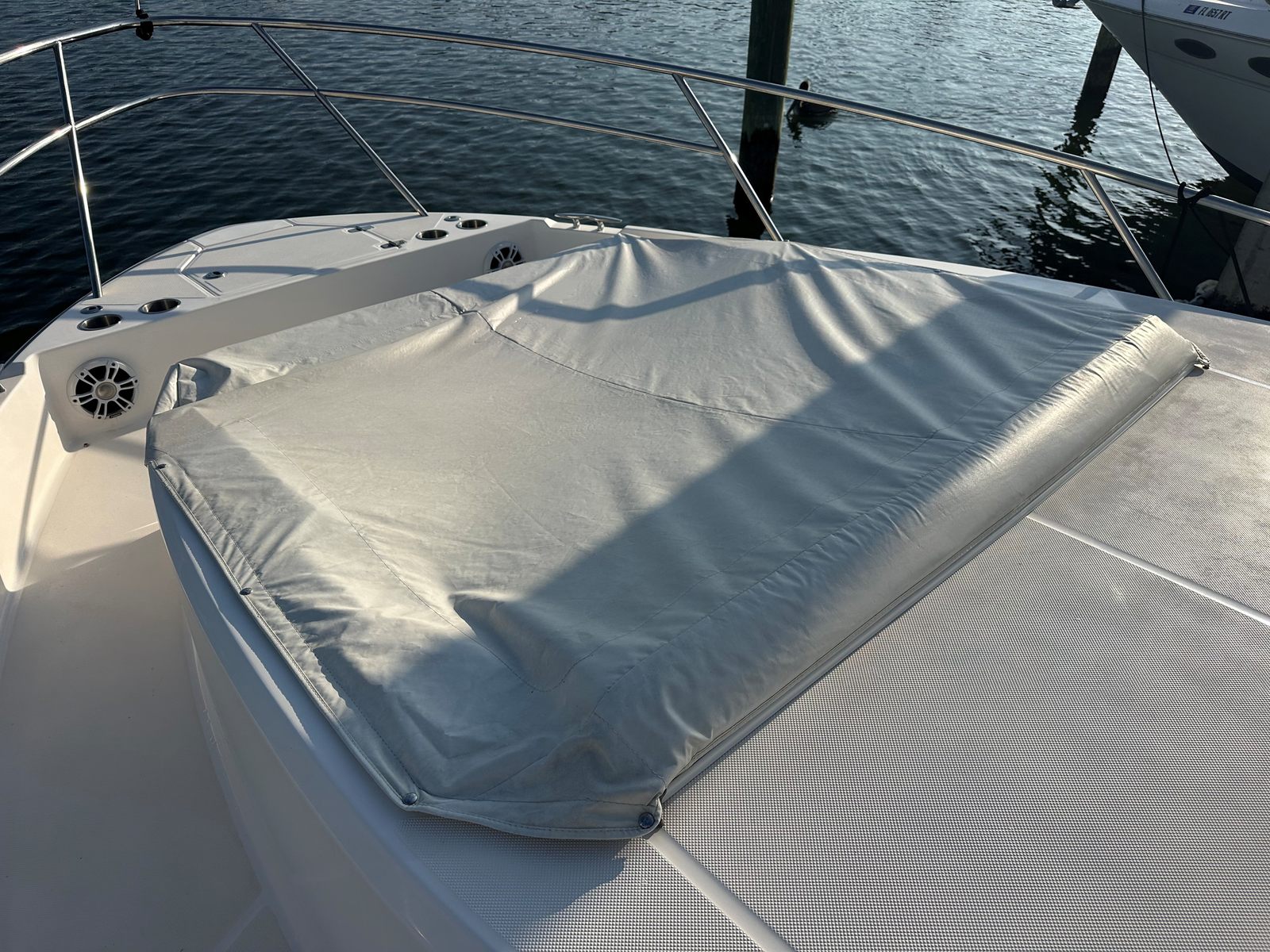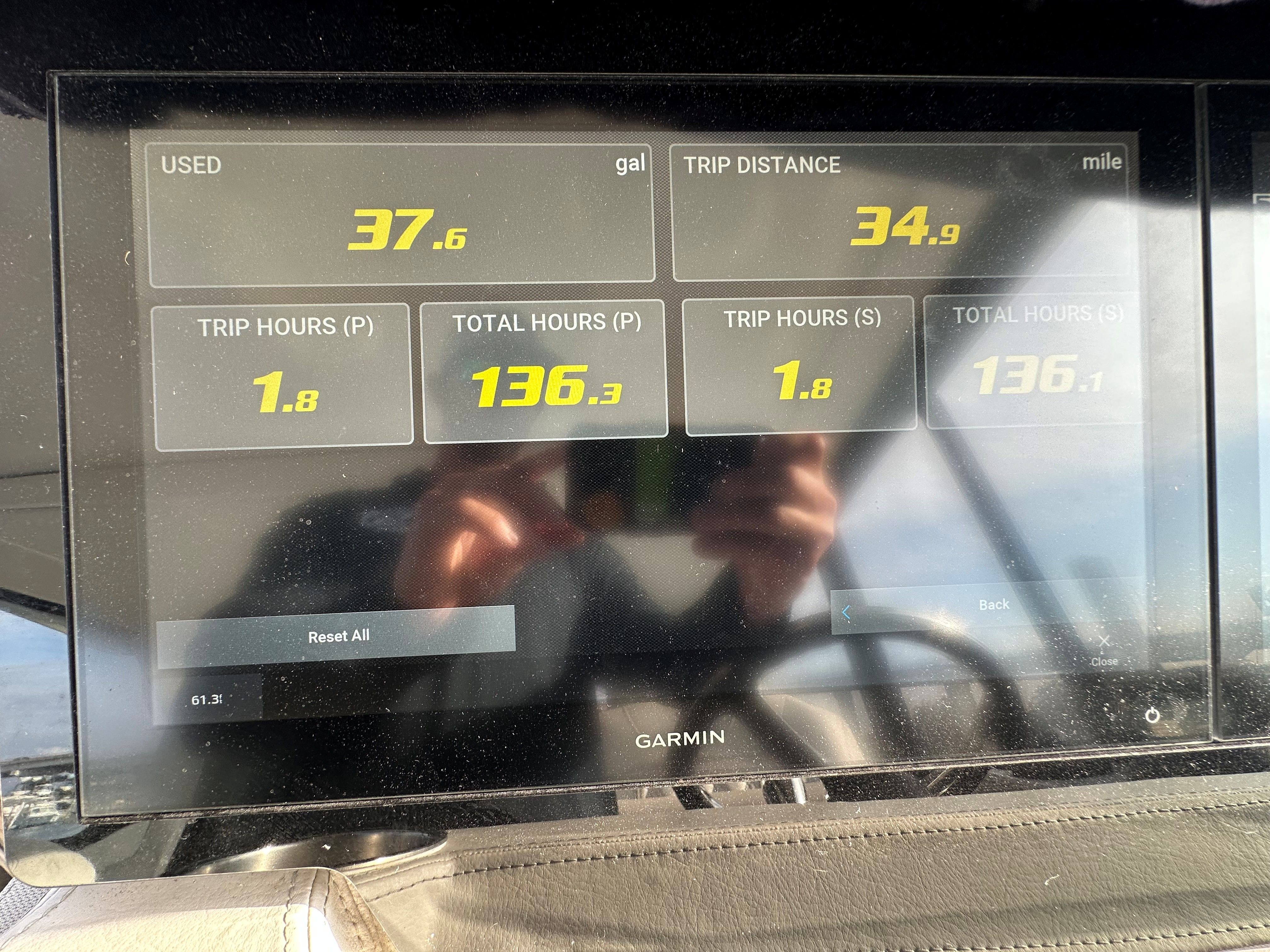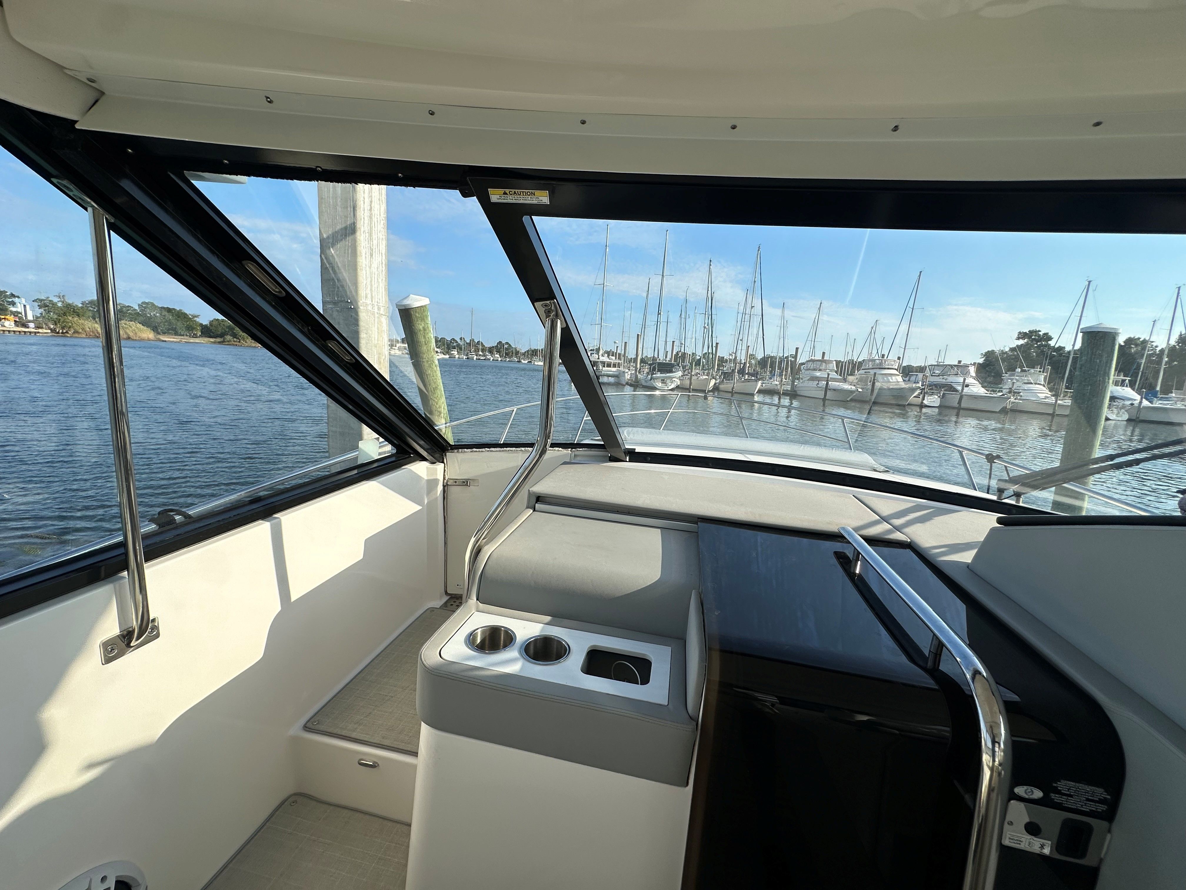 Factory Options & Upgrades: Helm & Navigation Dual Garmin 8616 multifunction displays, Regal digital switching, Garmin Radar, Garmin B60 Transducer, Garmin VHF Radio, (110V)Digital Switching System, Windlass Anchor w/ Helm & Wireless Remote Remote Control for Windlass, RGBW Lighting Package, Cockpit & Exterior Bow Sunshade, Sea Grass Floor Mat, Cockpit Freezer, Transom Seat Covers, Fender Clips, Windshield Privacy Curtain, Salon Door, Interior & Comfort Pillow Package - Neutral Color, Salon Floor - Toasted Oak Salon, Gas Vapor Detector, Central Vacuum System, Cruise Package, TV - Mid Cabin. Mechanical & Convenience, Diesel Generator (Fisher Panda - 229 hrs), Windlass Anchor w/ Remote, Bow Thruster.