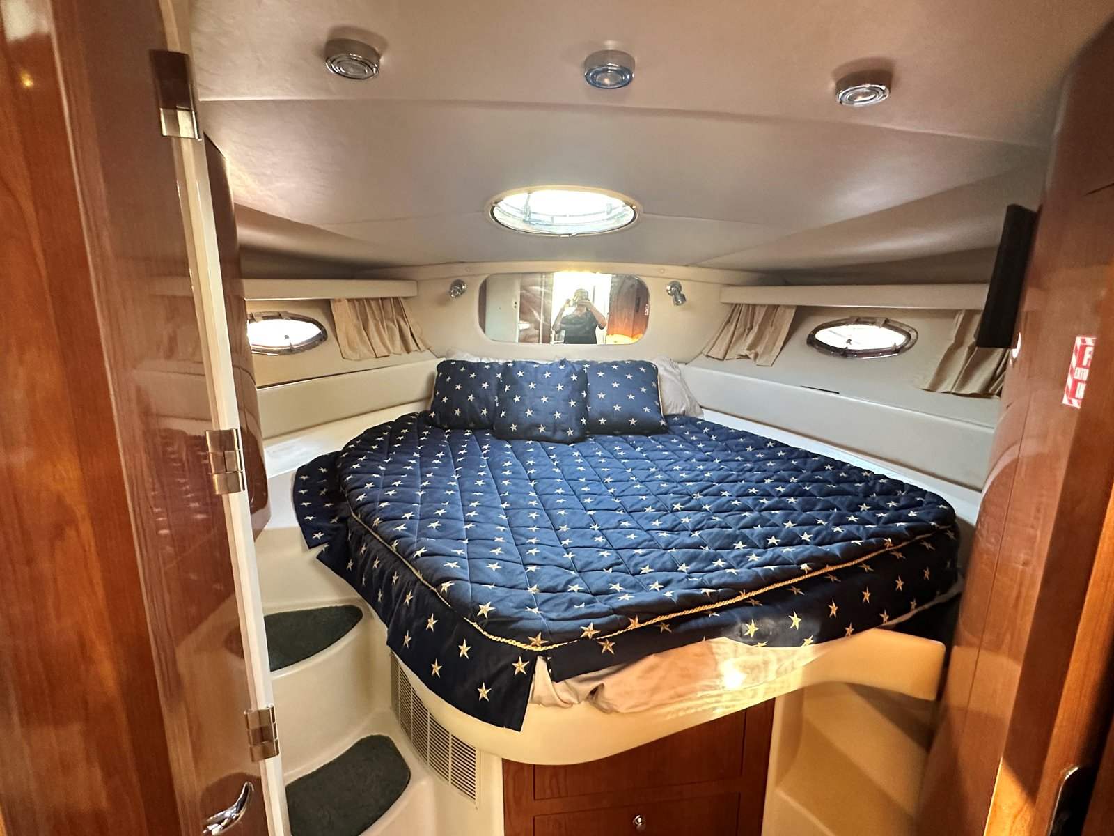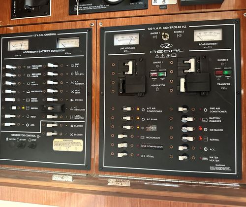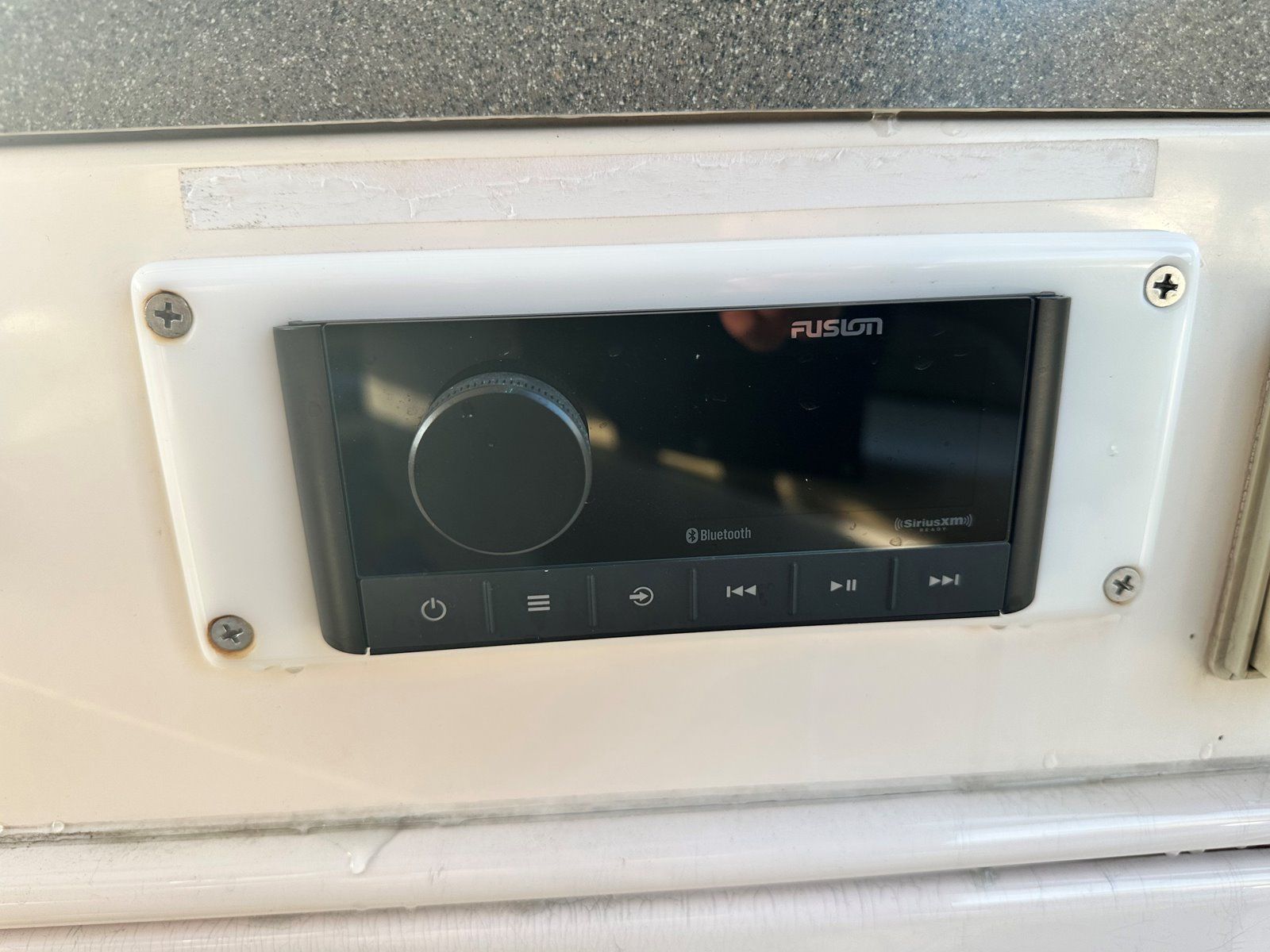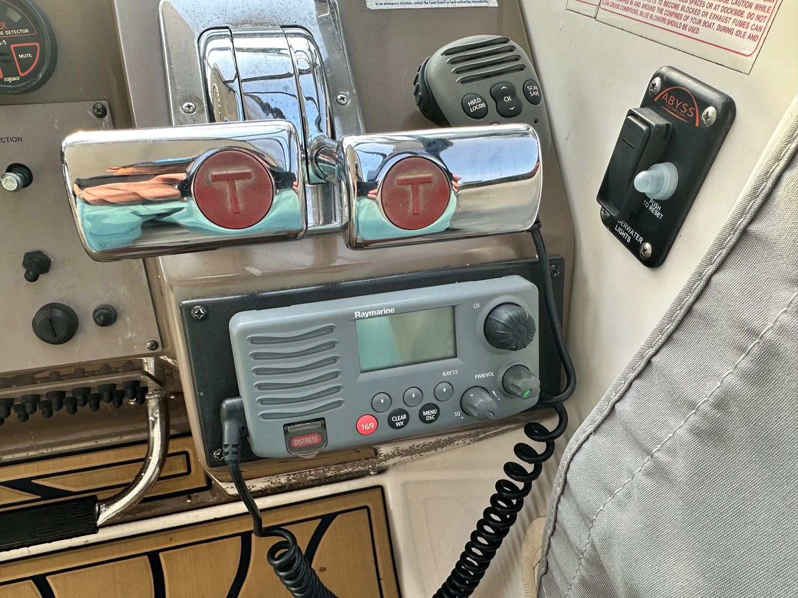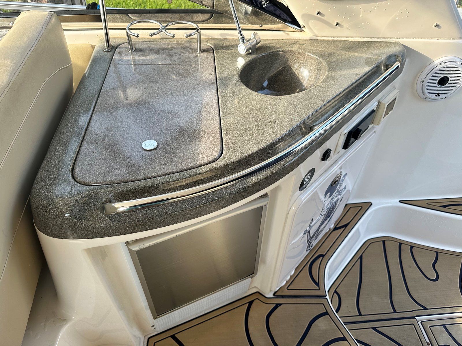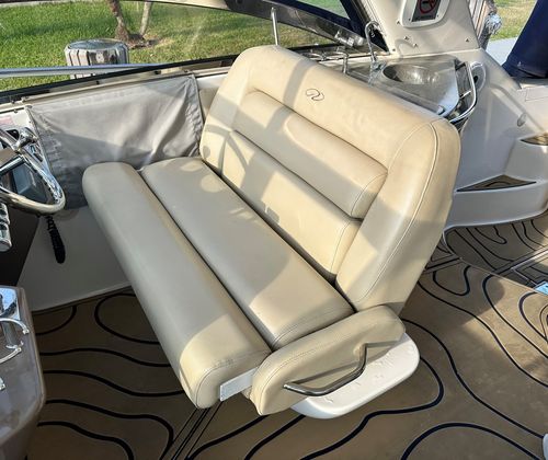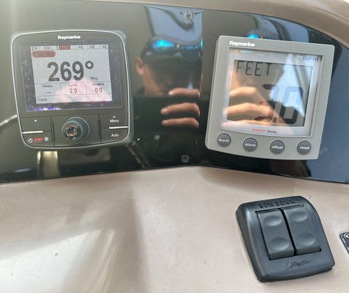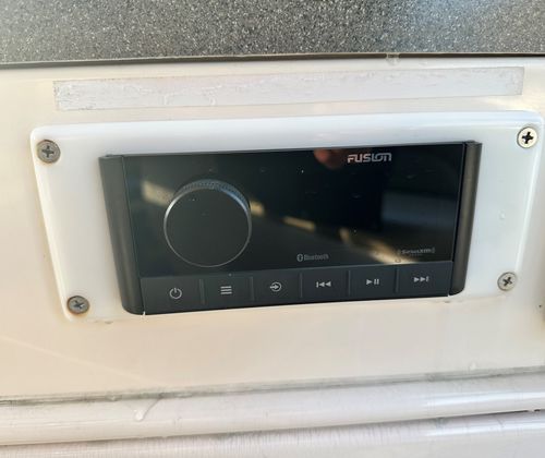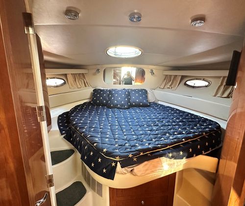 Salon • Chrome Overhead Lighting With Dimmer • Removable dinette table • Overhead Skylight Hatch With Blinds and Screen • Recliner Seating Galley • Hardwood Flooring • Corian Countertops • Stainless Steel Sink • Electric Stove (2 Burner) • Microwave • Nova Kool Refrigerator and Freezer Combo (7.5 Cubic Ft.) • 11 Gallon Waste Receptacle Forward Stateroom and Head • Inner Spring Mattress With Storage Underneath • Overhead Hatch • Two Hanging Lockers With Cedar Lining • Double-wide Sliding Privacy Door • Vacuflush Toilet • Full Fiberglass Stand-Up Head With Settee • Cultured Marble Floor • A/C Vent • Carbon Monoxide Detector Mid Cabin Stateroom and Head • Twin Beds Convert to Queen Size Berth • Overhead Vanity Cabinet • Under Mattress Storage • Full Fiberglass Head Compartment With Stand-up Shower • Vacuflush Toilet • Garmin 820xs With 8" Color Screen and HD-ID, CHIRP and DownVü with CHIRP Sonar Technology • Raymarine AutoPilot System and Depth Sounder • Raymarine VHF • Abyss Underwater Lighting • Fusion Apollo Stereo System With JL Audio and Fusion Speakers