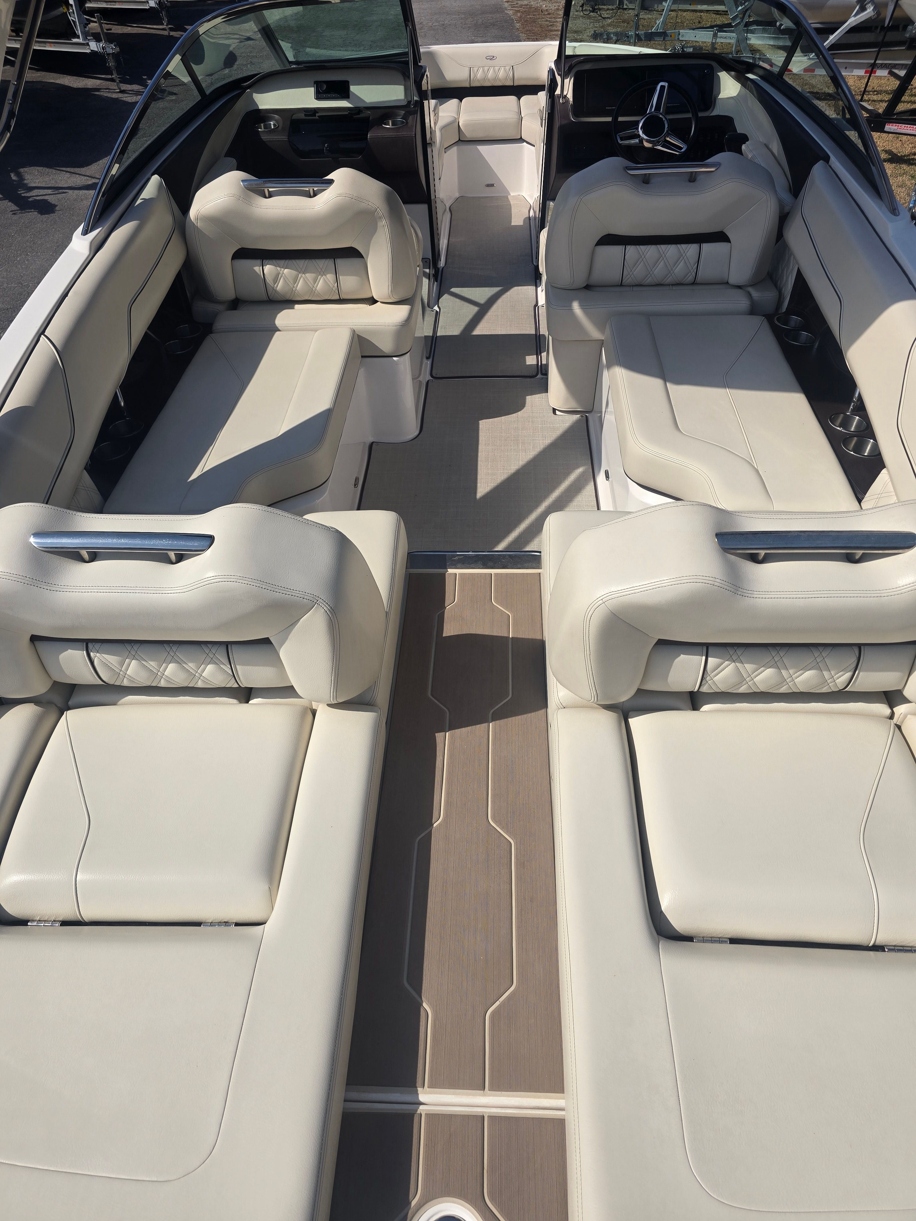 The Regal LS4 Bowrider is packed with features designed to enhance comfort, convenience, and enjoyment. The travel storage cover in black protects your investment when not in use, while the Mediterranean Blue canvas offers shade and style during sunny days. Step onto the SeaDek swim platform for a soft, slip-resistant surface that makes swimming and water sports safer and more enjoyable. The cockpit seagrass mat adds a touch of luxury underfoot, creating a welcoming space for lounging and socializing. With the dual battery switch and tray, you’ll have peace of mind knowing your boat is equipped for extended outings and reliable starts.