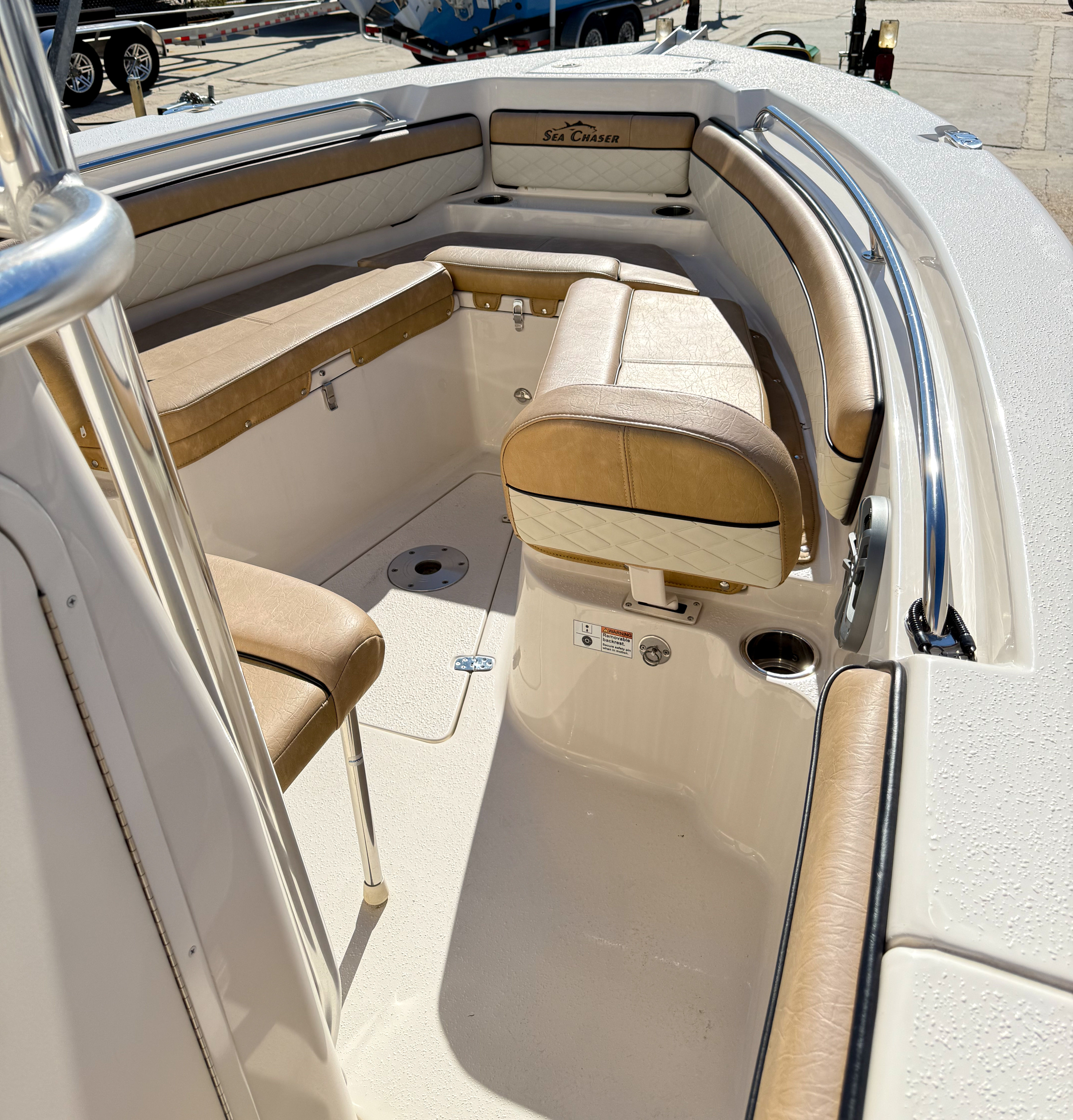 Practicality is at the heart of the Sea Chaser 24 HFC’s design. The boat’s manageable length makes it easy to dock, trailer, and store, reducing the hassle of ownership and allowing you to spend more time on the water. The efficient dual-engine setup not only delivers impressive power but also helps optimize fuel consumption, making your adventures more economical.Storage is another strong point of the Sea Chaser 24 HFC. The well-thought-out layout provides plenty of space for stowing gear, tackle, and personal items, keeping the deck clutter-free and organized. The center console configuration also makes it easy to access all areas of the boat, whether you are preparing for a fishing trip or setting up for a day of water sports.