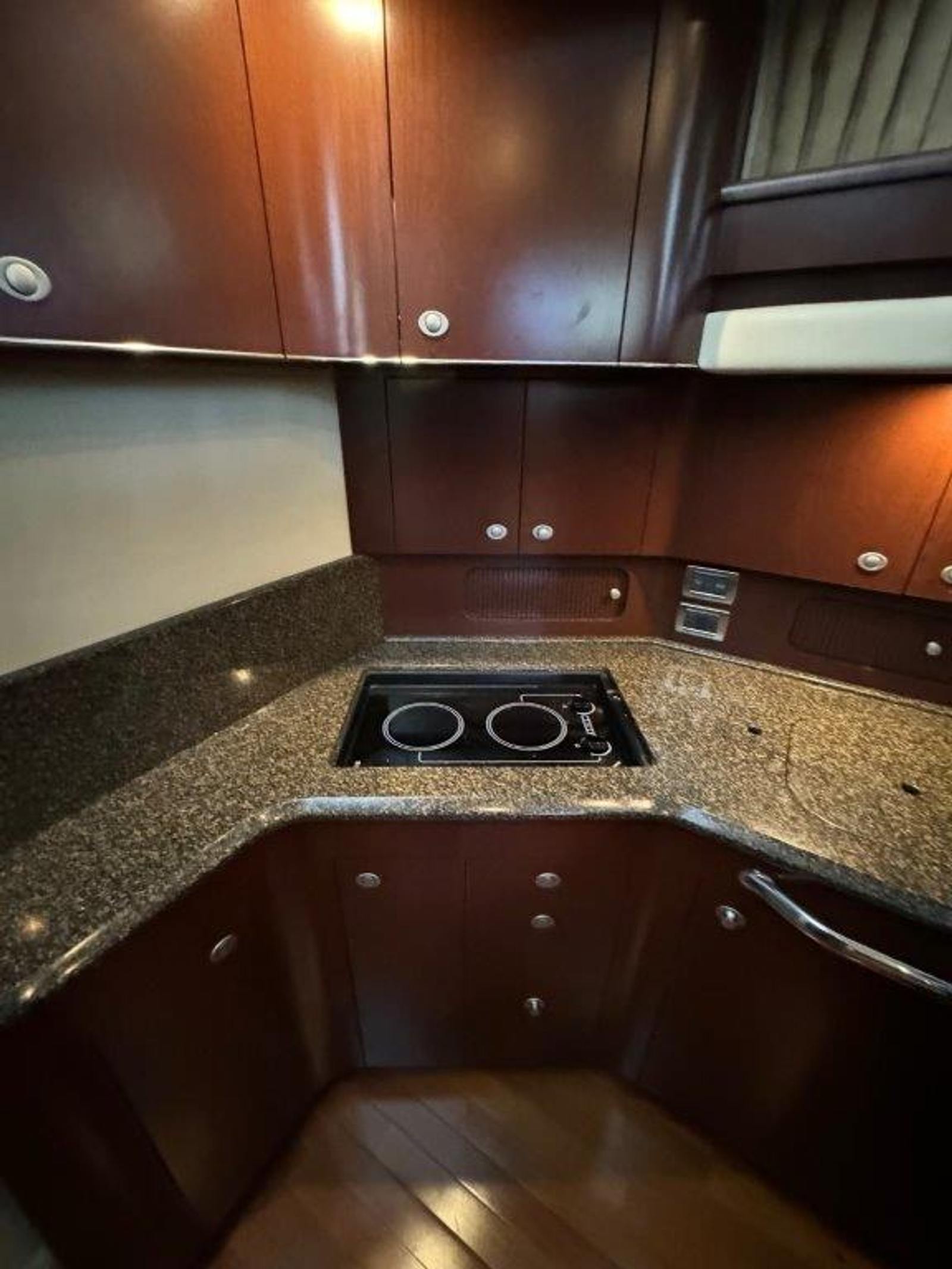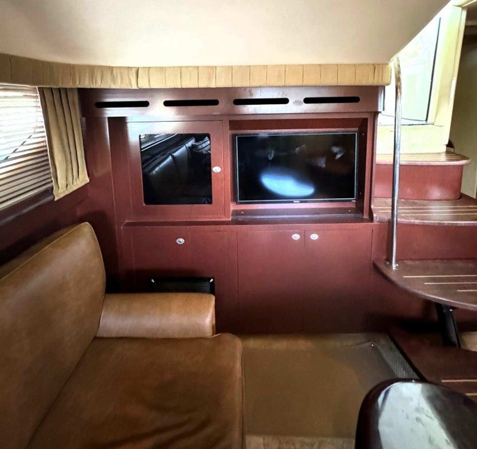 The salon is bright and open, perfect for entertaining, with a fully equipped galley that will please any onboard chef. Head up to the fully enclosed bridge, where A/C and heating let you cruise in comfort year-round — all while enjoying panoramic 360° views.