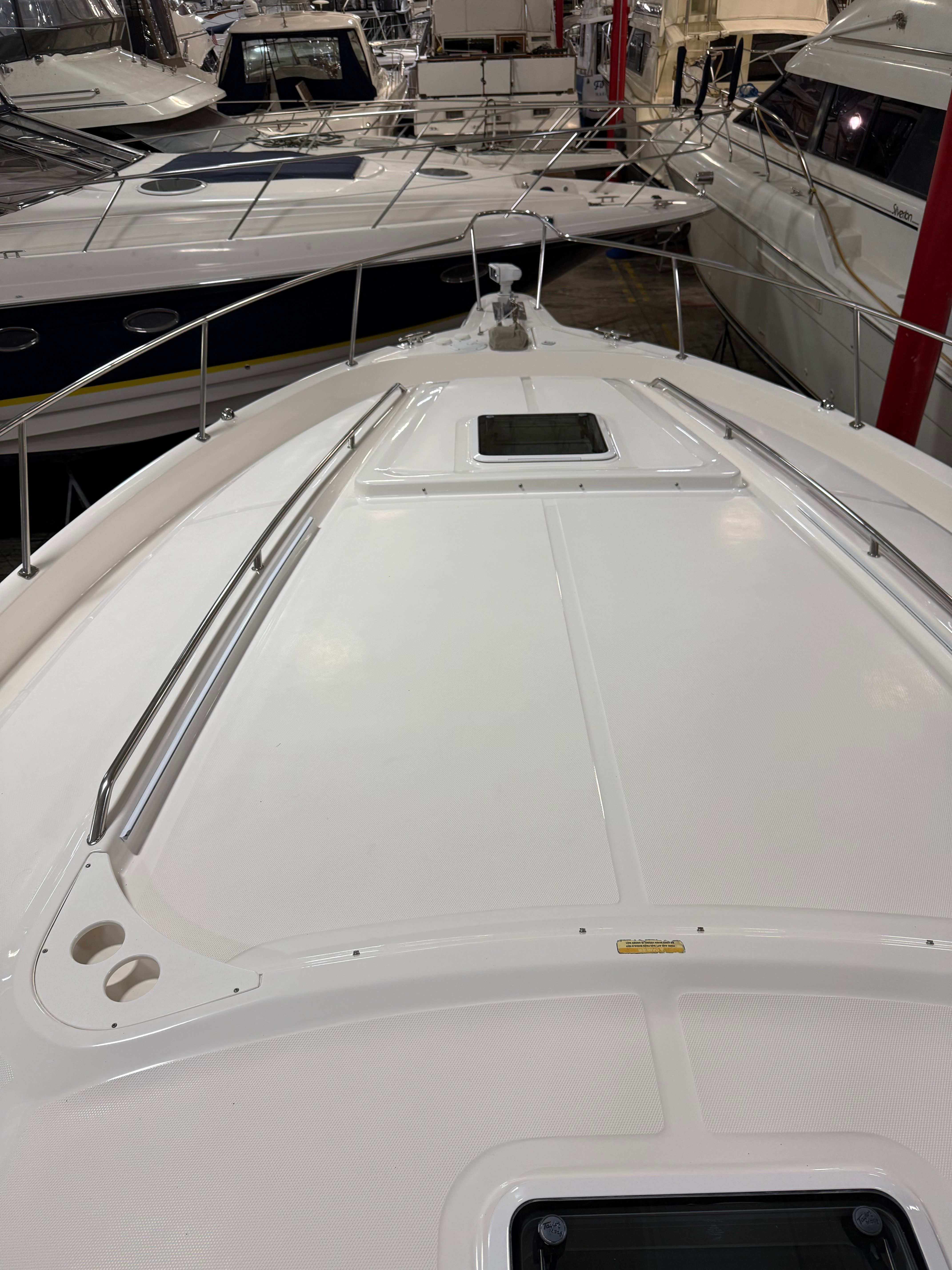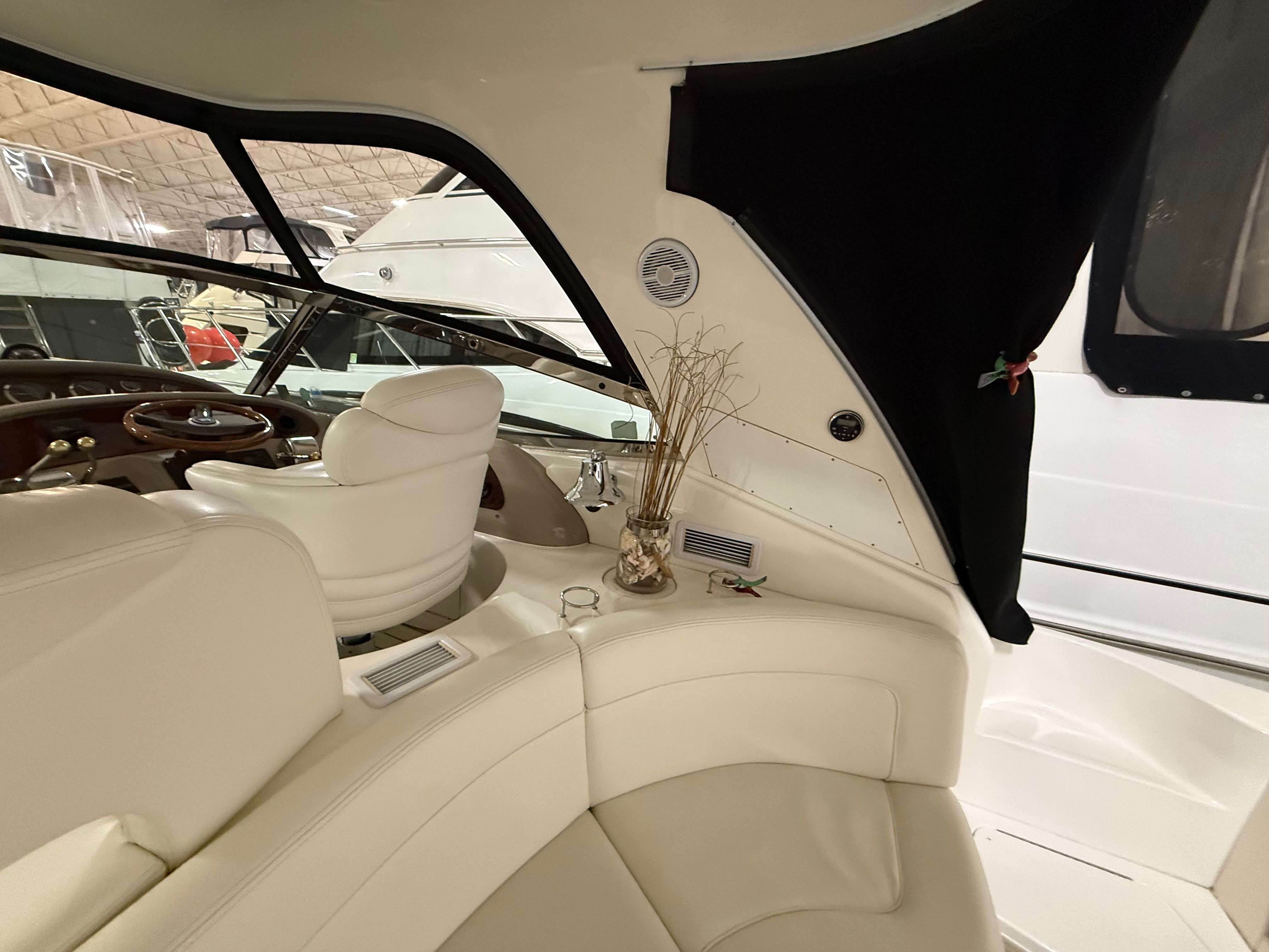 The 460 Sundancer is as practical as it is stylish. The five-battery system and battery charger provide peace of mind, ensuring your boat is always ready for action. The electric engine hatch streamlines maintenance, while the cockpit coaming bolsters and carpet enhance safety and comfort. The extended swim platform makes water sports, swimming, and boarding the boat a breeze, adding to the overall convenience and enjoyment of ownership.Docking and maneuvering are made easier by the boat’s responsive handling and well-designed layout. The hard top offers protection from sun and rain, allowing you to make the most of your time on the water, regardless of the conditions. Whether you are planning a day trip or a weekend getaway, this bowrider boat for sale is equipped to handle all your boating needs.