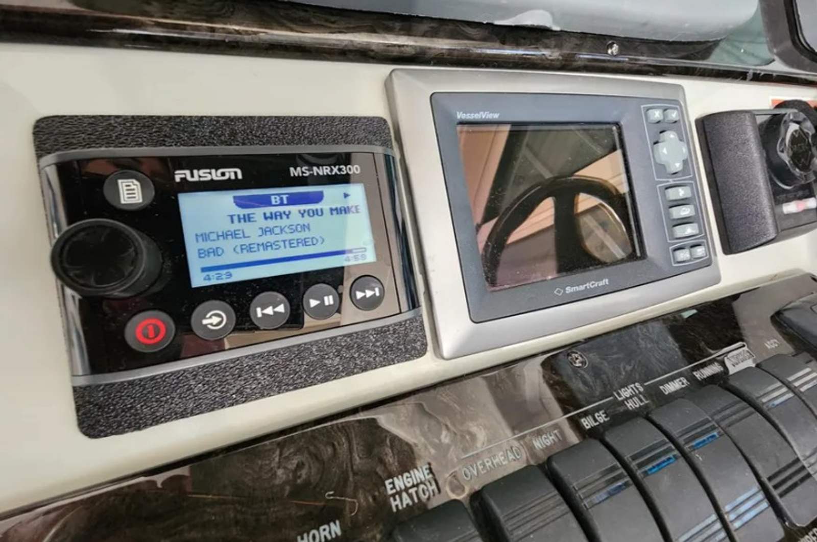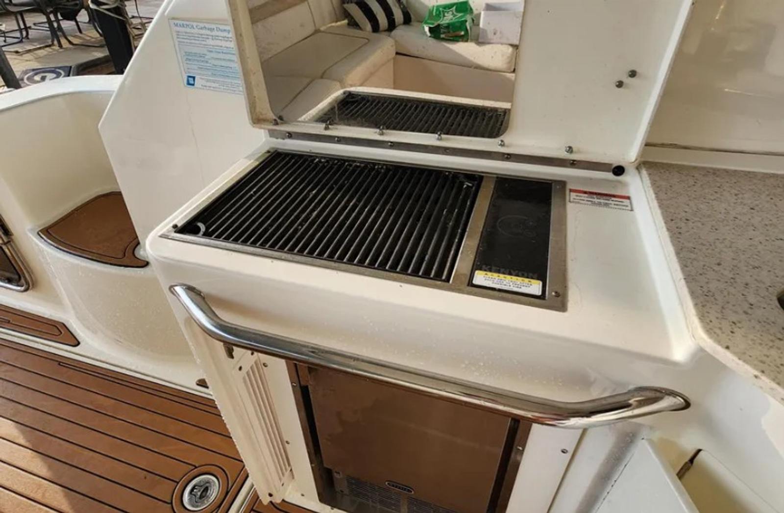 Powered by twin Cummins QSB 480 diesel engines with pod drives, this Sundancer delivers confident performance and remarkable joystick maneuverability, especially in tight spaces or while docking. Both pods have been recently serviced. The engines have approximately 800 hours, and the 15kW Onan generator has around 600 hours, with recent service completed. The boat has also been buffed and waxed on all fiberglass surfaces.
