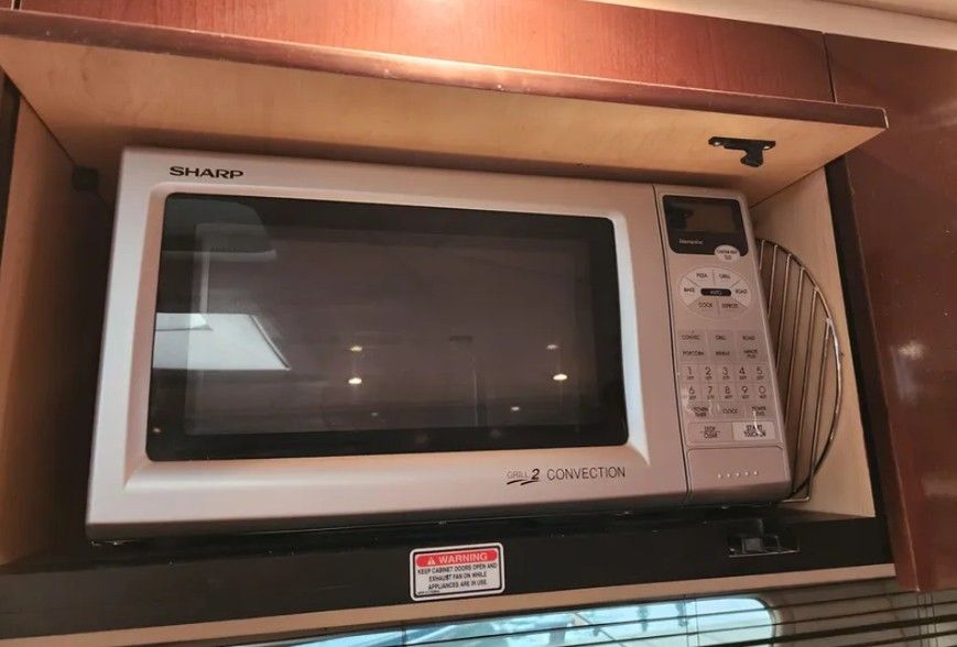 The galley is fully equipped for extended stays, featuring a two-burner stove, microwave/oven combo, oversized sink, Corian countertops, abundant cabinetry and drawers, and a new full-size refrigerator and freezer. The interior layout offers two staterooms and two heads. The master suite includes a queen berth with upgraded gel topper, dual cedar-lined closets, and a private head with separate shower and vanity. The guest stateroom features a convertible twin-to-queen berth, private head with shower and sink, a closet, and ample storage.