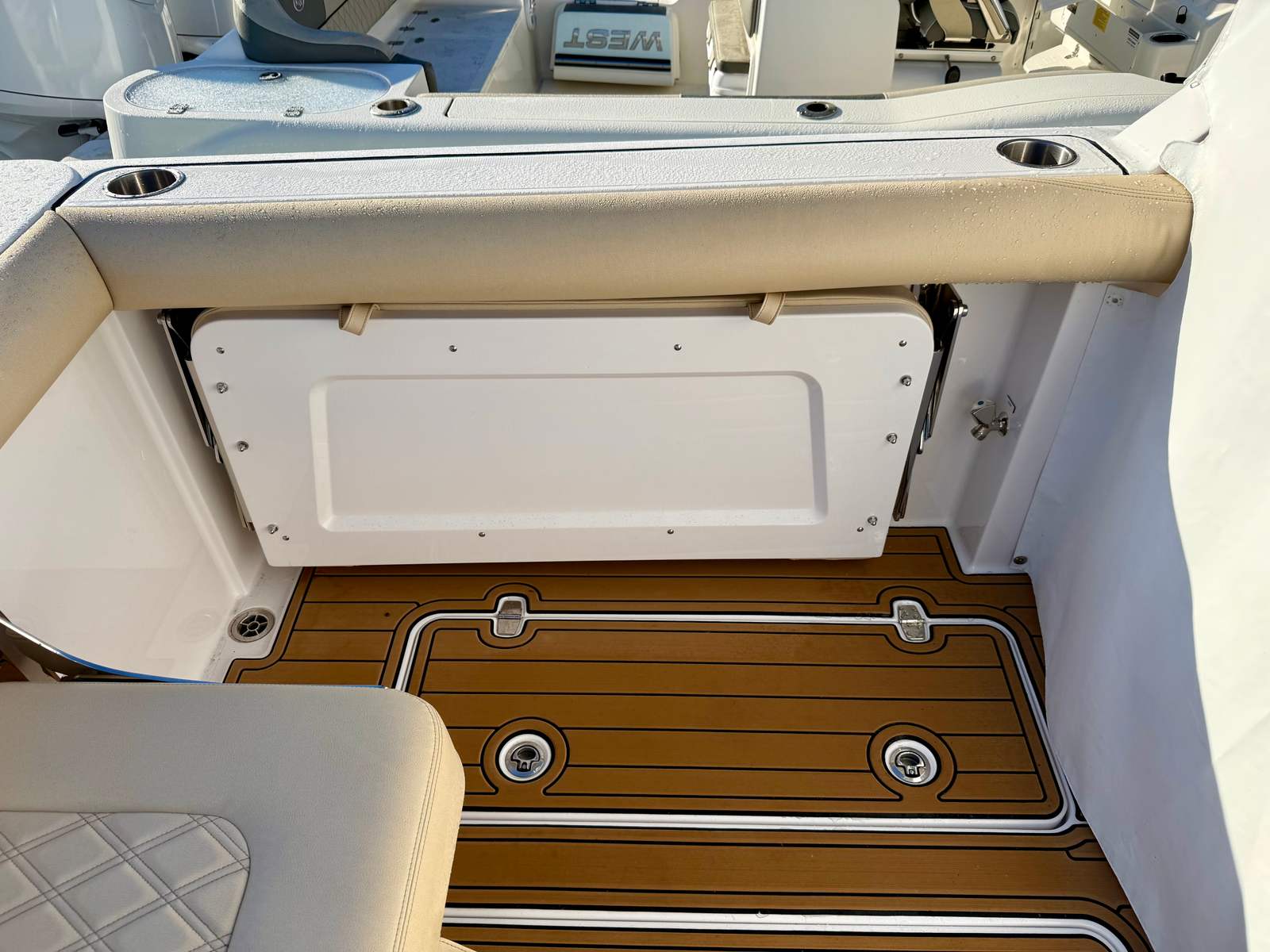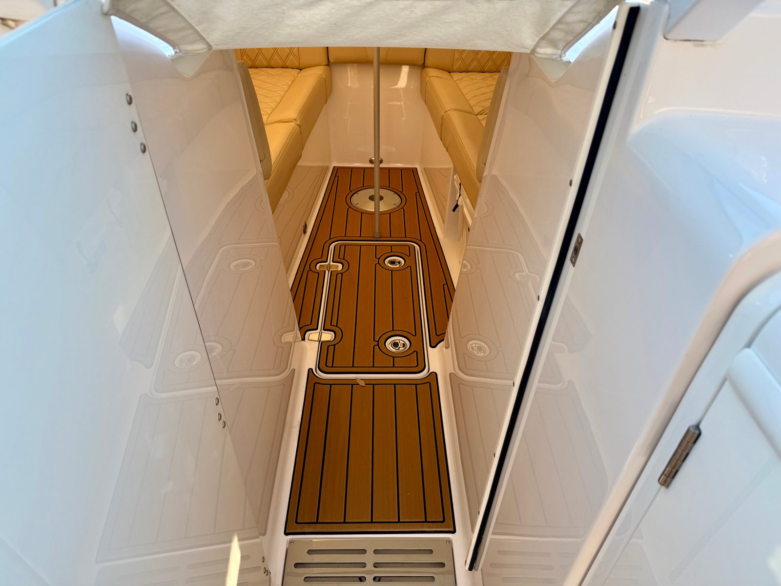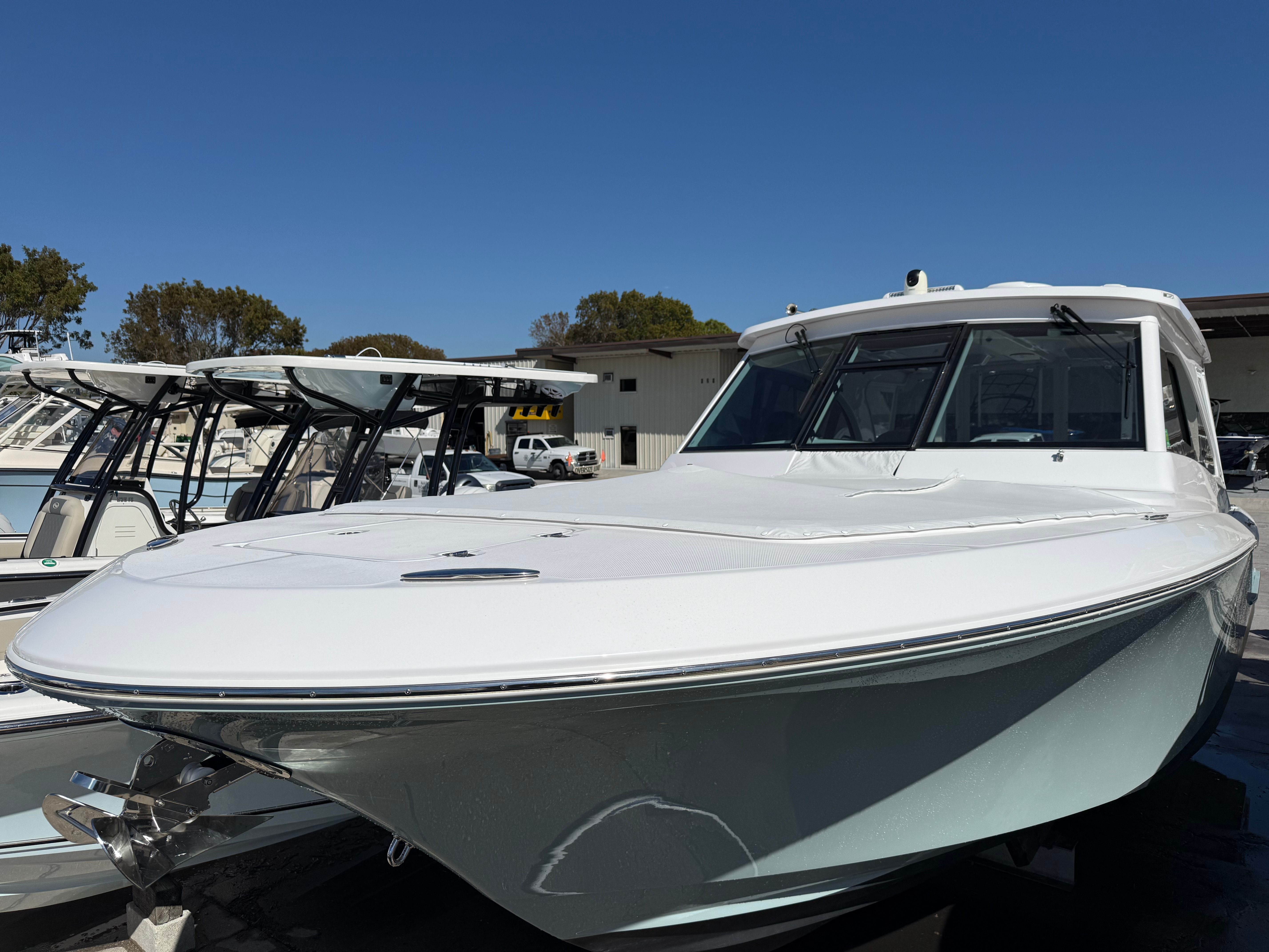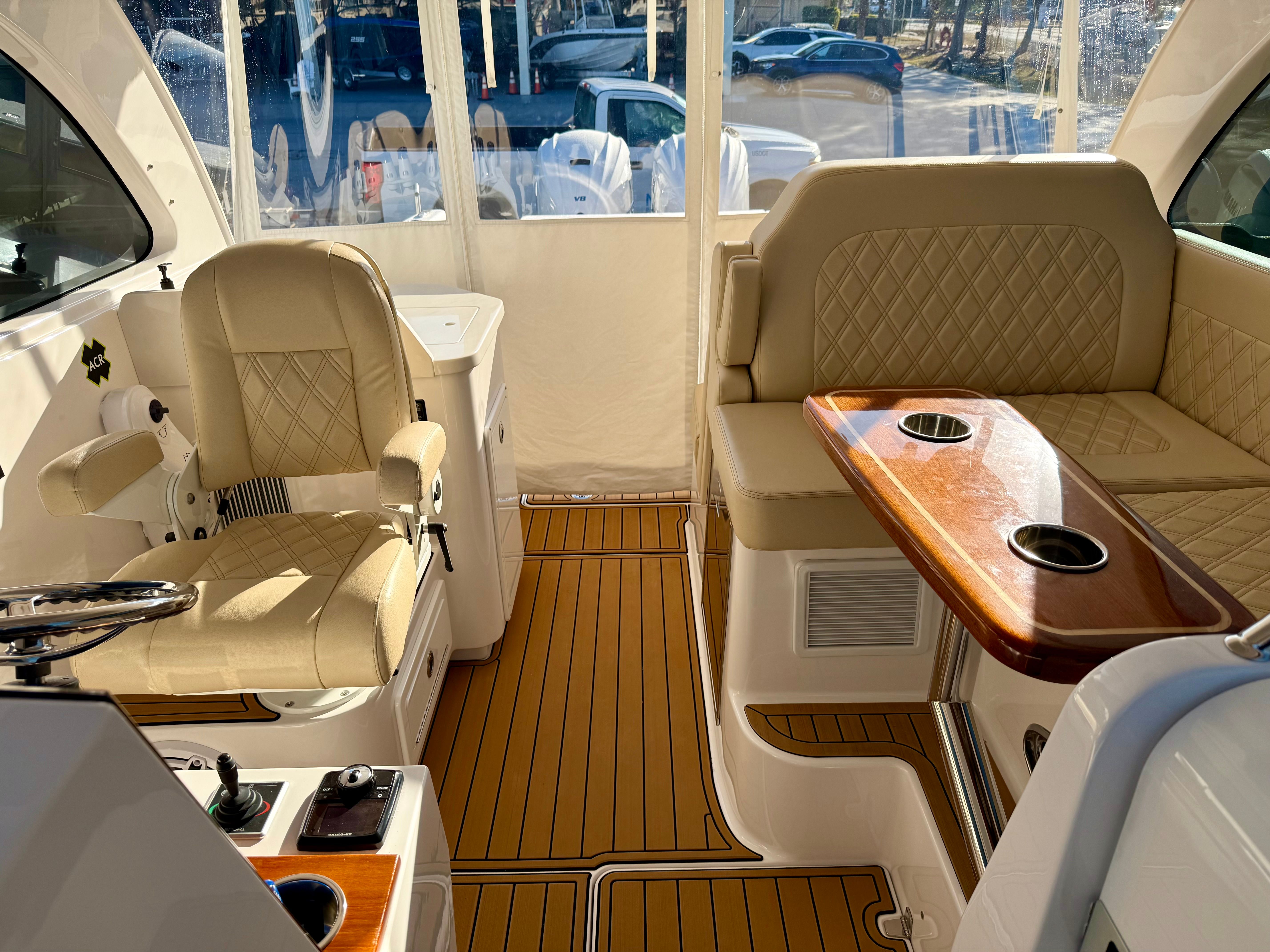 At the helm, you’ll find twin Garmin 16-inch navigation displays with integrated sonar, offering crystal-clear charts, fishfinding capability, and full system integration. A Garmin radar system enhances visibility and safety when running offshore or navigating in limited visibility, and the onboard autopilot allows for stress-free cruising on longer runs. Entertainment is handled by a premium Fusion stereo system with bow-to-stern speakers, delivering rich, balanced sound whether you’re entertaining at anchor or underway.
