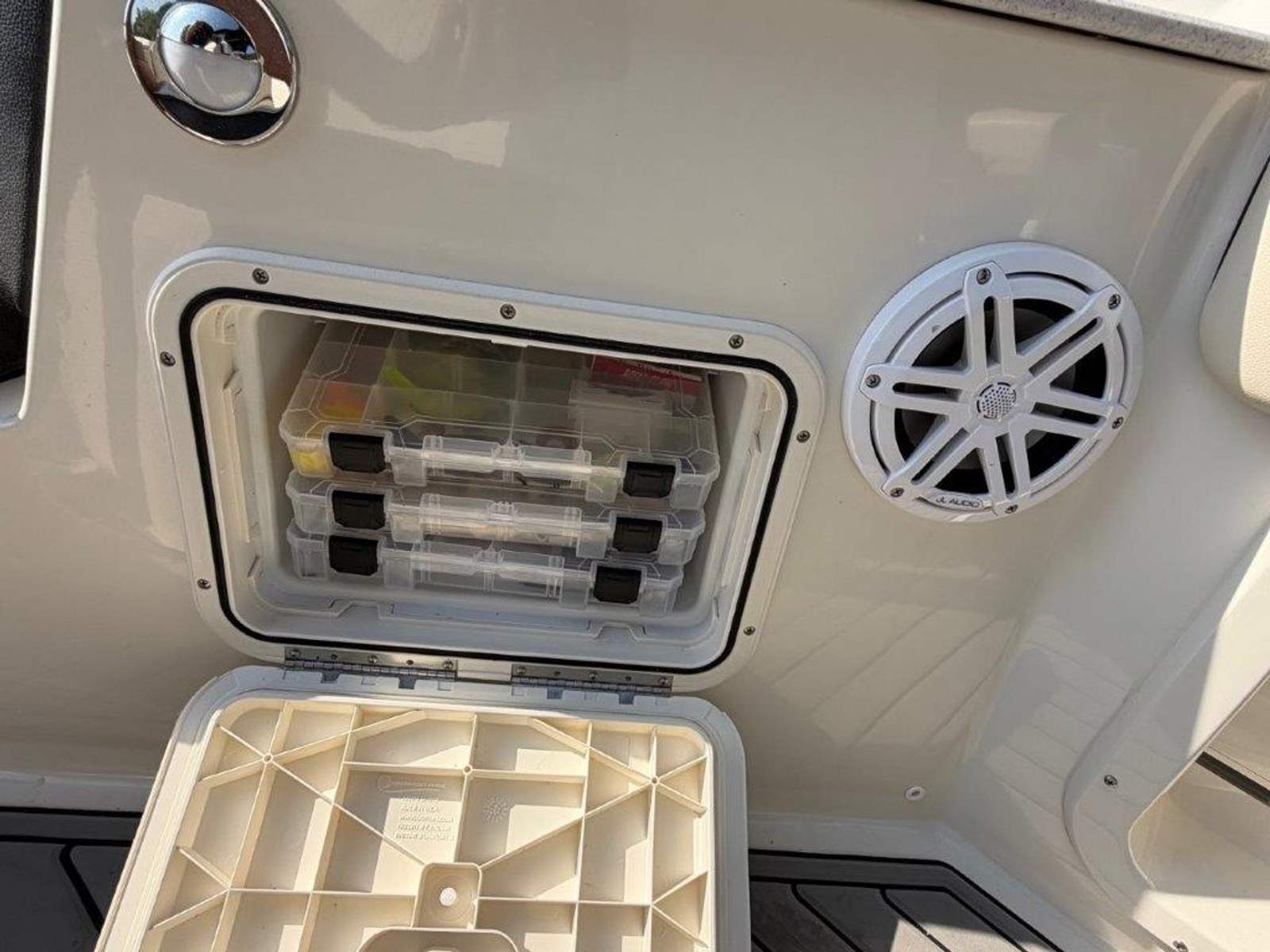 Additional highlights include a self-bailing cockpit, bow seating with cushions, stainless pop-up cleats, raw water washdown, underwater lights, blue LED accent lighting, swim platform, ski tow bar, and a large helm storage compartment that includes a porta potti/changing space. Smart storage is built into the design so the deck stays clean and uncluttered even on longer days out.