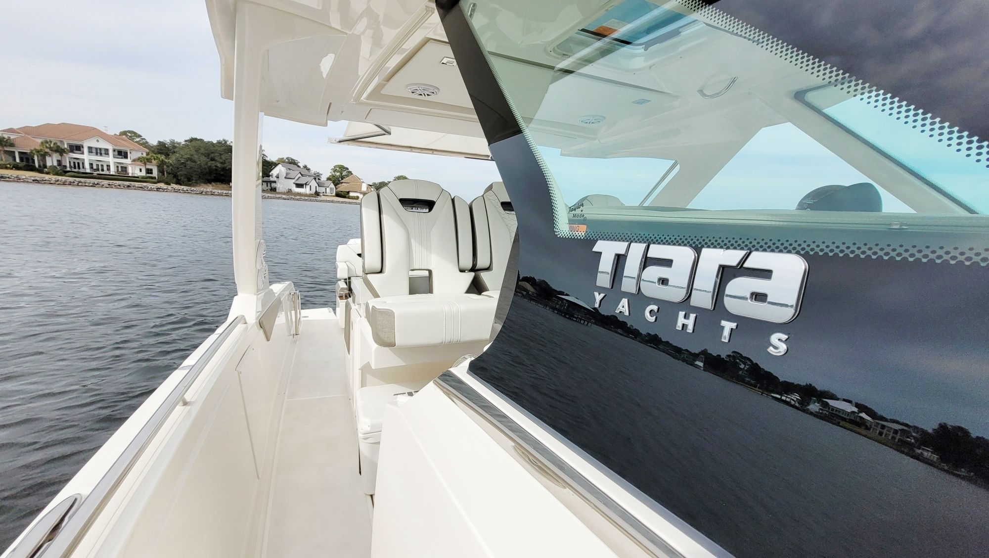 The space and layout is amazing, the comfortable forward bow seating with optional forward Mediterranean sunshade flows seamlessly to the superb helm area with center helm flanked by comfortable seats to both port and starboard. She has been equipped with an extensive electronics package with Garmin glass cockpit electronics , Tiara Premium Stereo system, remote hardtop mounted spotlight and Sirius Satellite weather and radio.