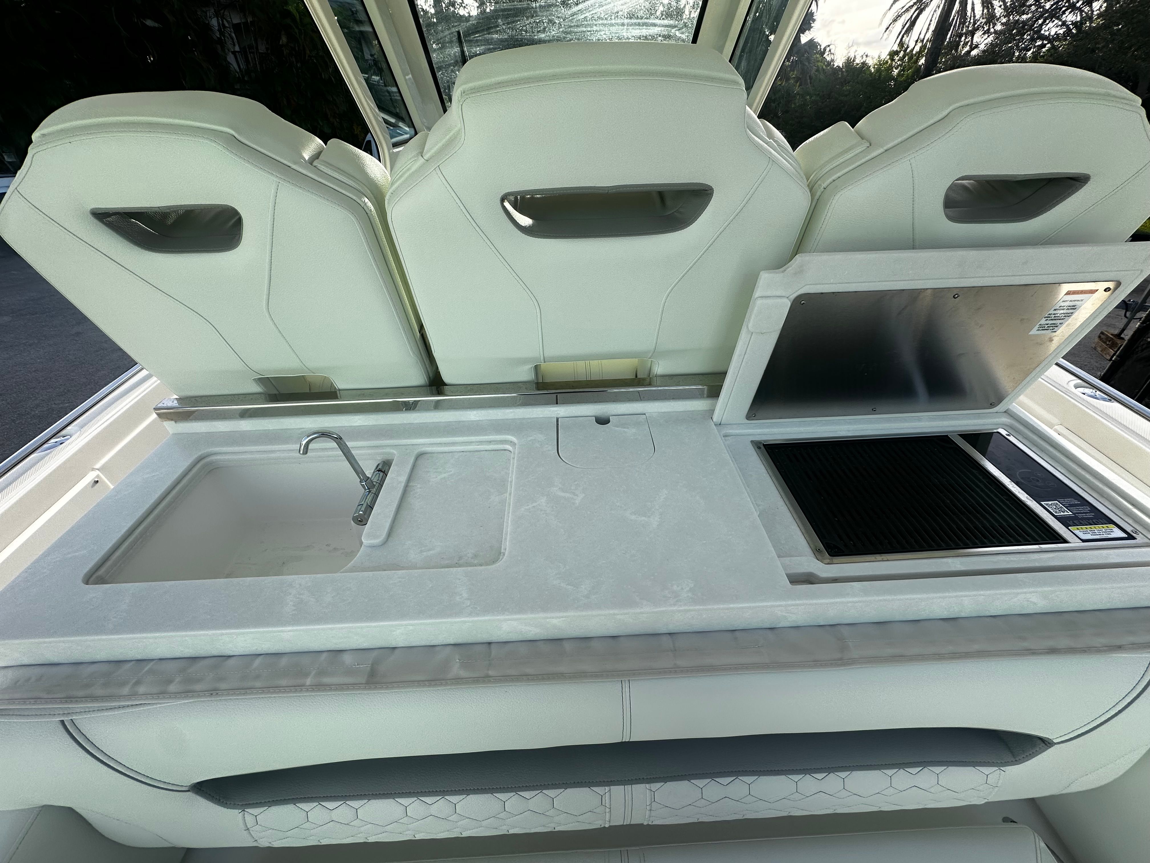 The Tiara Yachts 34 LS is as practical as it is luxurious. Its manageable size and advanced piloting system make docking and storage hassle-free, whether you are keeping your yacht at a marina or a private dock. The efficient twin engine setup ensures you can cover more water with less fuel, making longer trips and spontaneous getaways more accessible. The raw water washdown system simplifies post-adventure cleanup, while the rocket launchers provide organized storage for fishing gear, keeping the deck clutter-free.The additional Garmin 12-inch display enhances your navigation capabilities, offering clear and detailed information to help you chart your course with confidence. The solid surface materials used throughout the yacht are not only visually appealing but also resistant to wear and easy to clean, ensuring your investment remains in top condition for years to come.