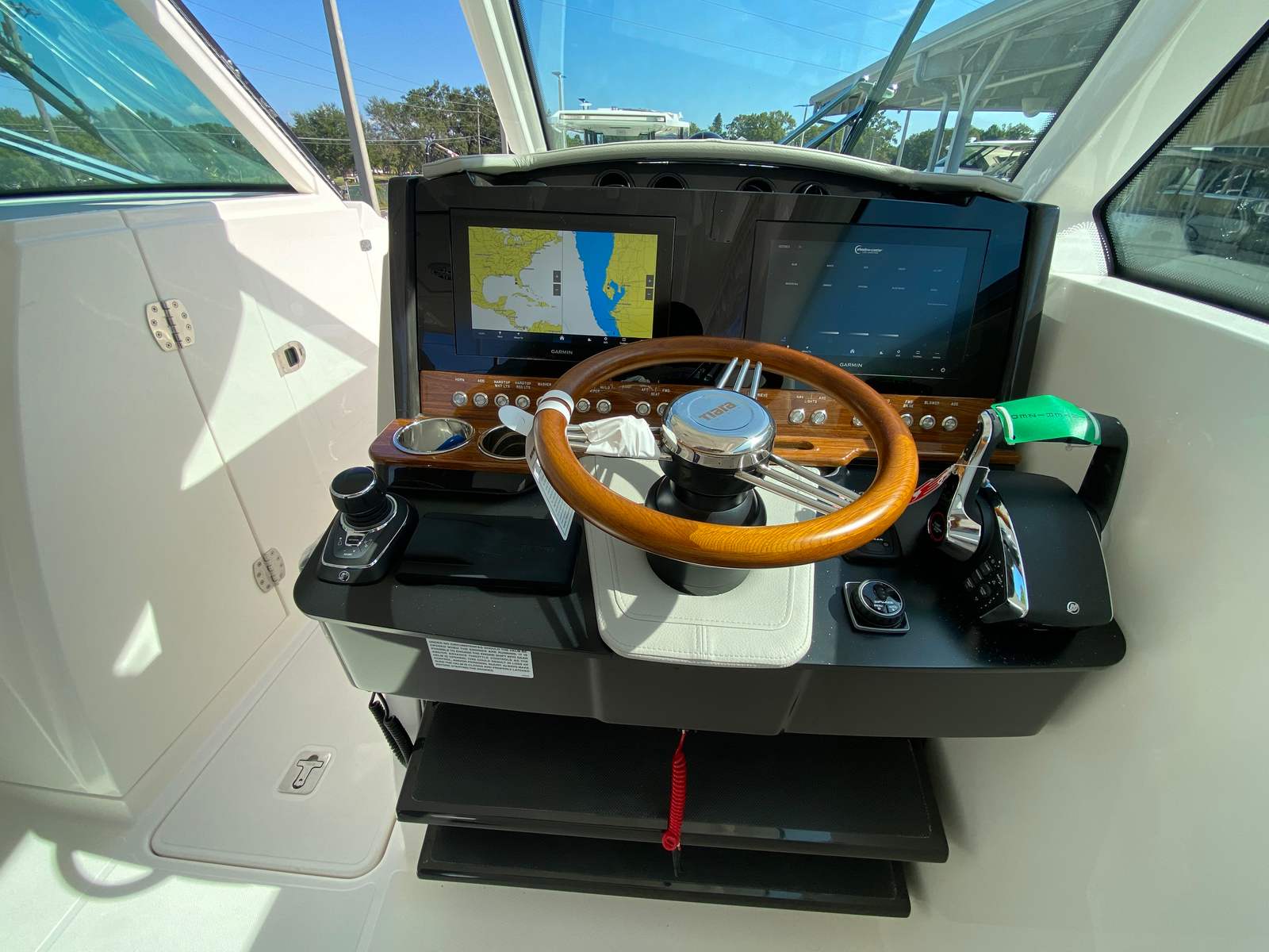 The Tiara Yachts 34 LX is loaded with premium features designed to enhance your boating experience. Enjoy the convenience and comfort of a generator and a Panda 5KW/6-gallon water heater, ensuring you have all the amenities needed for extended stays on the water. The Cool Helm Air Conditioning with Heat keeps the helm area comfortable in any weather, while the macerator waste system adds a layer of convenience for longer trips.Entertainment is at the forefront with a cockpit TV and the Tiara Premium Stereo System, perfect for hosting gatherings or enjoying a relaxing day with your favorite music. The Syn Teak Deck in the standard natural package adds a touch of elegance and durability, providing a luxurious feel underfoot. For those who love to soak up the sun, the forward manual Mediterranean-style sunshade offers the perfect retreat, while the drop curtain with side curtains in a natural finish provides protection from the elements when needed.Navigation is made effortless with the additional Garmin 12-inch display, offering advanced chart plotting and navigation capabilities to keep you on course. Every detail of the Tiara Yachts 34 LX is thoughtfully designed to maximize comfort, convenience, and enjoyment on the water.