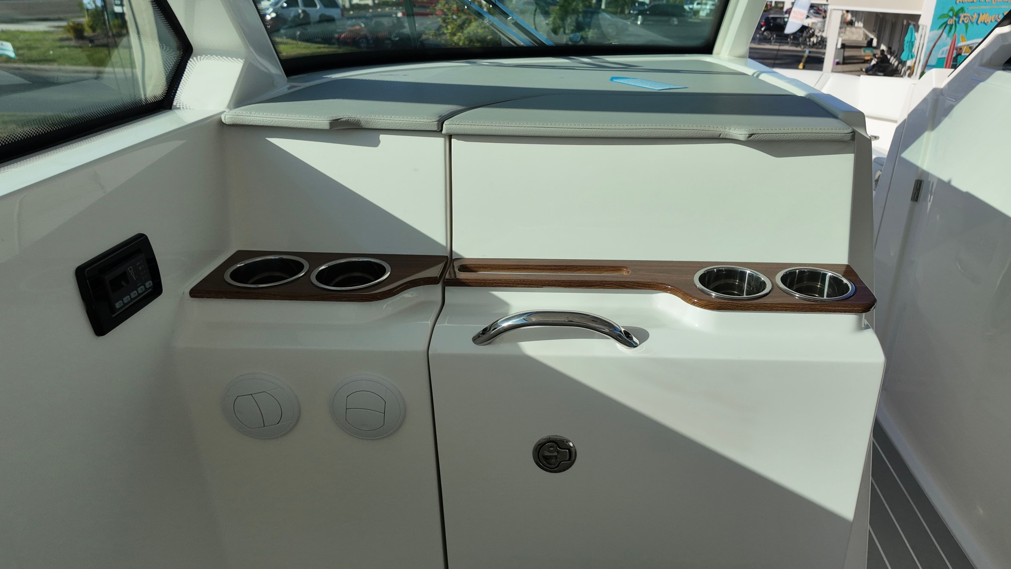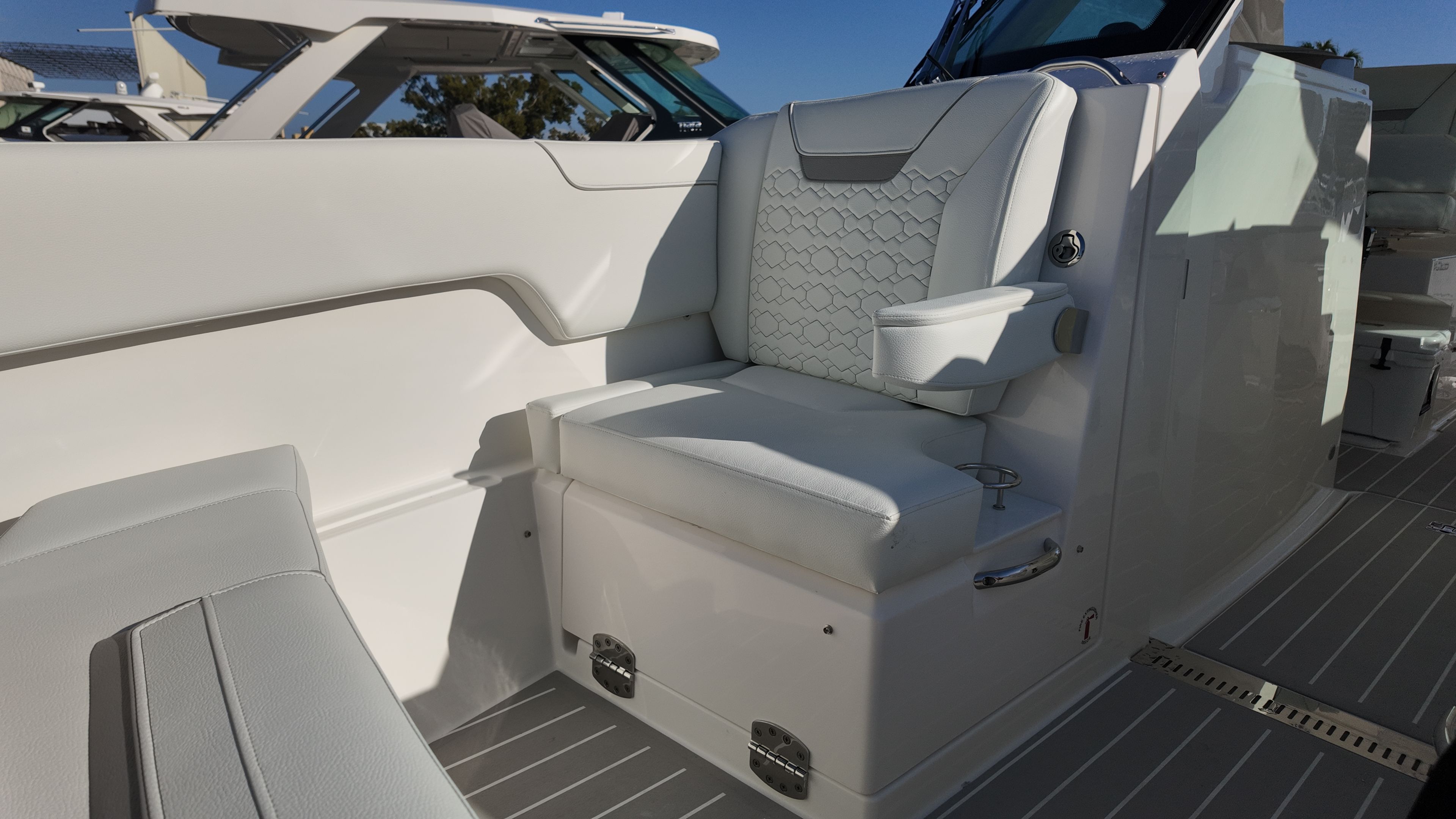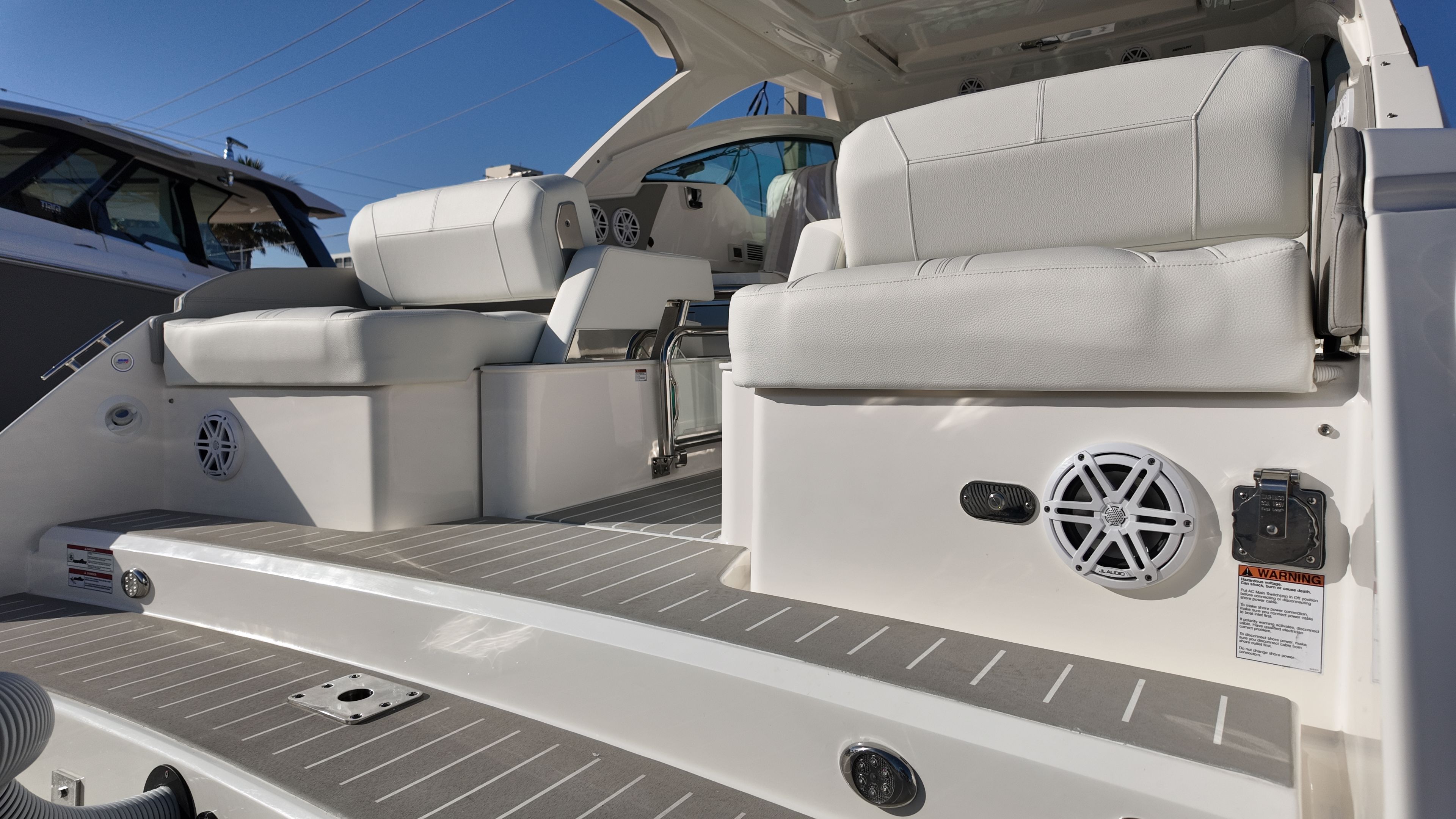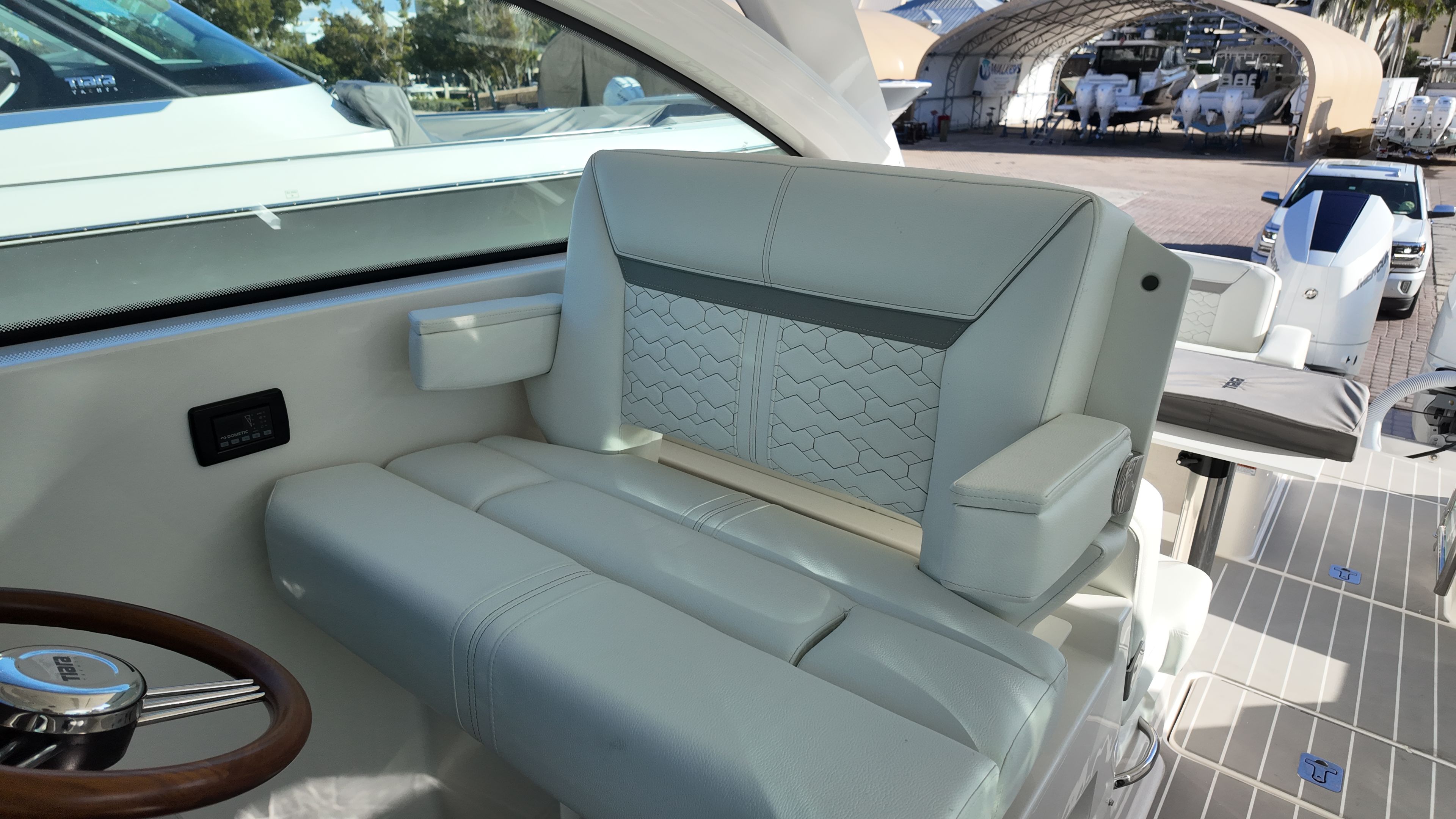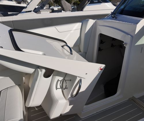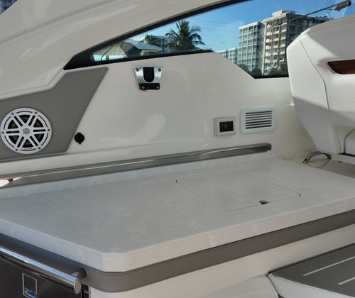 Practicality meets luxury in the Tiara Yachts 34 LX. The yacht’s efficient layout provides ample storage for gear, water toys, and personal belongings, making it easy to keep the deck clutter-free and organized. The raw water cockpit washdown simplifies cleaning after a day of fun, while the macerator waste system streamlines waste management for longer journeys. The generator and water heater support extended stays on the water, allowing you to enjoy all the comforts of home while exploring new destinations.Docking and maneuvering are effortless thanks to the advanced joystick piloting system, which provides precise control in tight spaces and challenging conditions. The synthetic teak deck is not only visually appealing but also easy to maintain, ensuring that your yacht remains in top condition with minimal effort. These practical features make the 34 LX an ideal choice for boaters who value convenience as much as luxury.