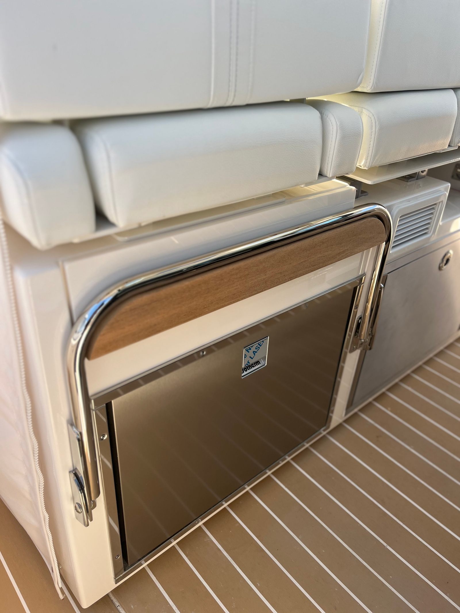 - Synthetic Teak Decking on Aft Cockpit, Starboard Walkway, Bow Area, Port Side Boarding Step and Swim Platform