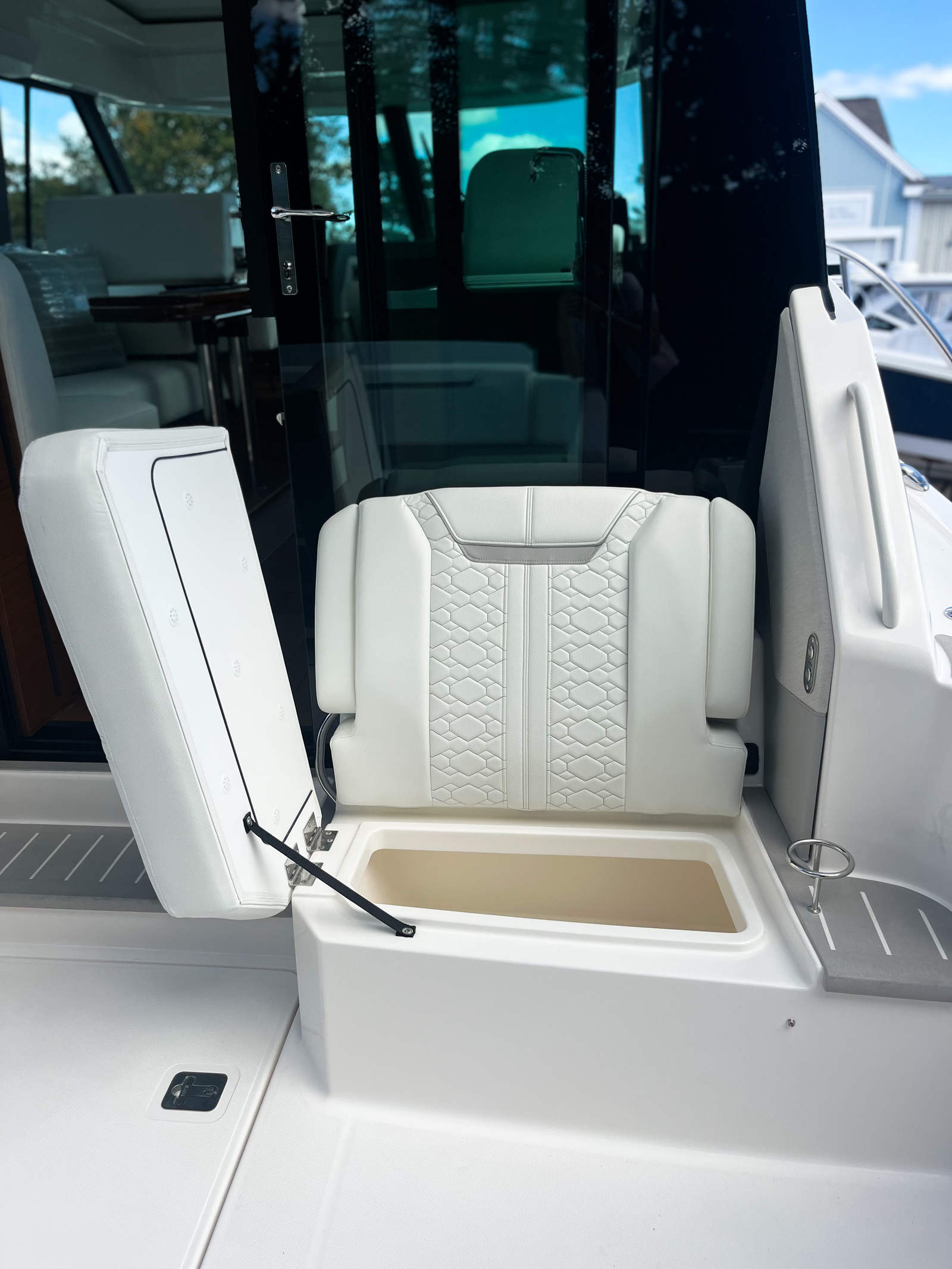 The 2026 Tiara Yachts 43 LE is packed with innovative features and premium amenities that set it apart from other yacht boats for sale. Among its standout features are the twin Mercury 600 V12 Verado outboard engines, which offer unmatched performance and reliability. The oil changer for the generator streamlines maintenance, while the ElectroSea Strainer ensures your systems run smoothly by keeping debris at bay. The head macerator system adds convenience and efficiency to onboard living.For those who value stability and comfort, the Seakeeper SK6 Gyro is a game-changer, dramatically reducing roll and providing a smooth ride even in choppy waters. The lounge module creates a versatile and inviting space for relaxation and socializing, while four gunwale rod holders (two port and two starboard) make this yacht ideal for fishing enthusiasts. The synthetic teak decking on the port side terrace and accents throughout the yacht add a touch of elegance and durability, perfectly complementing the Platinum Grey with white lines exterior.Additional features include a refrigerated cooler box for keeping refreshments chilled and a cockpit TV for entertainment, ensuring that every moment onboard is enjoyable and convenient.