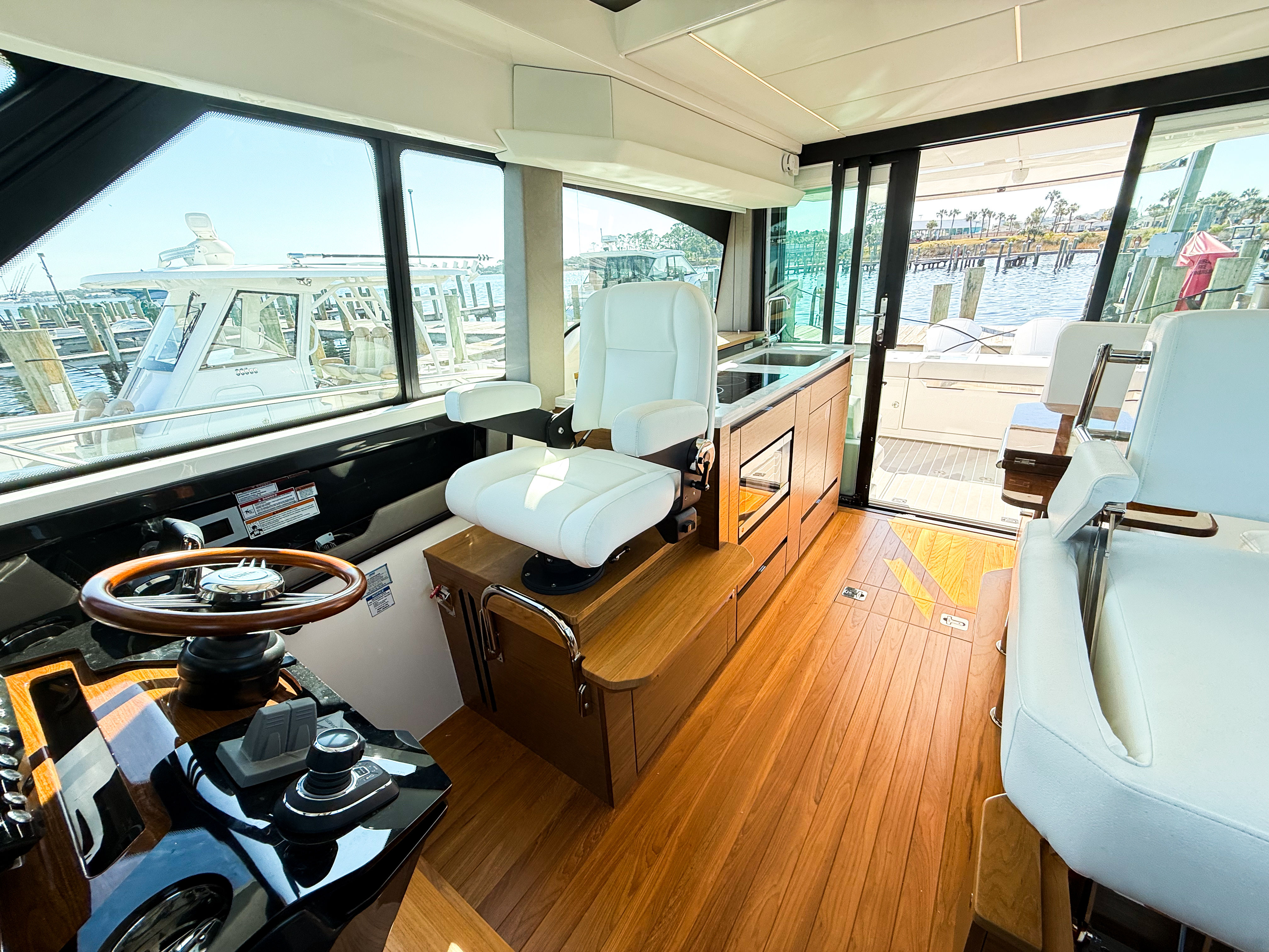 The 2025 Tiara Yachts 43 LE is packed with premium features that set it apart from other yacht boats for sale. The Seakeeper SK6 Gyro stabilizer ensures a remarkably smooth experience on the water by minimizing roll, providing unmatched comfort for you and your guests. The electric fold-down antennas and navigation light offer convenience and a streamlined profile, while the Garmin 48" Fantom Open Array Radar and additional Garmin 16" display deliver cutting-edge navigation and situational awareness.For those who appreciate luxury finishes, the yacht boasts a teak steering wheel in lieu of the standard option, and solid surface interior and exterior finishes in Aurora Andria, creating a refined and inviting atmosphere. Entertaining is effortless with the refrigerated cooler box and freezer with ice maker, ensuring your favorite refreshments are always at hand. The aft-facing seat provides a perfect spot to relax and take in the views, whether you are anchored in a quiet cove or cruising with friends.