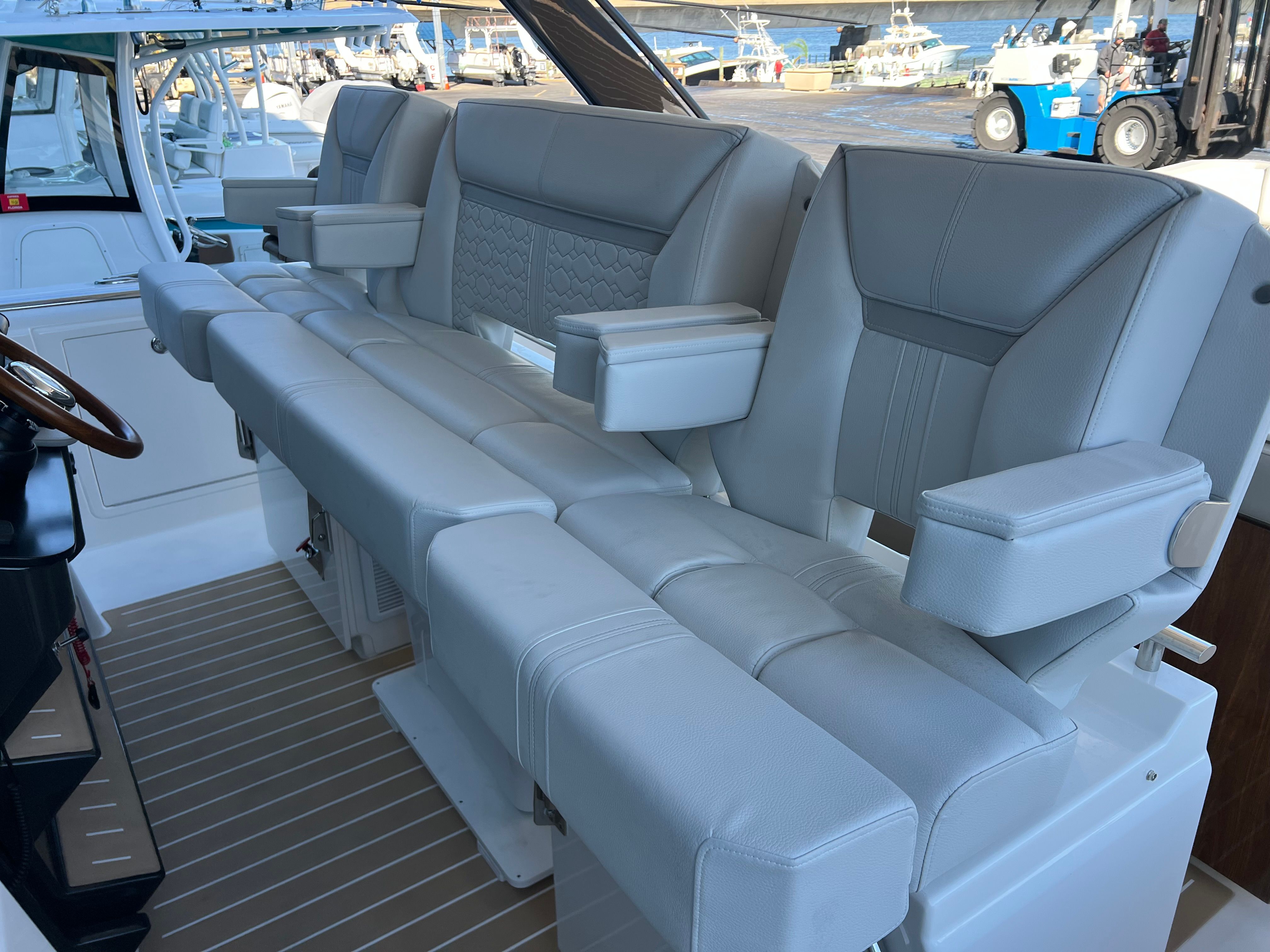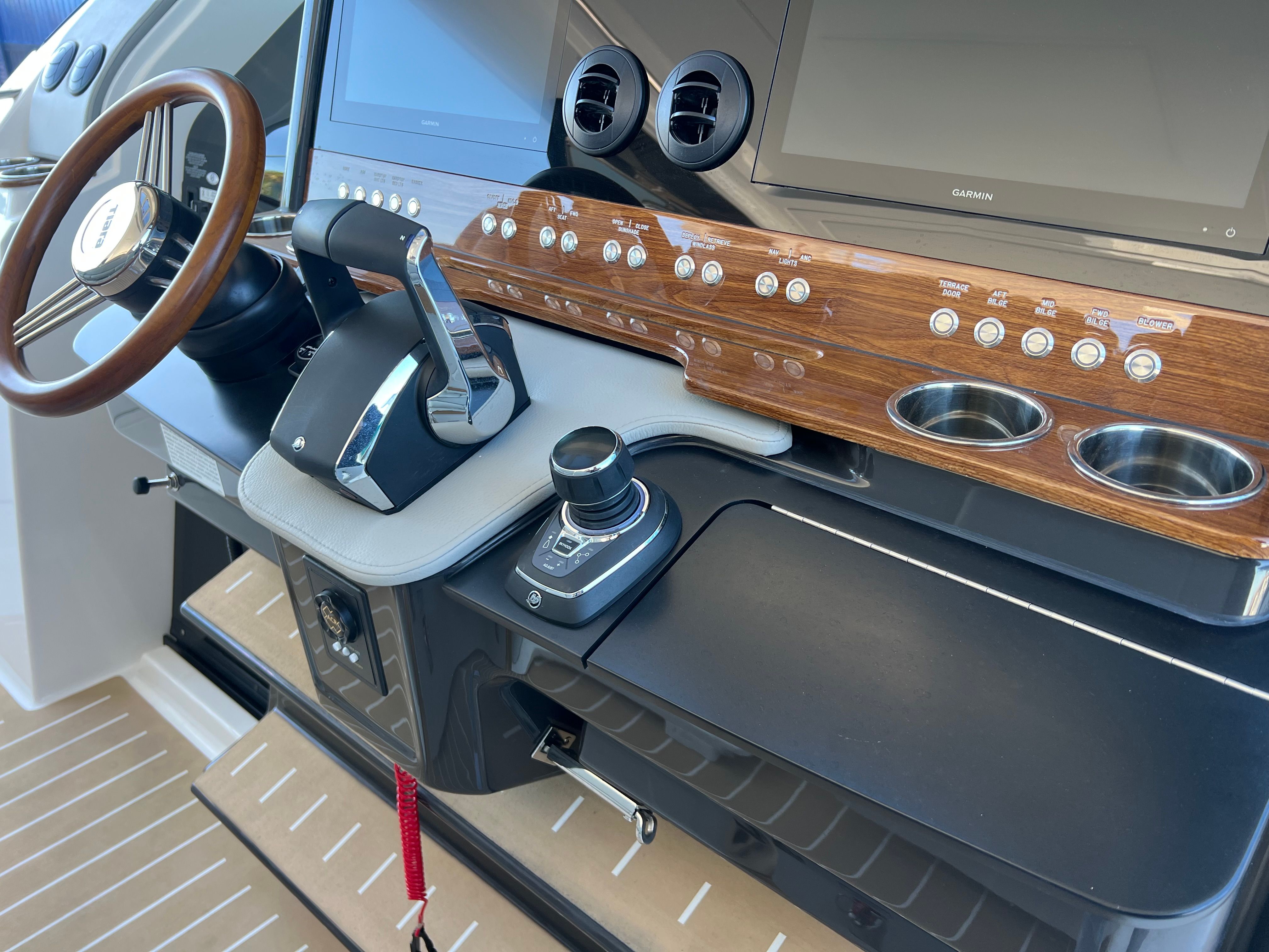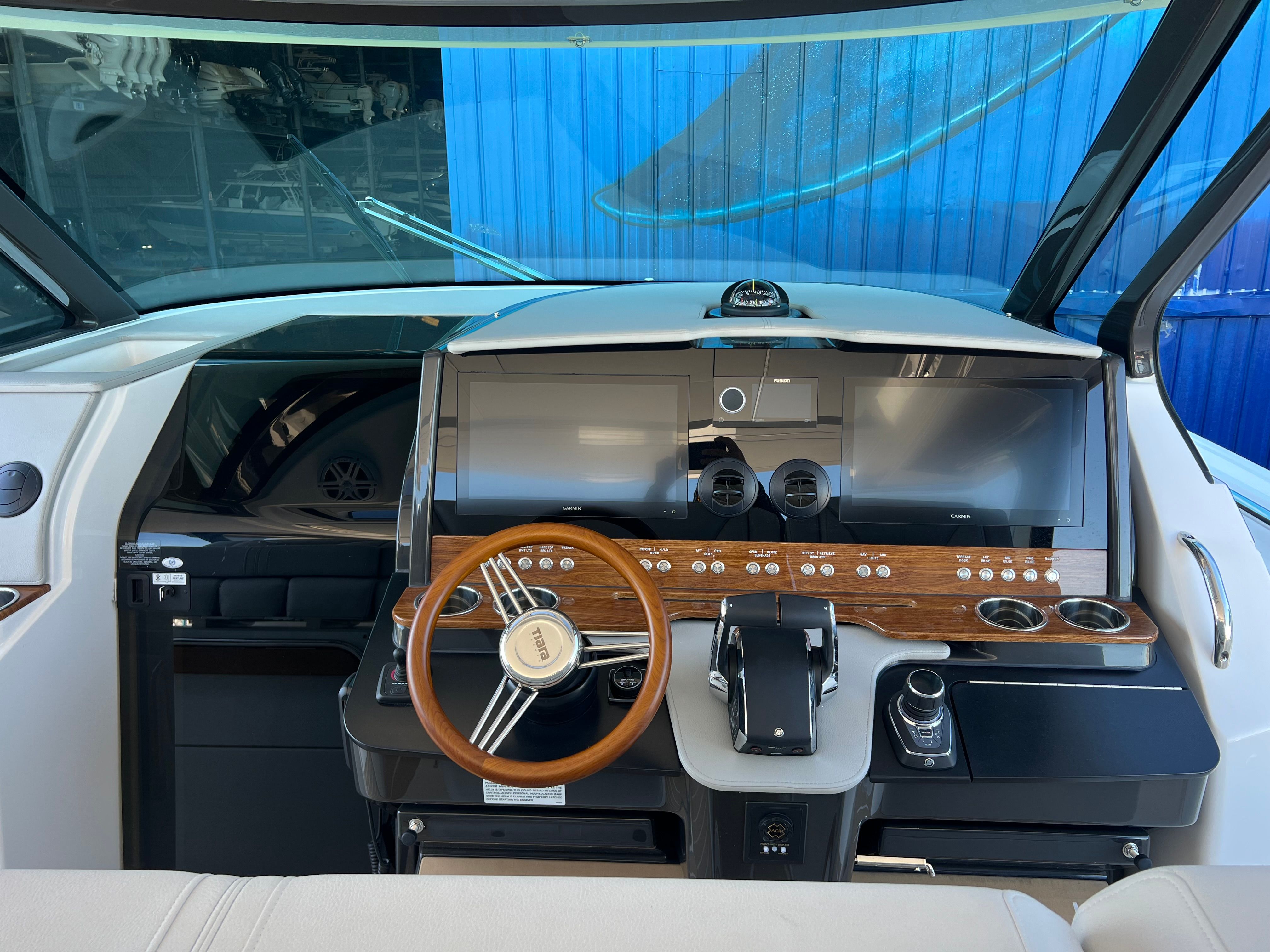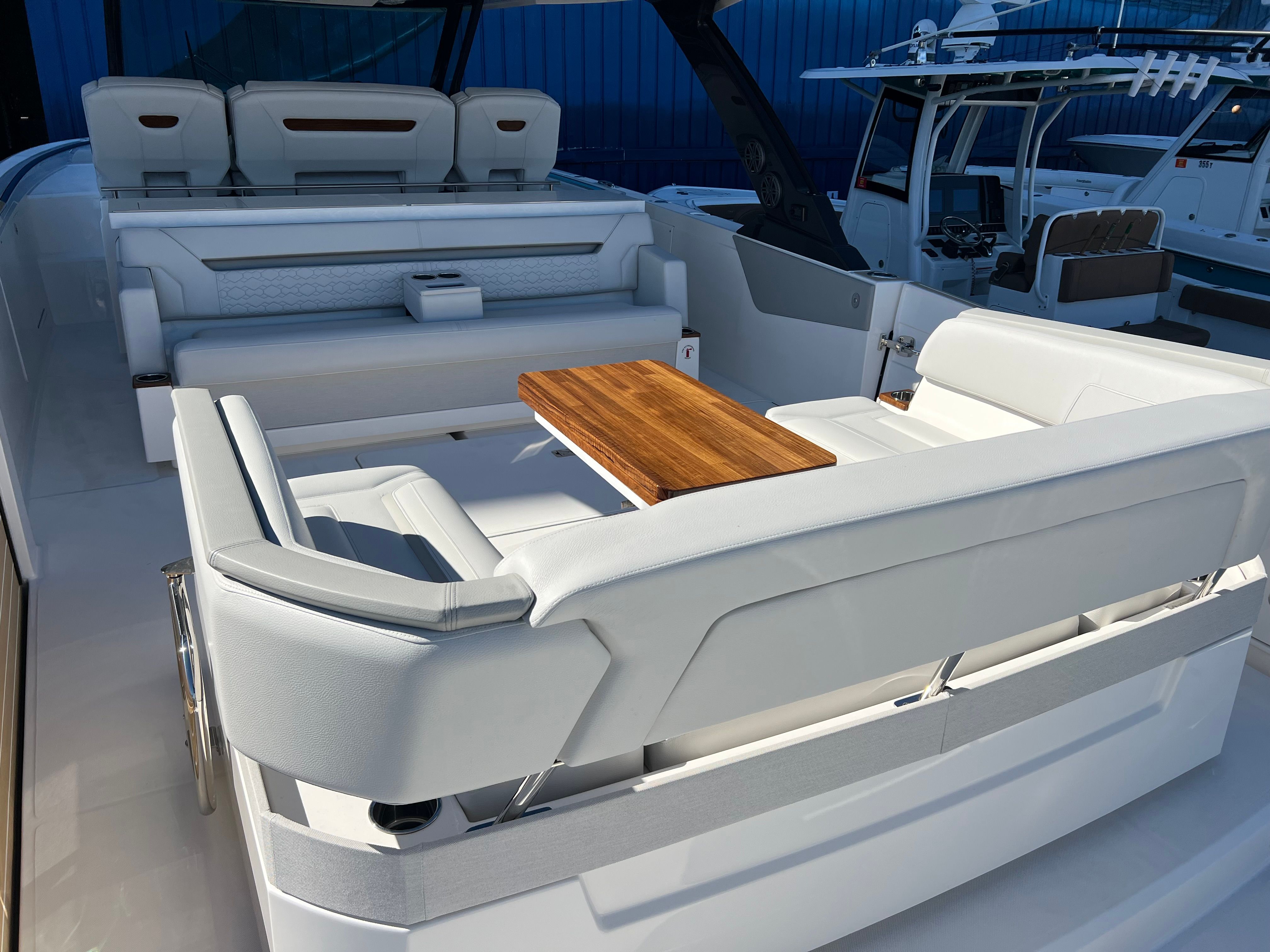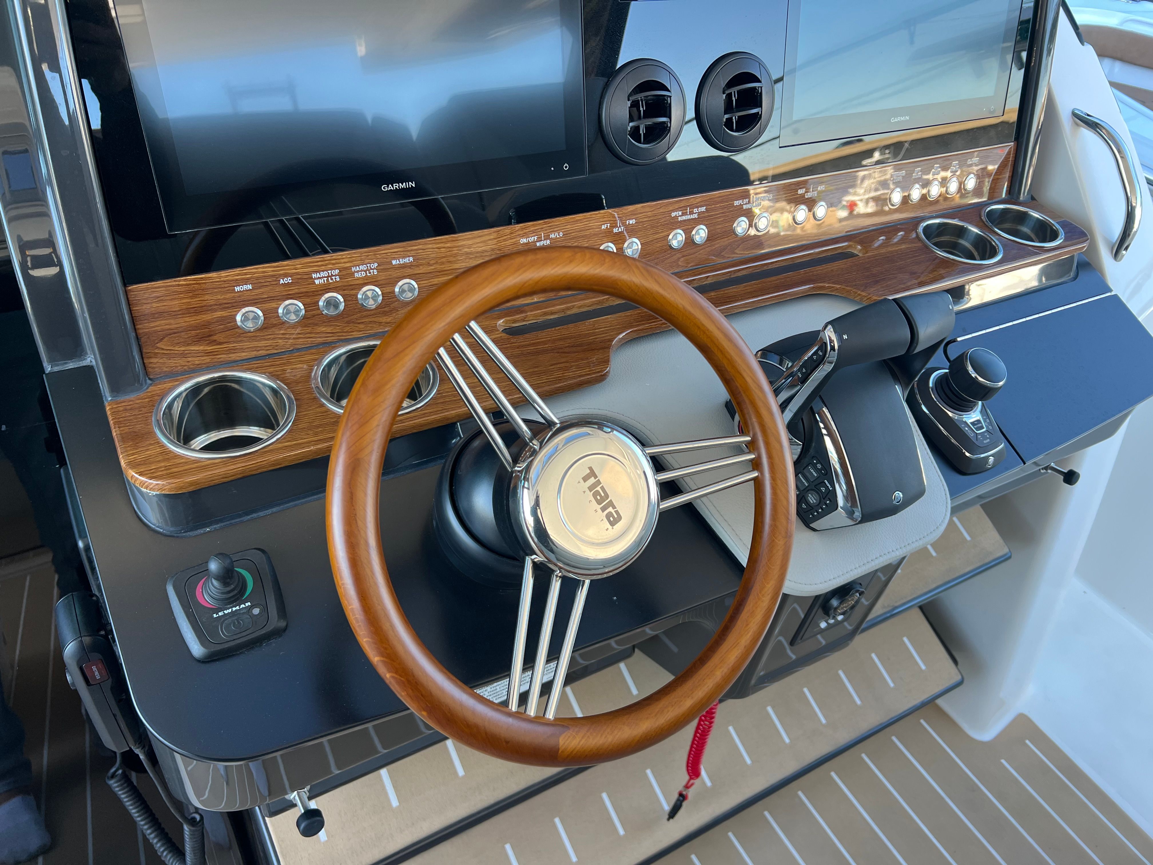The Tiara Yachts 43 LS is as practical as it is luxurious. The synthetic teak deck offers the beauty of traditional teak with the added benefit of easy maintenance and durability. The yacht’s layout is designed for convenience, with ample storage for gear, water toys, and personal items. Docking is made easier with the intuitive joystick piloting system, allowing for precise maneuvering in tight spaces.Fuel efficiency is enhanced by the advanced Mercury V12 engines, allowing you to enjoy longer trips with fewer stops. The integration of modern navigation and communication systems ensures you are always in control, whether you are exploring new destinations or returning to your favorite harbor. The rod holders in the gunnels make this yacht a great choice for fishing enthusiasts, while the lounge module and sunshade cater to those who prefer relaxation and leisure.