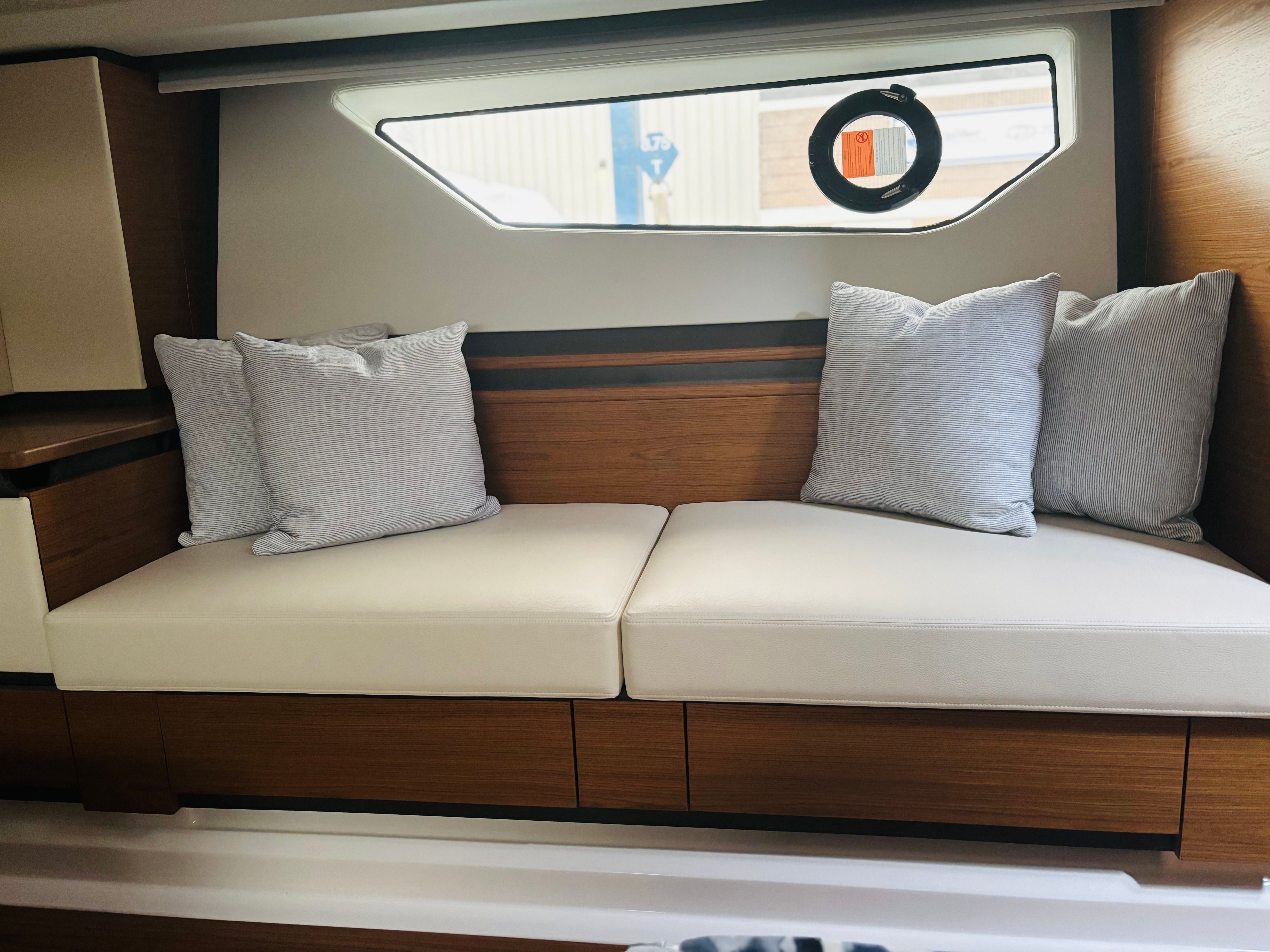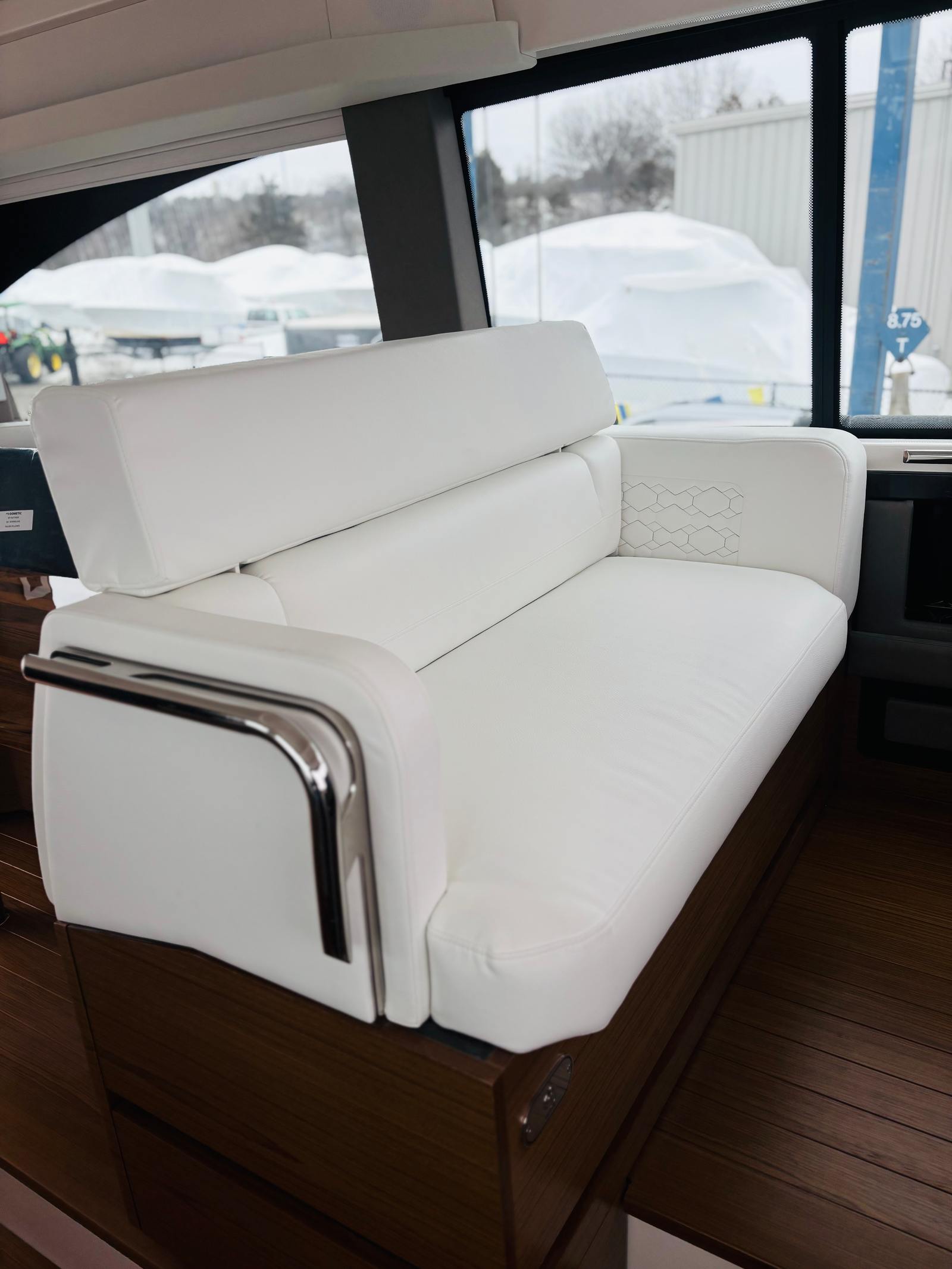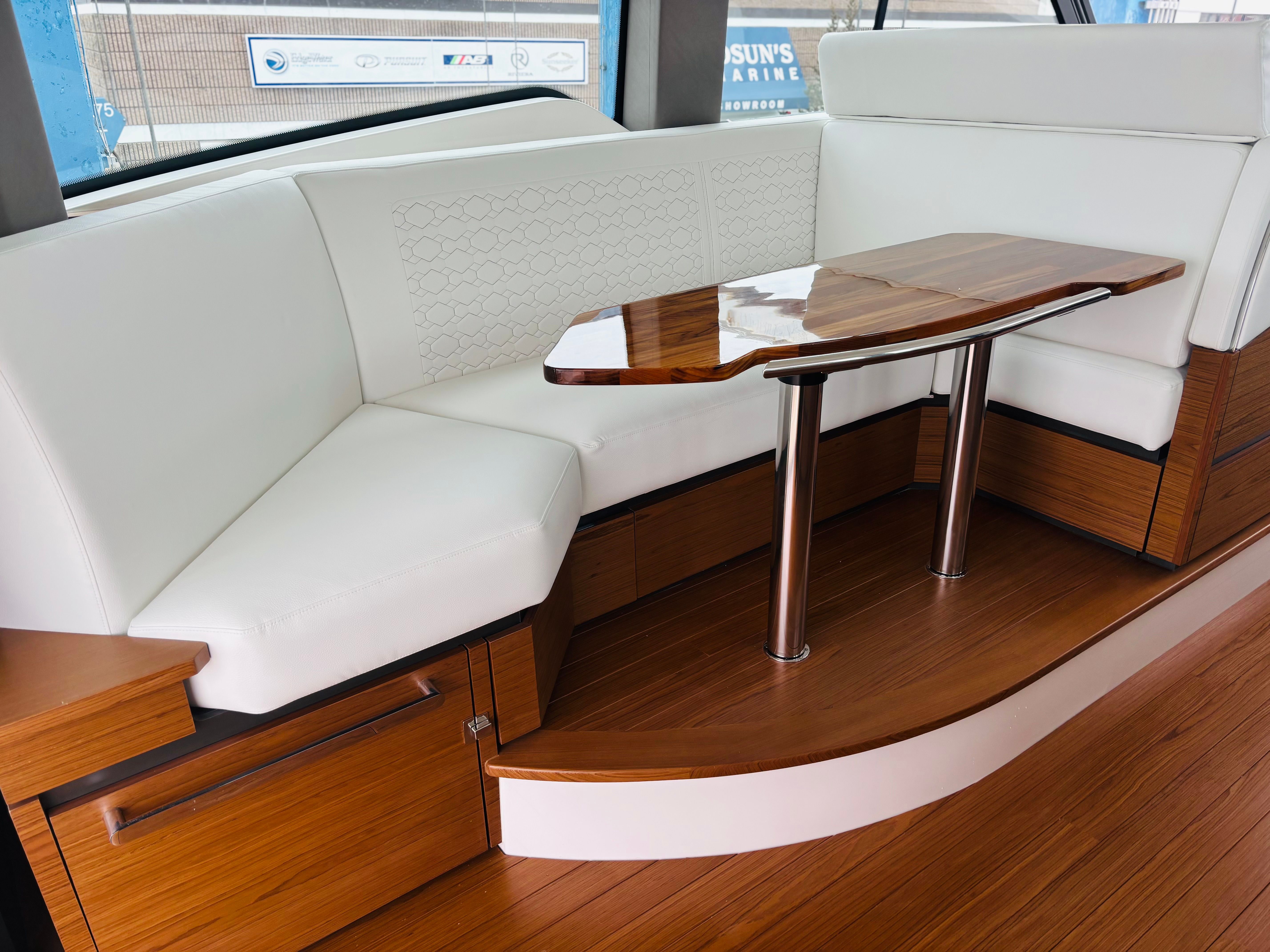 The Tiara Yachts 48 LE is packed with premium features designed to elevate your boating experience. The inverter and oil changer for the generator add convenience and efficiency, while the all chain windlass with remote at the helm simplifies anchoring operations. The head macerator system ensures easy waste management, contributing to a cleaner and more enjoyable onboard environment. Fishing enthusiasts will appreciate the three gunwale rod holders—two port and one starboard—providing dedicated space for gear and tackle. The synthetic teak decking on the terrace, finished in natural tones with white lines, adds a touch of elegance and durability to the outdoor living area. The LOUNGE MODULE creates a welcoming space for relaxation and socializing, making every moment on board a pleasure.