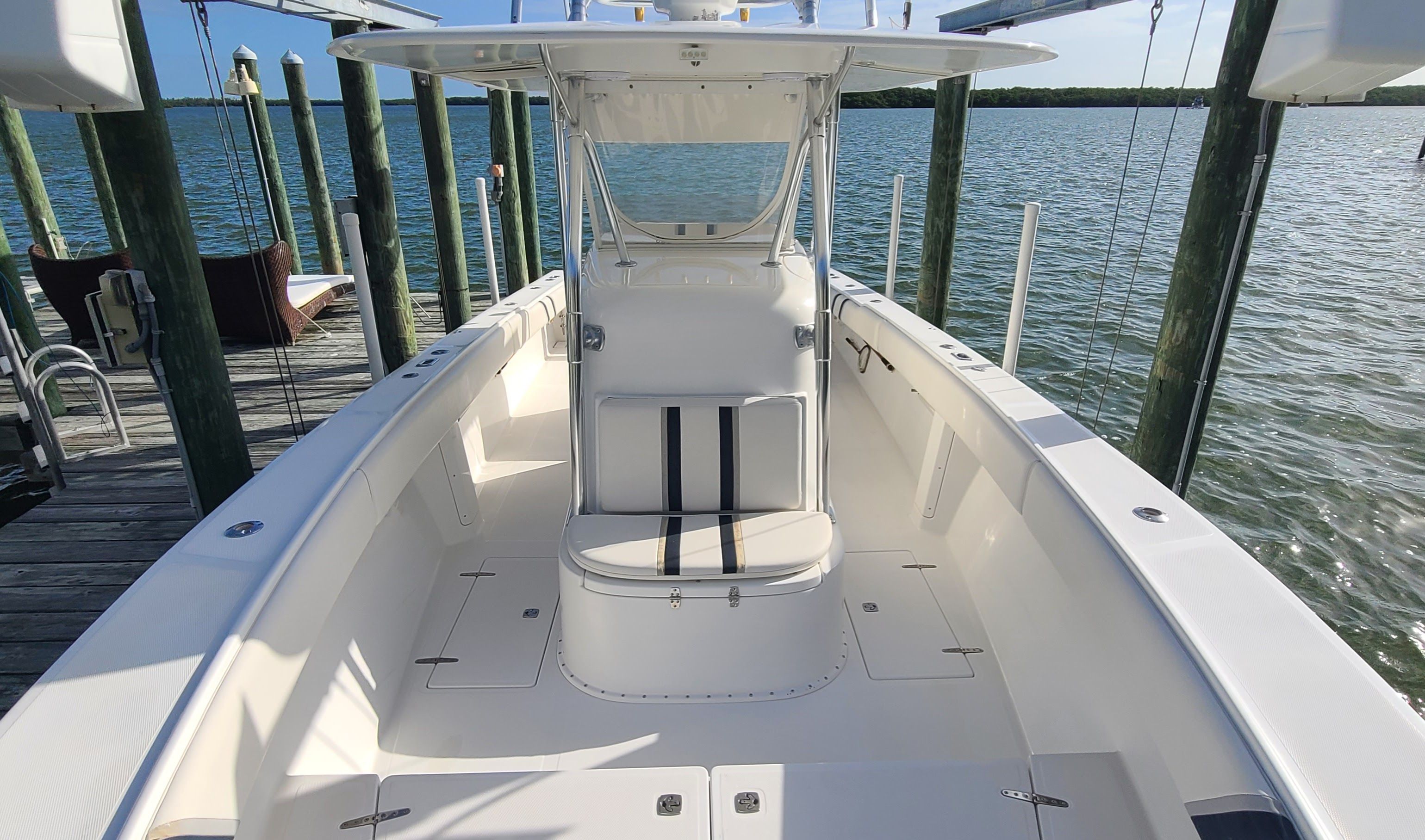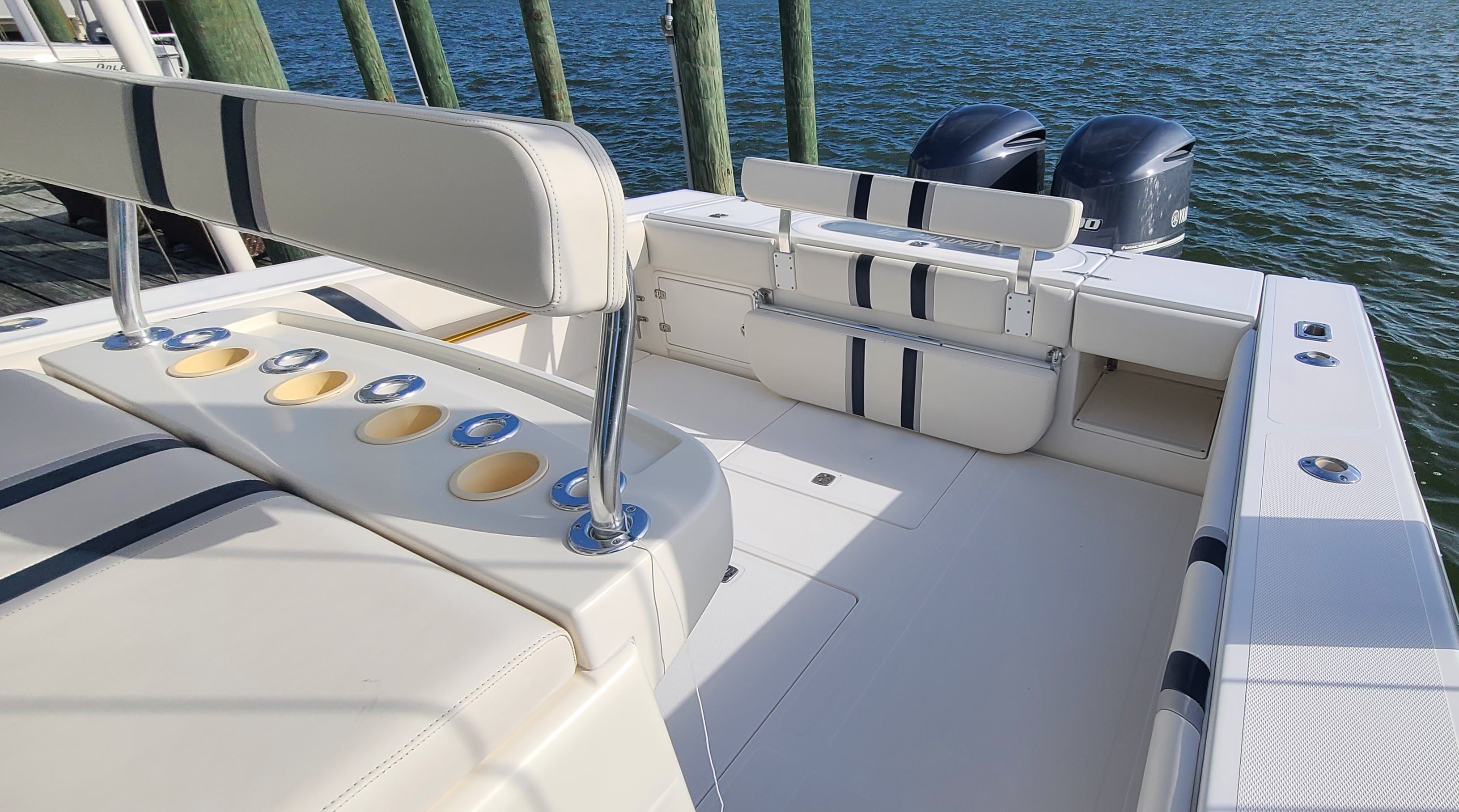 The Venture 34 CC is as practical as it is enjoyable. Its Center Console design makes storage and organization simple, with dedicated spaces for gear, tackle, and personal items. The twin engines not only deliver impressive performance but also contribute to ease of docking and maneuvering in tight spaces. Fuel efficiency is enhanced by the modern engine technology, allowing you to spend more time on the water and less time at the fuel dock.This used Center Console boat is also easy to maintain, thanks to its quality construction and accessible systems. Whether you are trailering to a new destination or keeping the boat in a marina, the Venture 34 CC is designed for hassle-free ownership. The robust build and reliable engines ensure that you can focus on enjoying your time on the water, rather than worrying about maintenance or repairs.